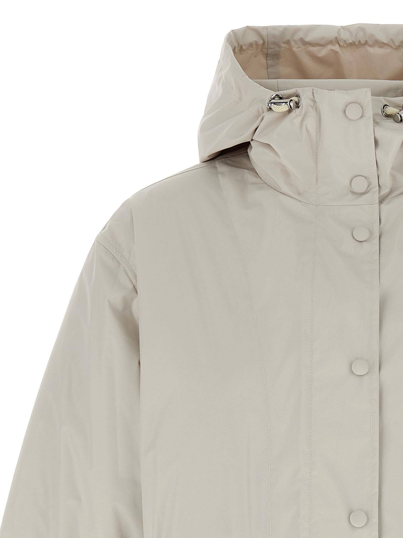 Водовідштовхувальна нейлонова парка 2 в 1, капюшон, застібка на блискавці та кнопках, шнурок на талії та на низу, кишені, довгі рукави. Знімна стьобана внутрішня куртка з застібкою на кнопках, круглий виріз, кишені, довгі рукави.