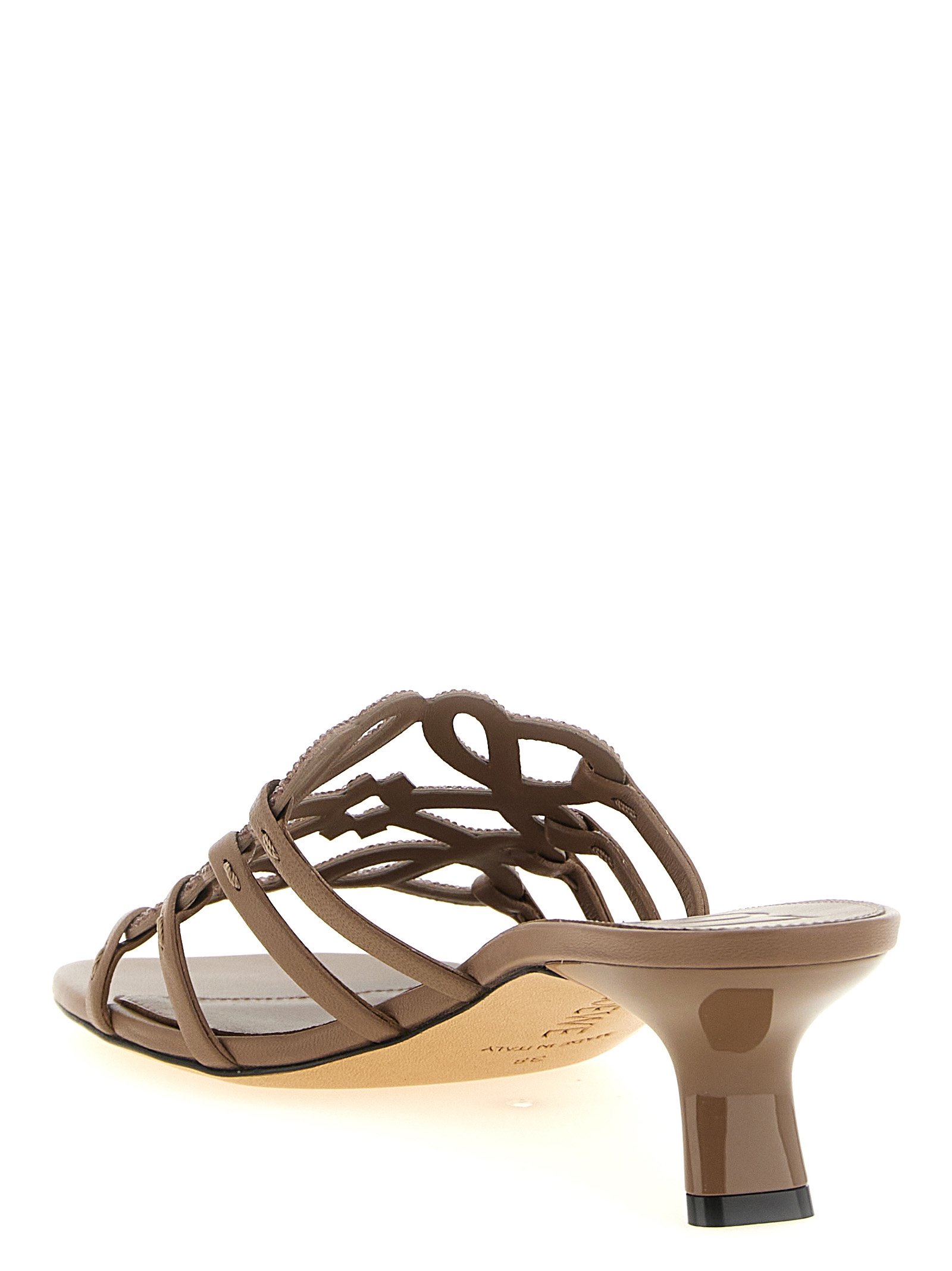 'Anagram Petal' шльопанці зі шкіри, перфорований візерунок Anagram на верхній частині з кристальною аплікацією, ручне фарбування крайок і ручне прошивання, прошита м’яка шкіряна устілка, підбори, шкіряна підошва з вбудованою гумовою вставкою.
