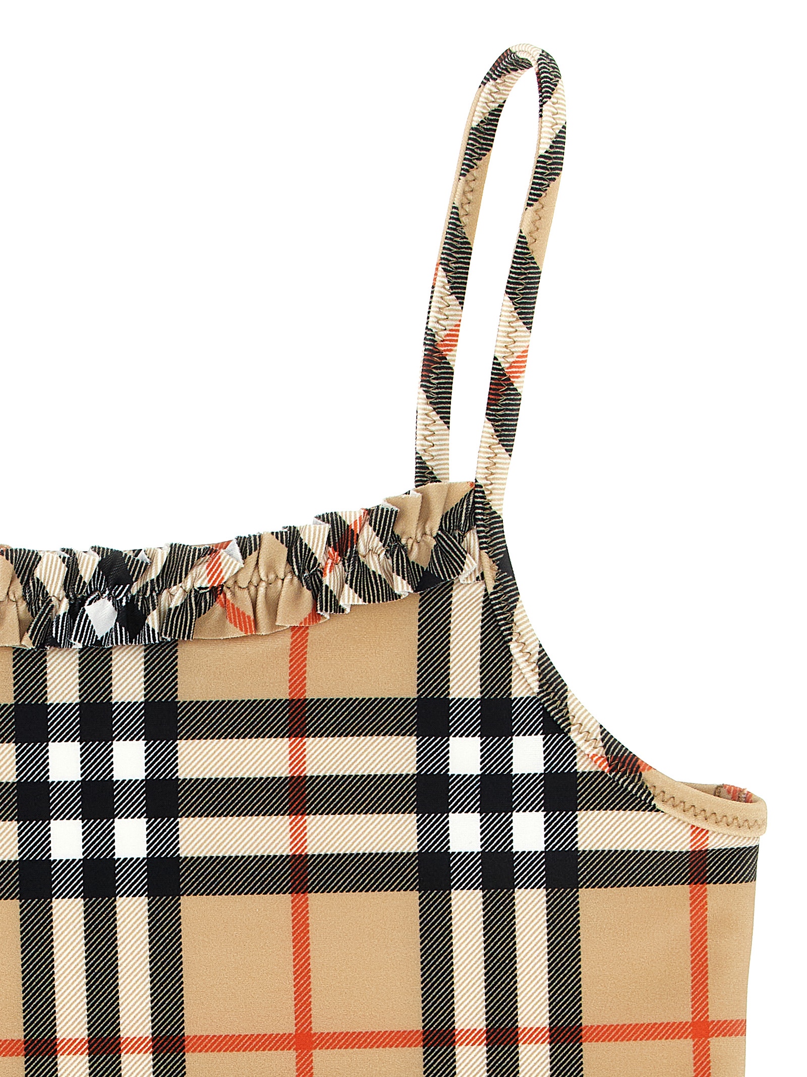 ДІТИ Бікіні з еластичного нейлону Babette з візерунком Burberry Check з рюшами, що складається з спортивного топа з квадратним вирізом, тонкими бретелями та класичними плавками.