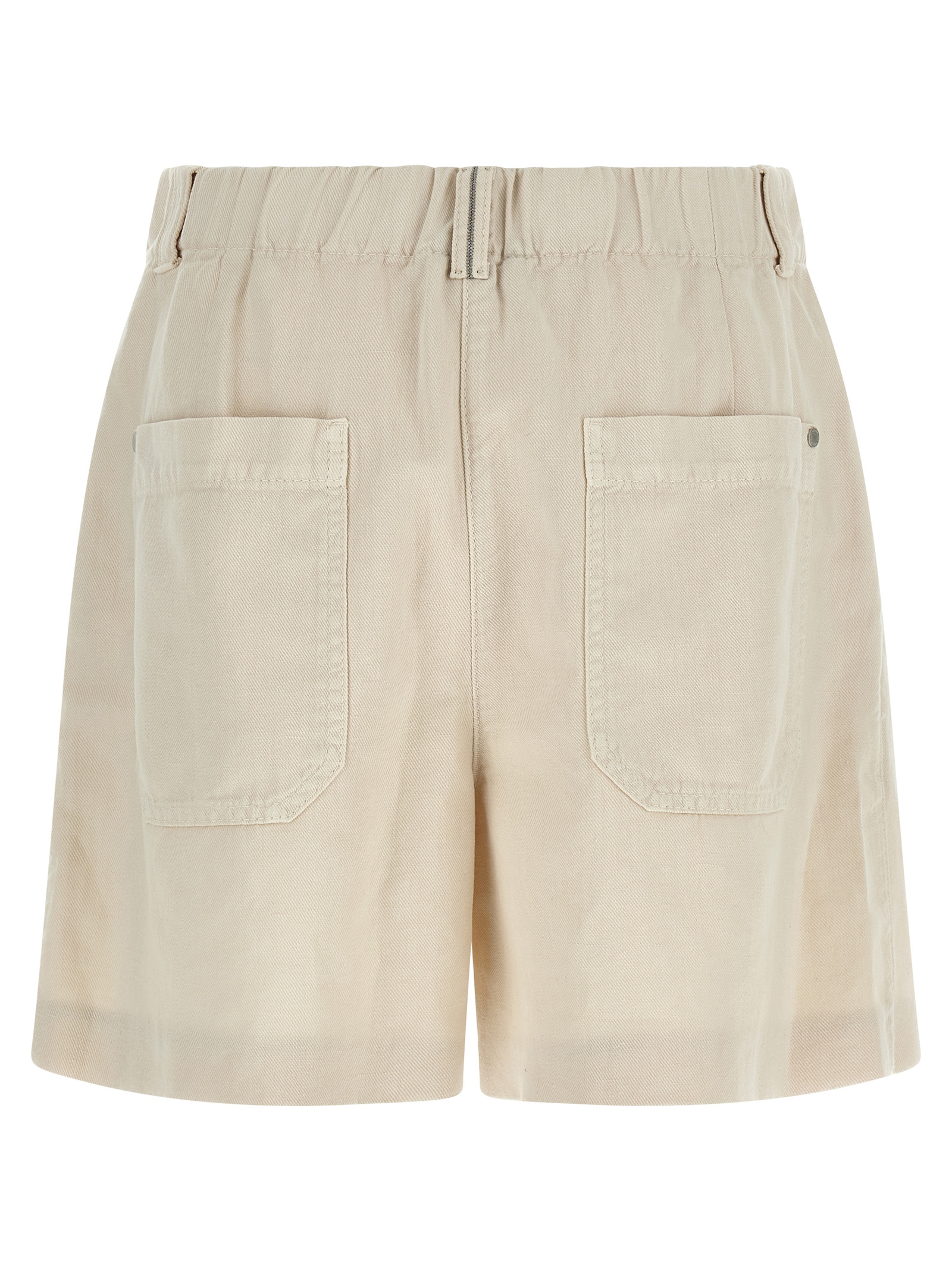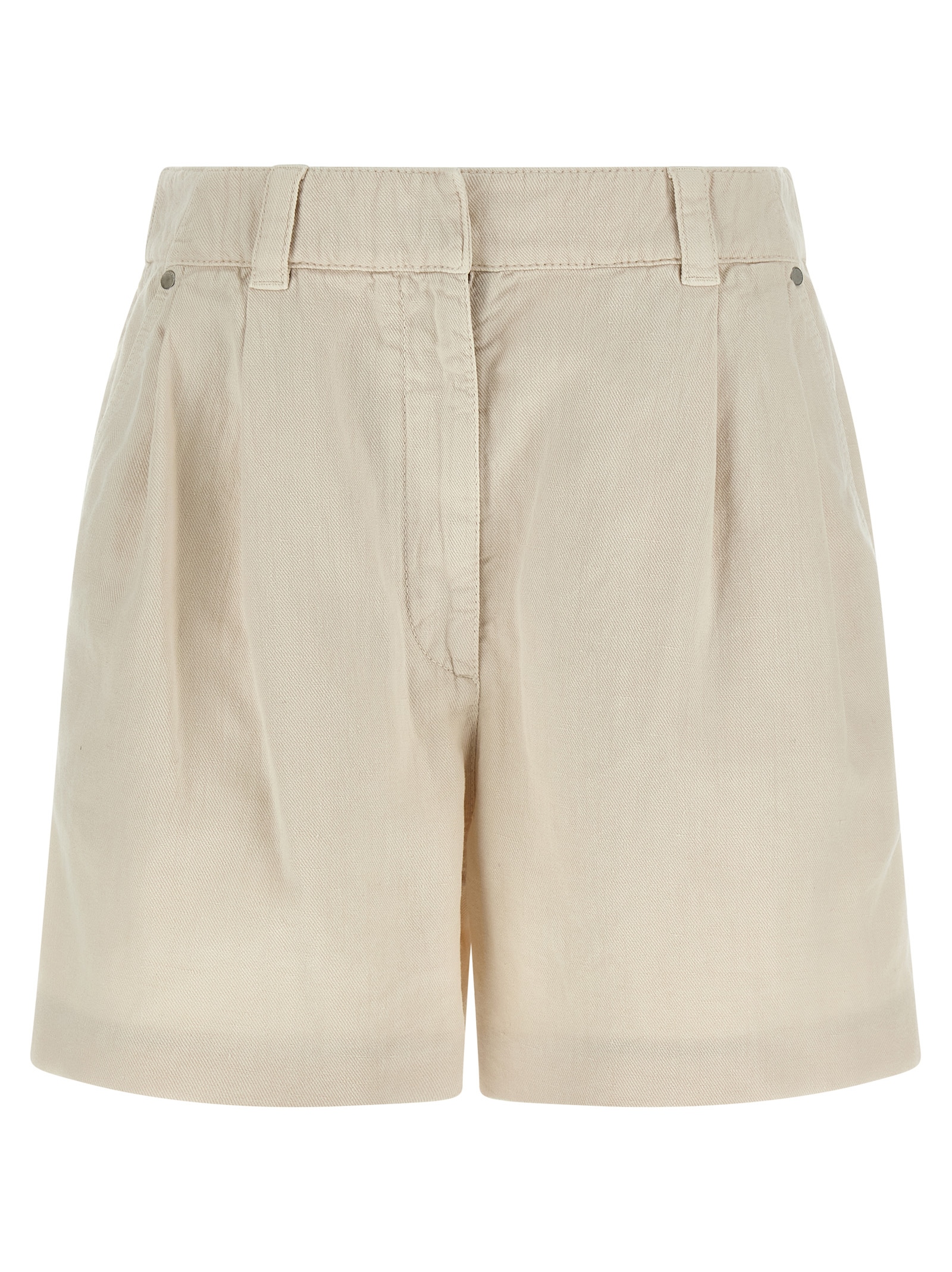 'Baggy' шорти з бавовняної та льняної тканини, подвійні плісировки, застібка на гачок та блискавку спереду, кишені, широкі штанини, деталь моніле ззаду.