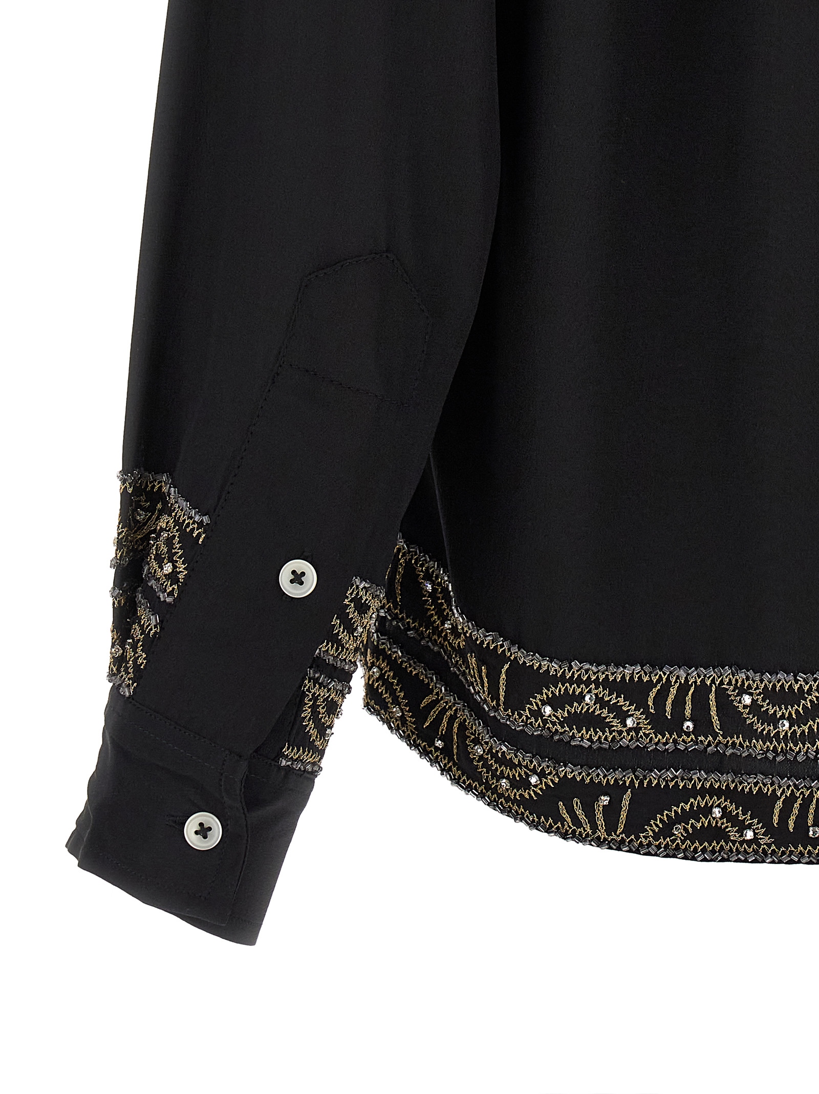 Шовкова сорочка 'Beaded Epoque' з кристалевими стразами та золотою вишивкою, передня застібка на ґудзики, довгі манжетні рукави.