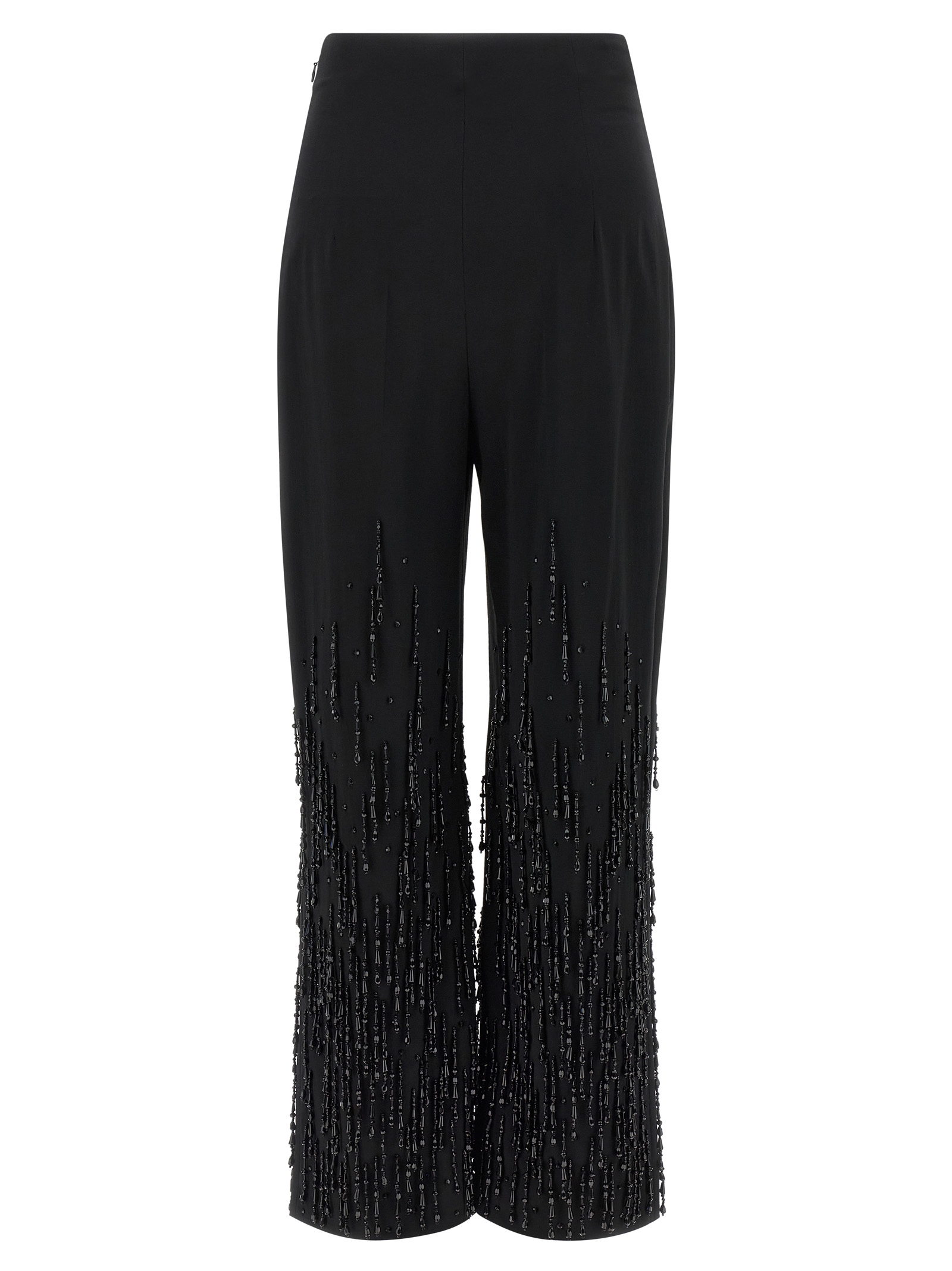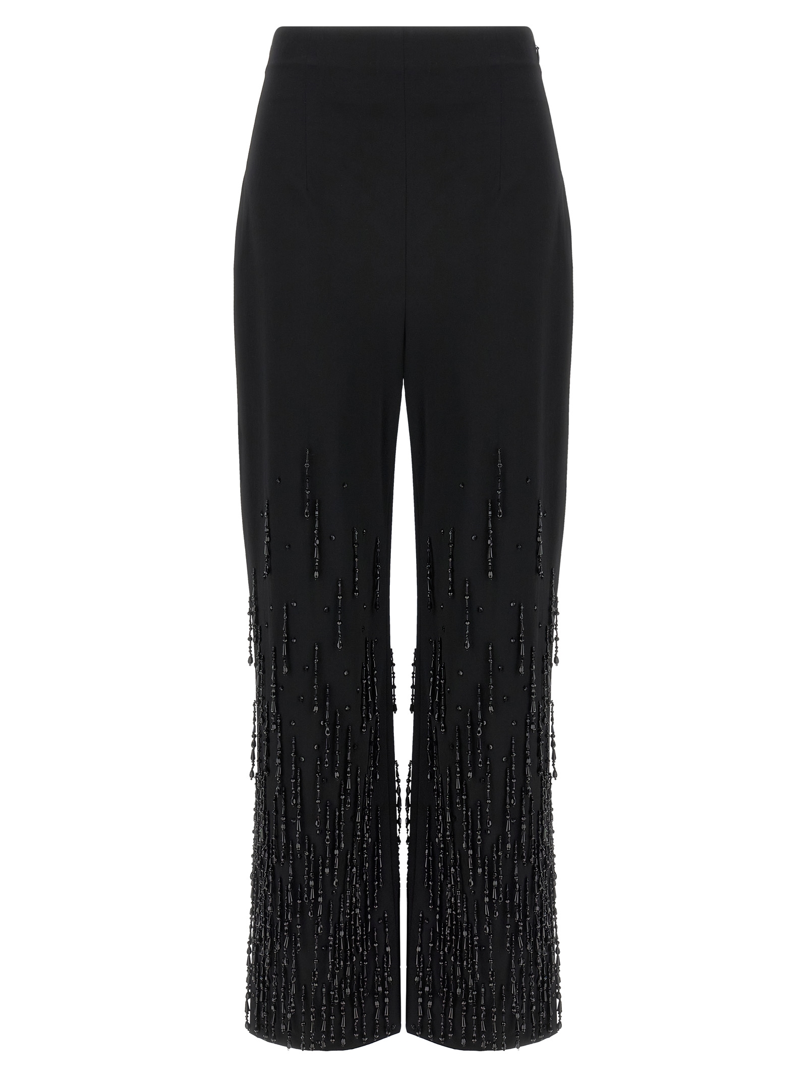 Еластичні вовняні штани, висока талія, прихована бічна застібка на блискавці, трохи широкі прямі ноги з бісерною деталлю.