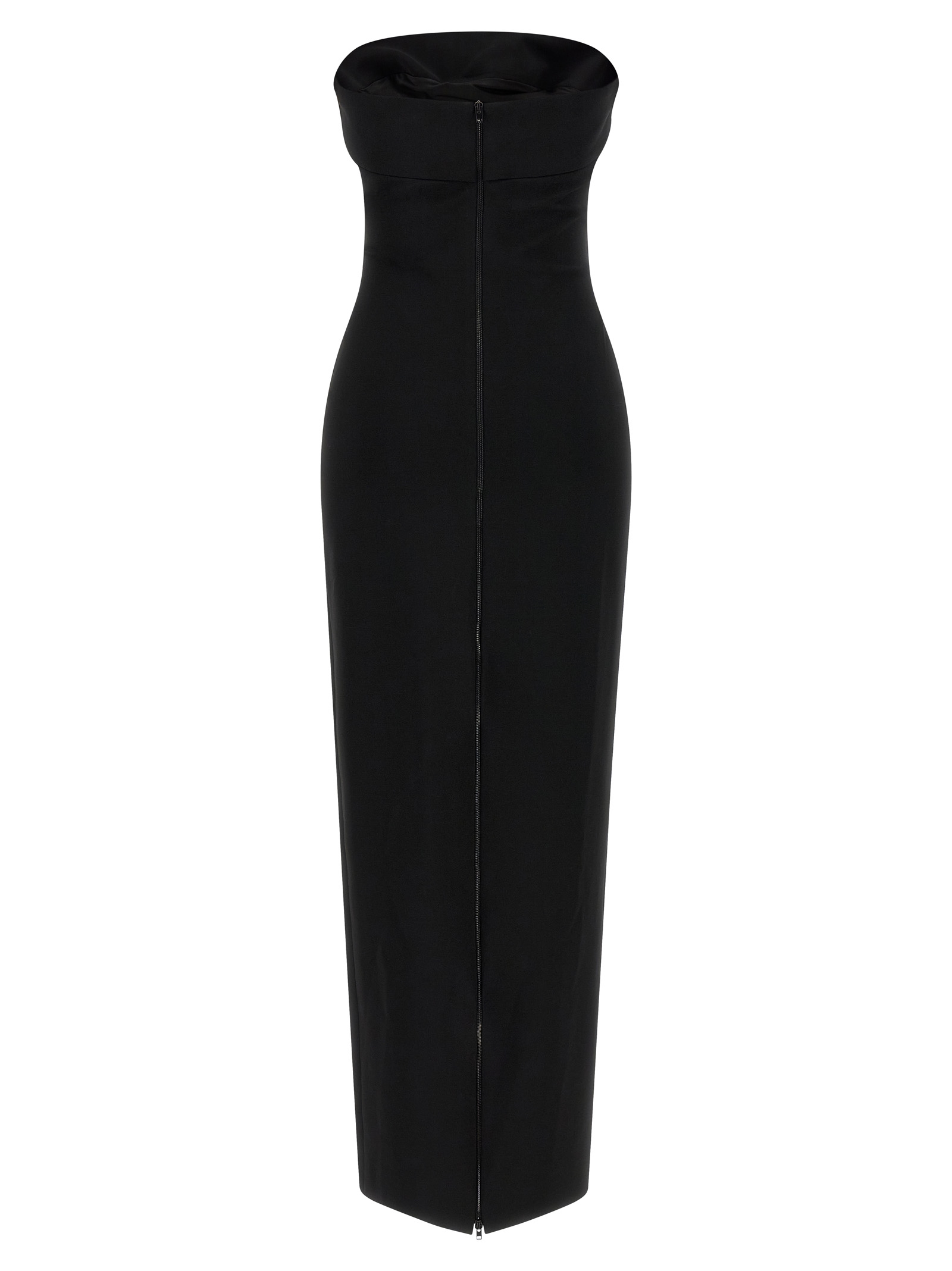Максі-сукня, сукня-футляр з корсетами, деталь з поясом з великим золотим металевим пряжкою, задня застібка на блискавці, без рукавів.