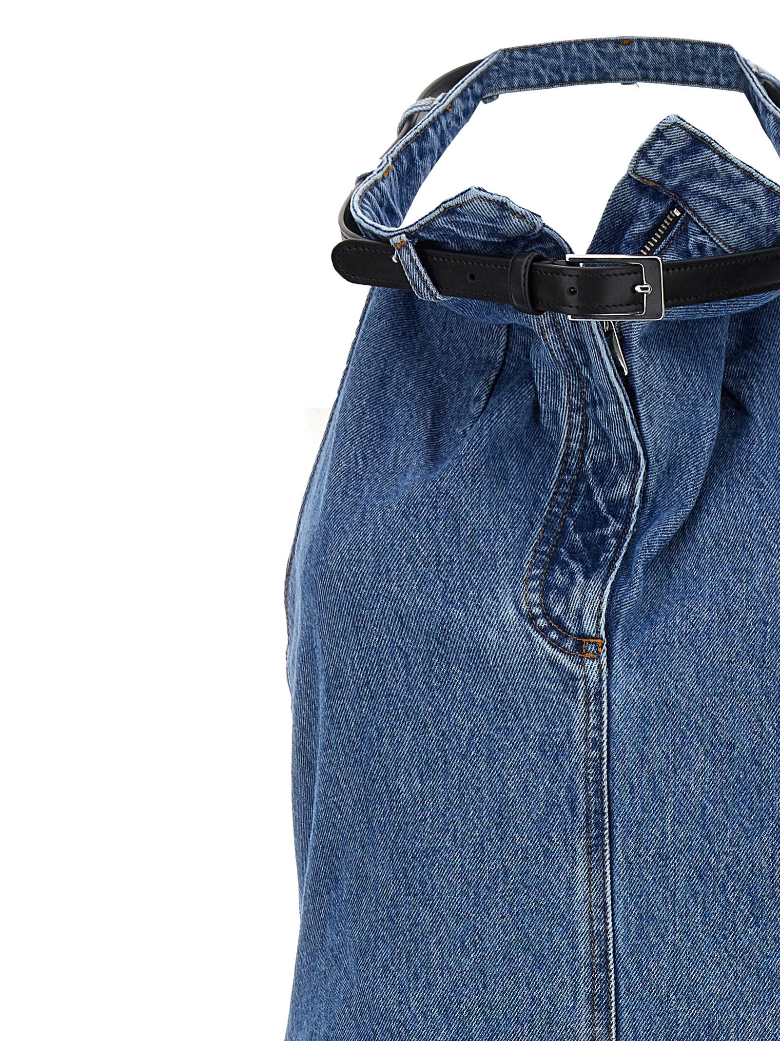 'Belt Halter Neck' безрукавна сукня з бавовняного деніму з шкіряним поясом навколо шиї, V-подібний виріз з деталлю на блискавці.