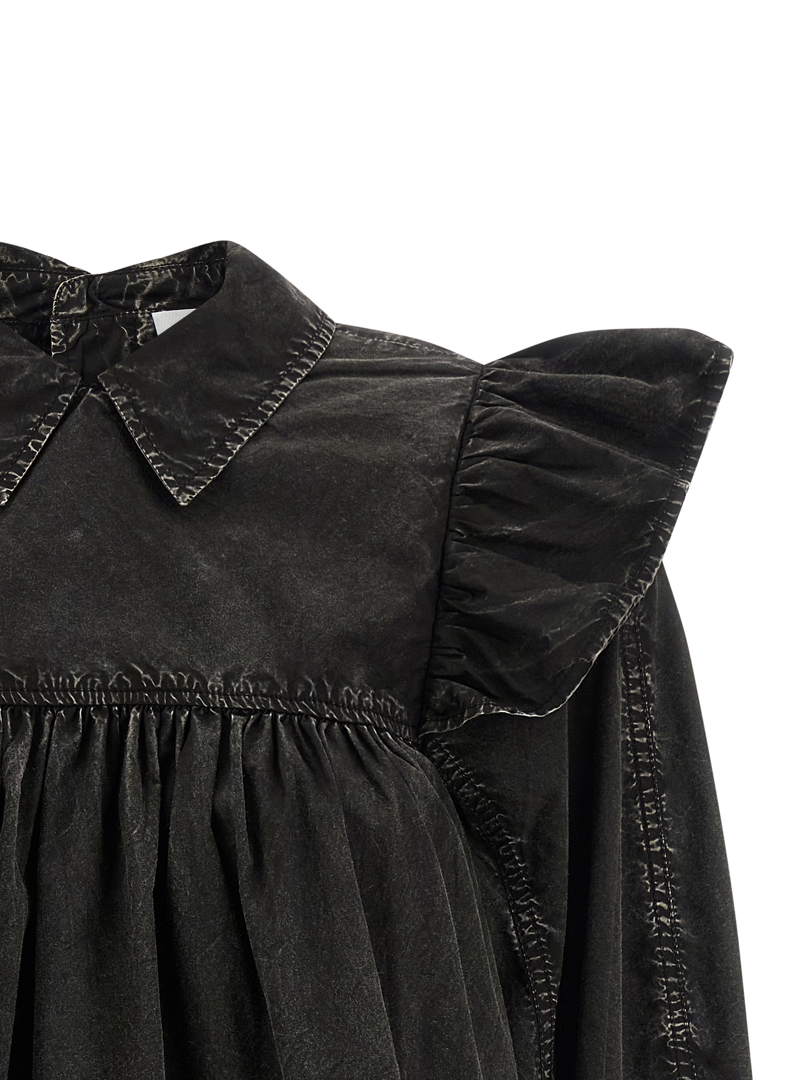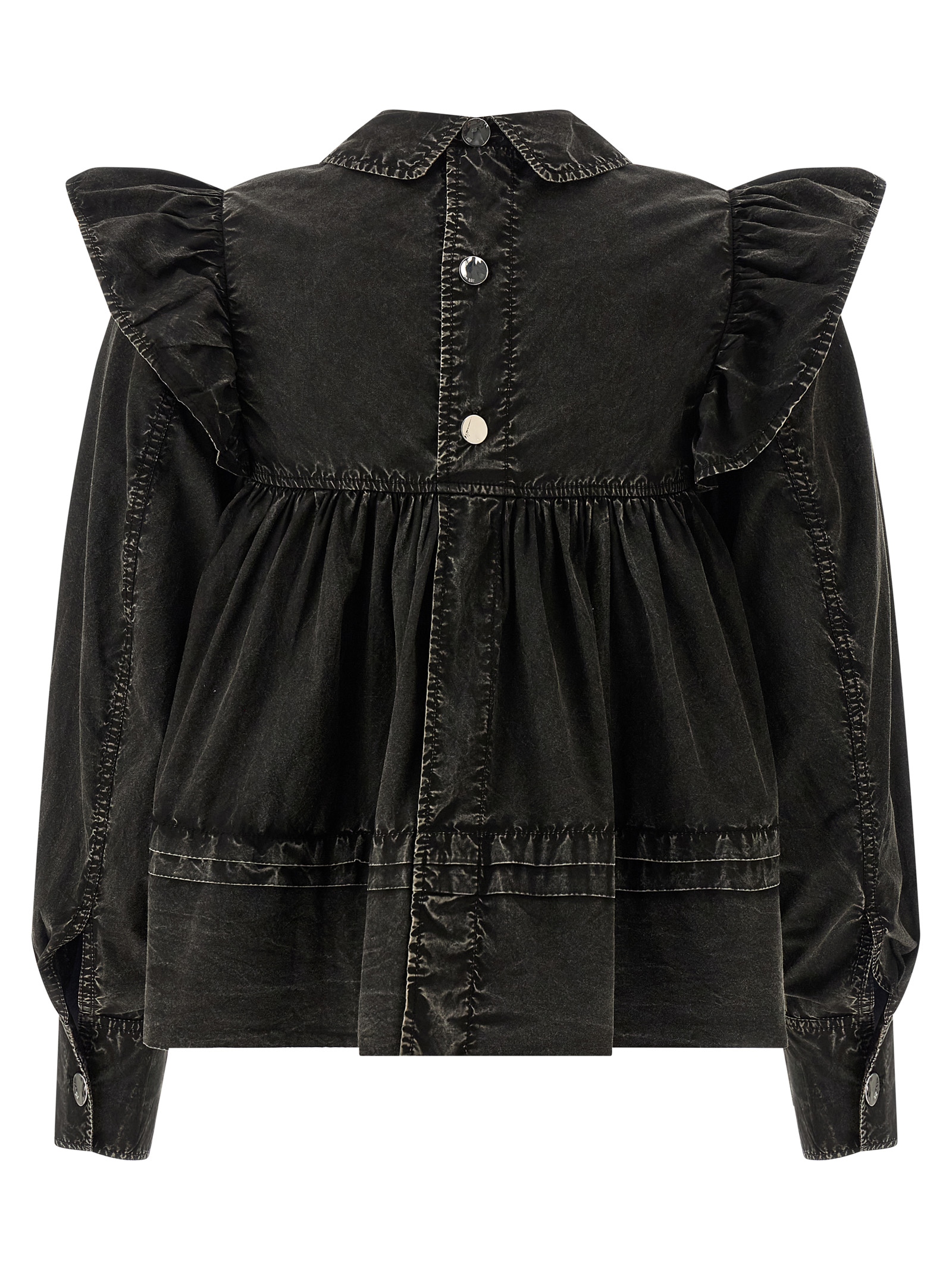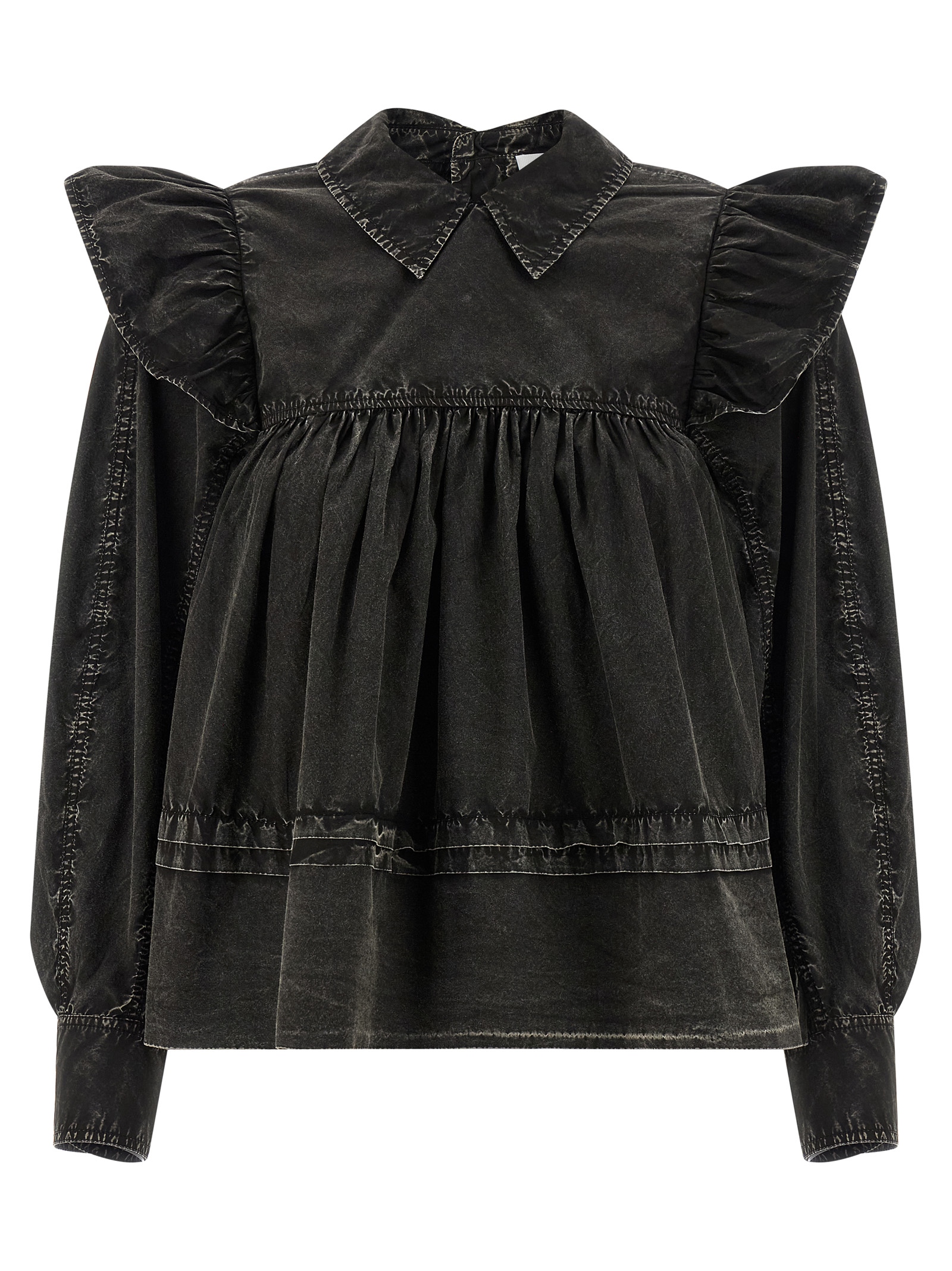 'Black Washed Frill' cotton blouse dyed in a délavé effect garment, model with curls and mini flounces on the front and back, long wide sleeves with cuffs and maxi ruffles on the shoulder, back button closure.<br>SUSTAINABLE: This product is made of organic cotton.