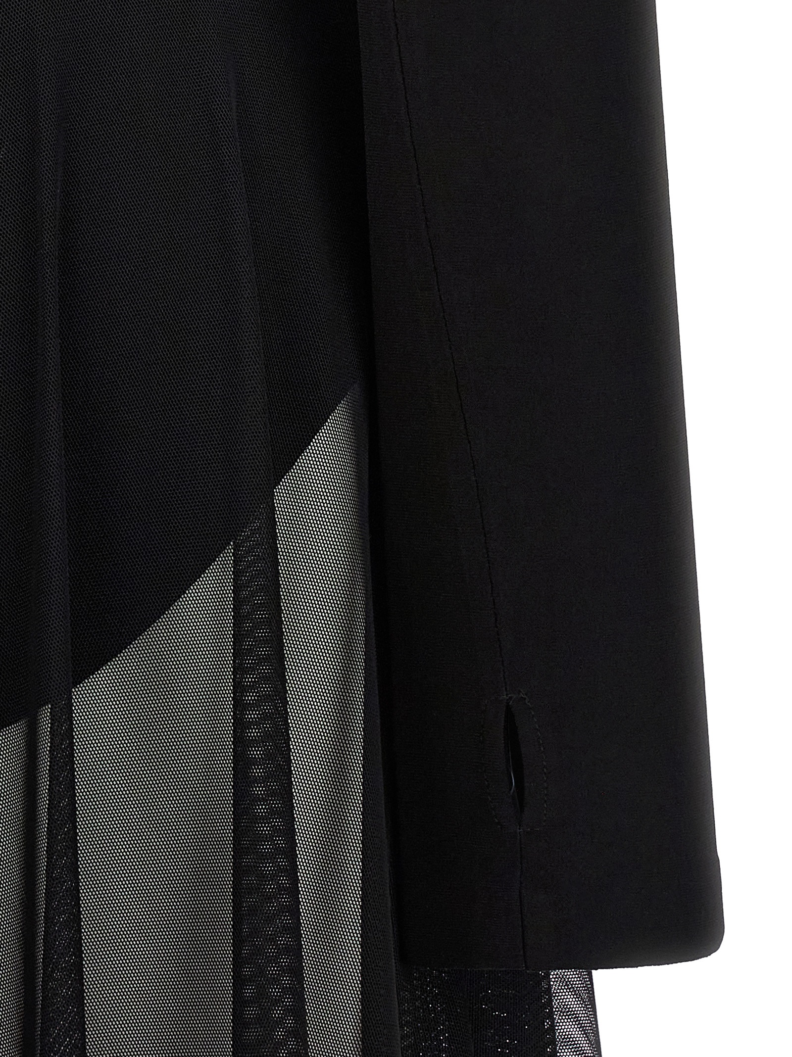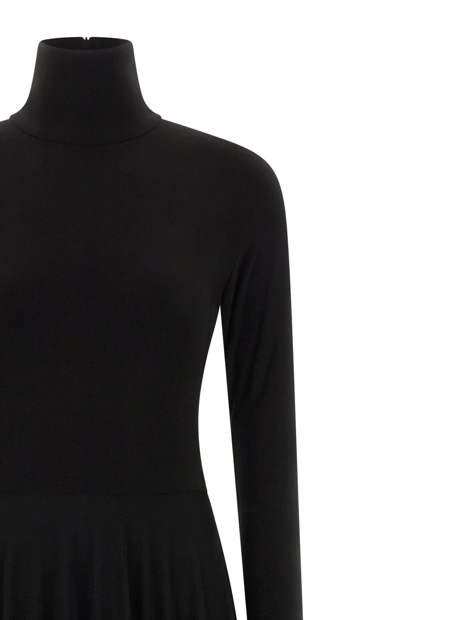Сукня, що складається з боді з еластичного полі-лайкри з високим коміром, застібкою на блискавці ззаду, довгими рукавами, кнопками на подолі та напівпрозорою максі-спідницею, розкльошеним кроєм.