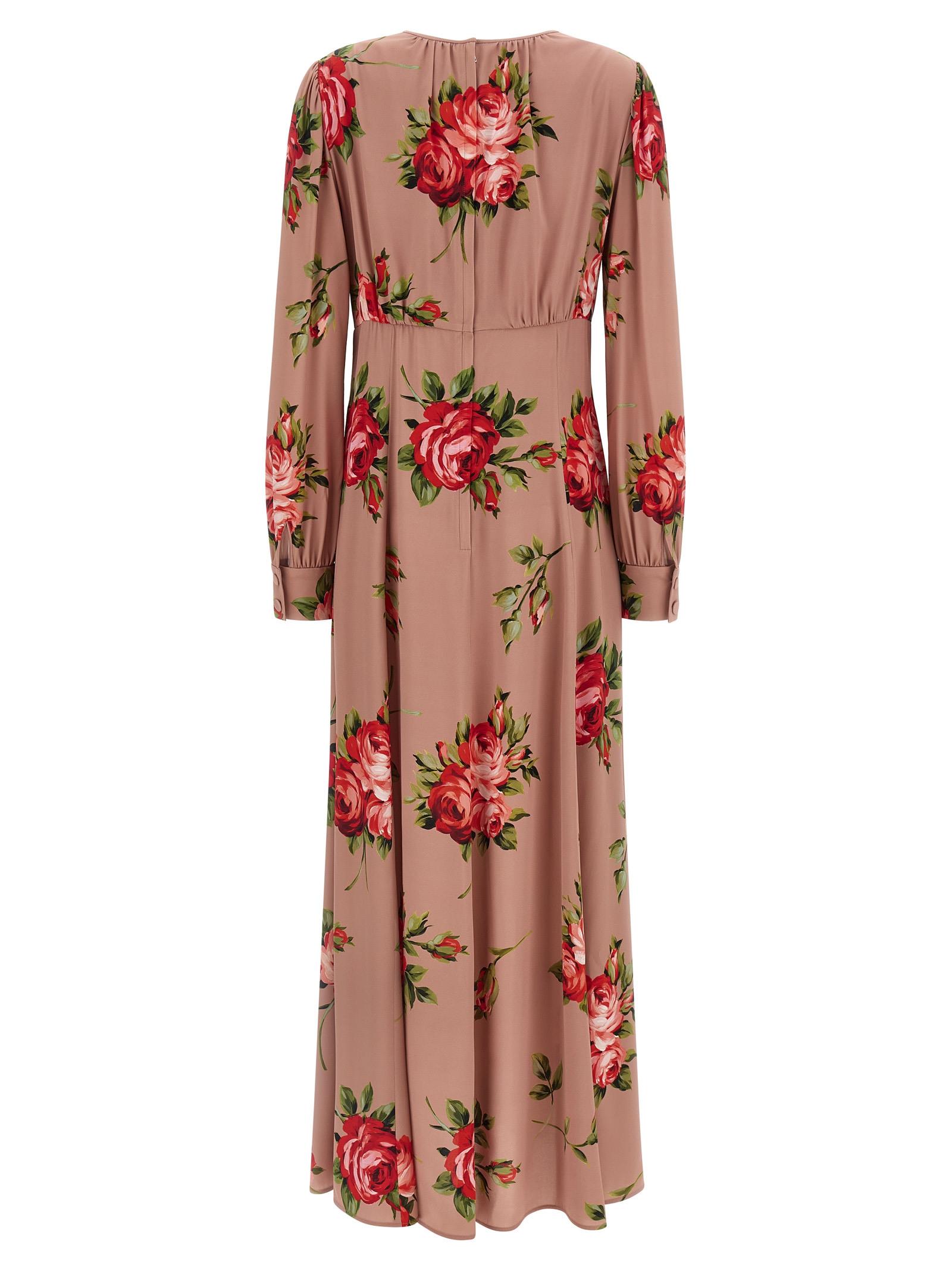 Довга сукня по всій поверхні з крейп-шовку з усім принтом 'Bouquet Rose', силует «пісочний годинник» із розкльошеною широкою спідницею, круглий виріз горловини, передні складки на грудях, задня застібка на блискавку, довгі рукави зі манжетами, без підкладки. Різниці в розташуванні принта, які ви можете знайти на цьому виробі, є характерною ознакою ручної роботи Dolce&Gabbana. Особливість, яка робить кожен виріб або аксесуар унікальним та ексклюзивним.