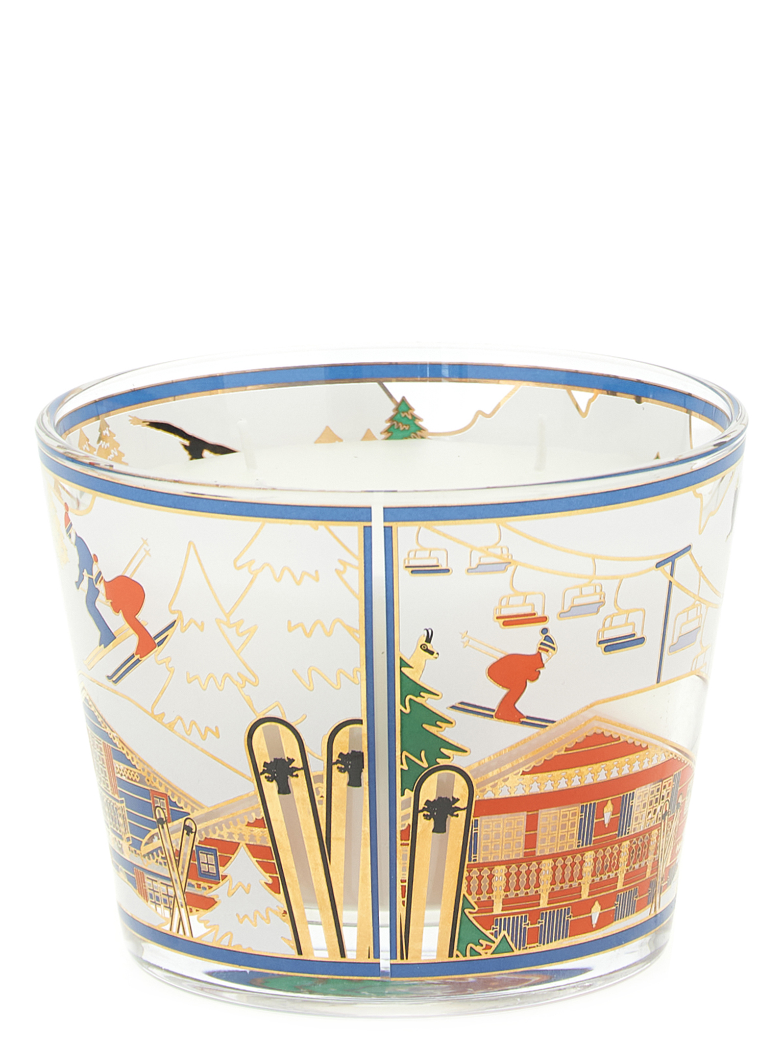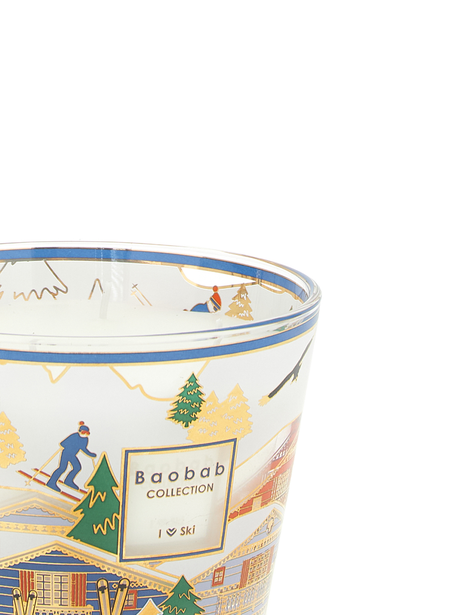 'I Love Ski' candle - Limited Edition - Ski 2026 - Max 10 Climb to the highest and snowiest peaks with the new edition of the I Love Ski candle, an elegant ode to the world of the Alps and the most beloved winter sport. The refined glass container is embellished with a screen print in gold tones and bright colors, depicting enchanting mountain chalets immersed in a winter landscape. It's fun to watch the little skiers, the golden firs and the chairlift all seem to come to life in the light of the flame. FRAGRANCE NOTES: Fig leaf, Iris, Musk. The subtle fragrance envelops the interiors with a cool breeze, suggesting the moment when the snow-capped peaks will give way to a magnificent mantle of lush vegetation. The green notes of fig leaf intertwine with the powdery softness of Iris, while the base notes of white musk add a touch of sensual depth. An olfactory and visual journey in the name of elegance, nature and the art of living at high altitude. ITEM CANNOT BE RETURNED