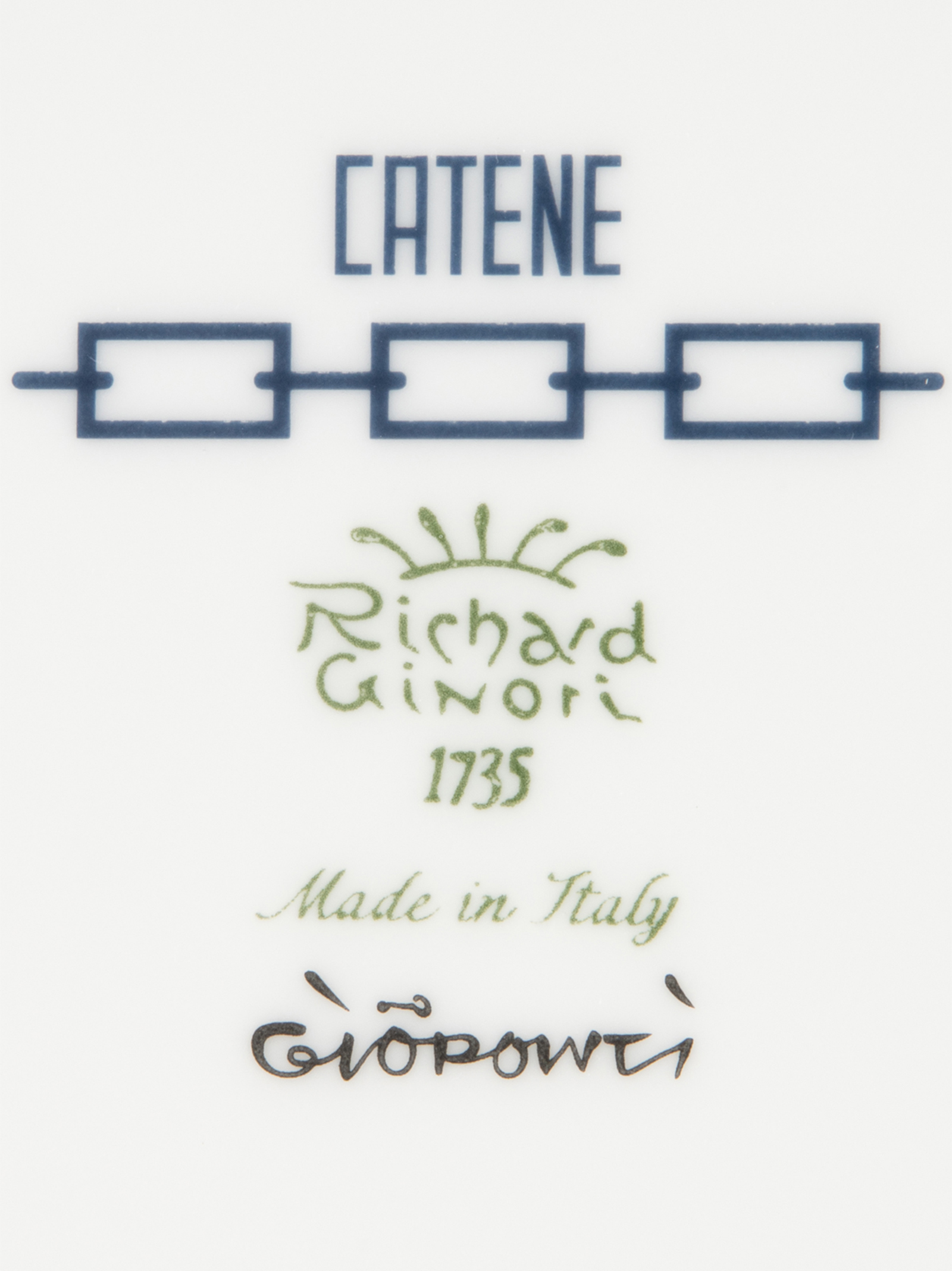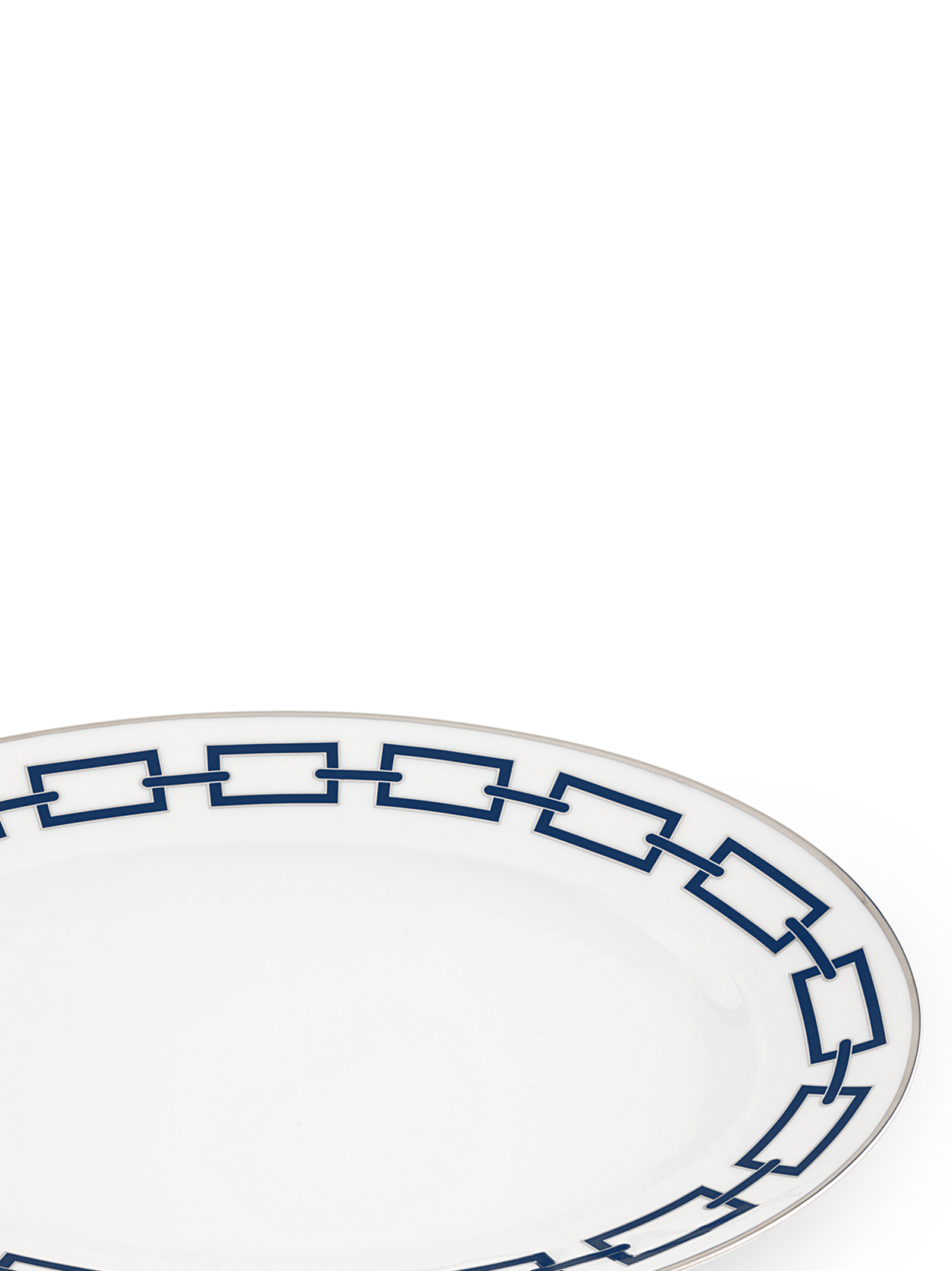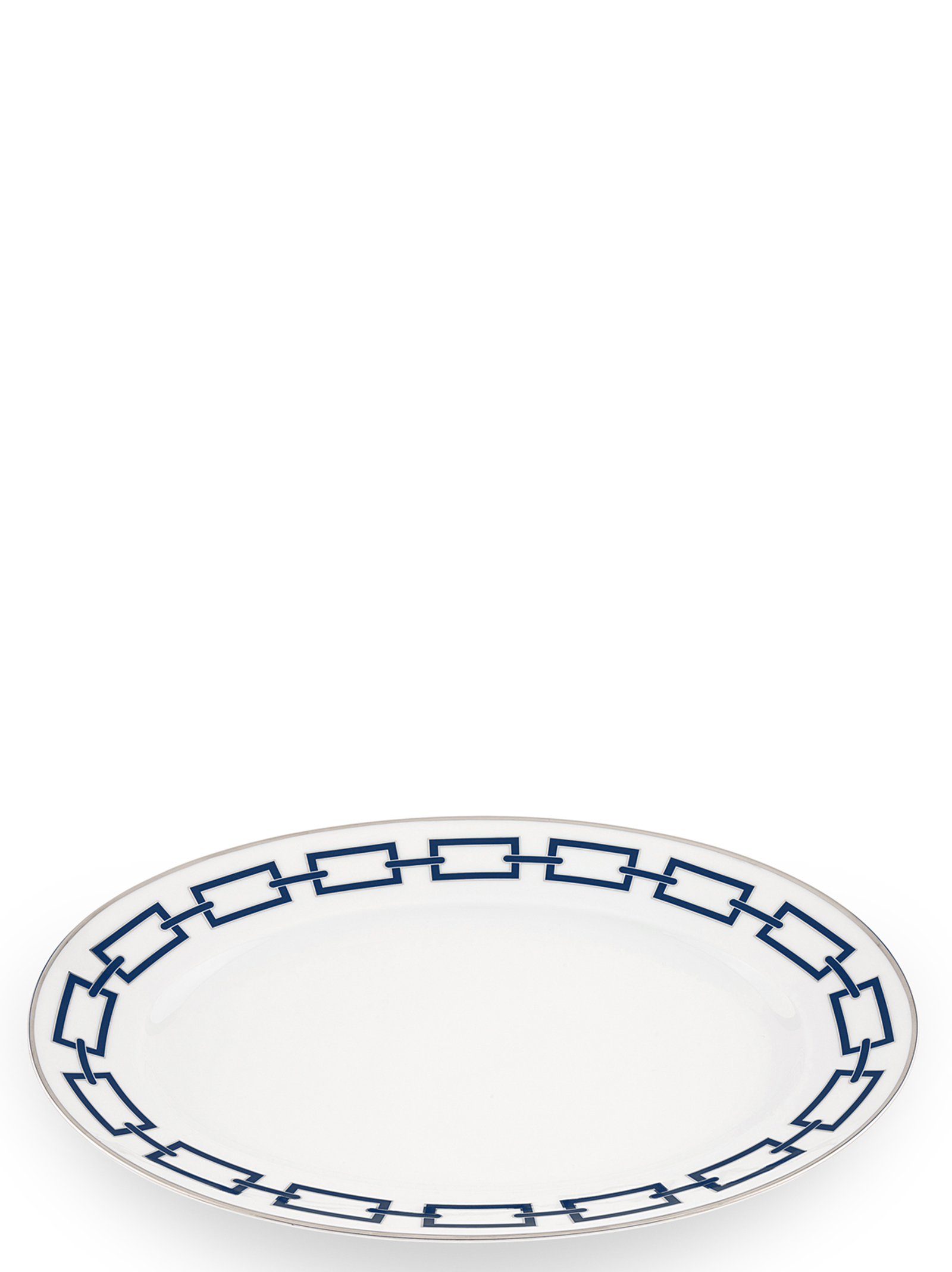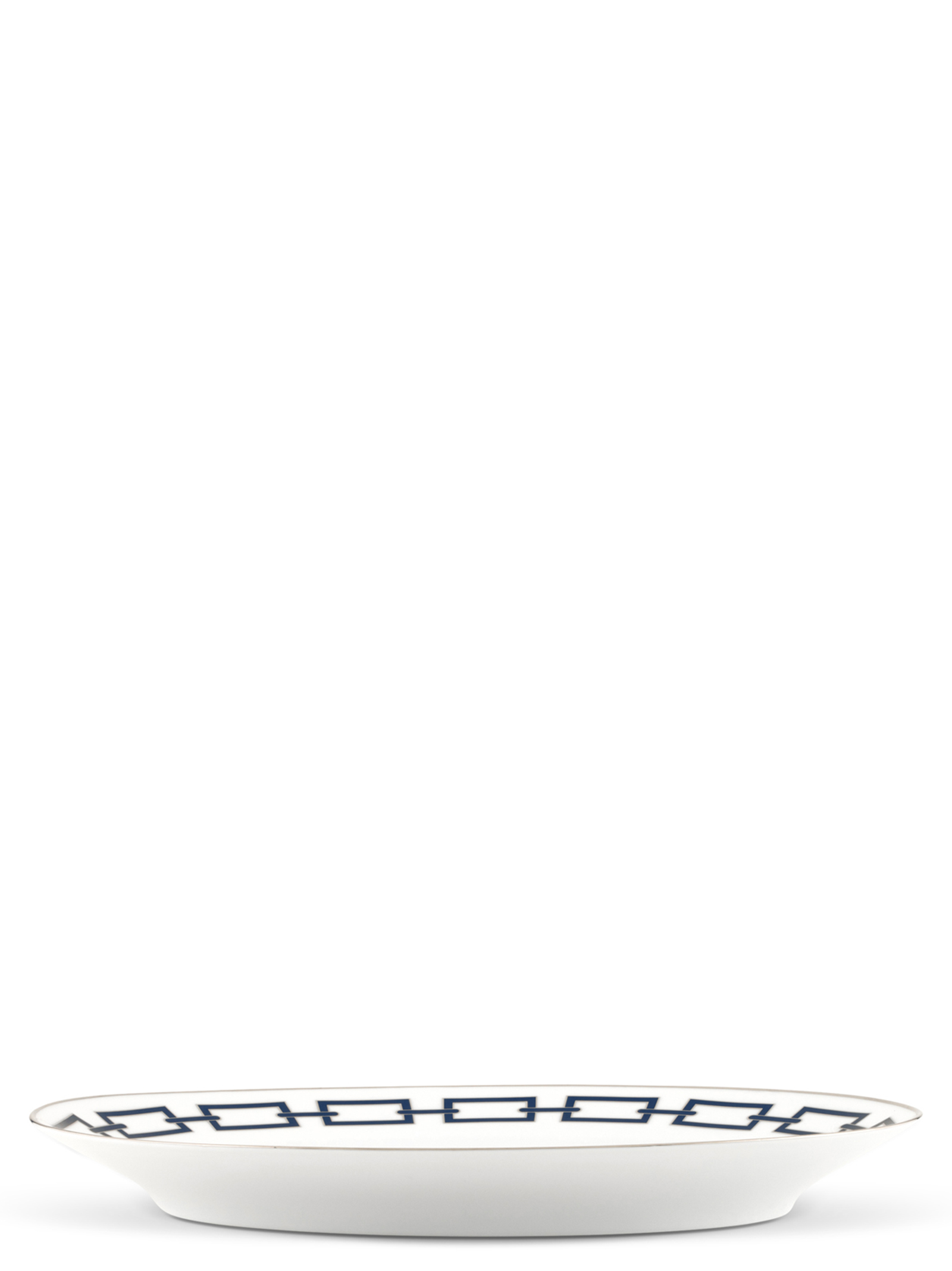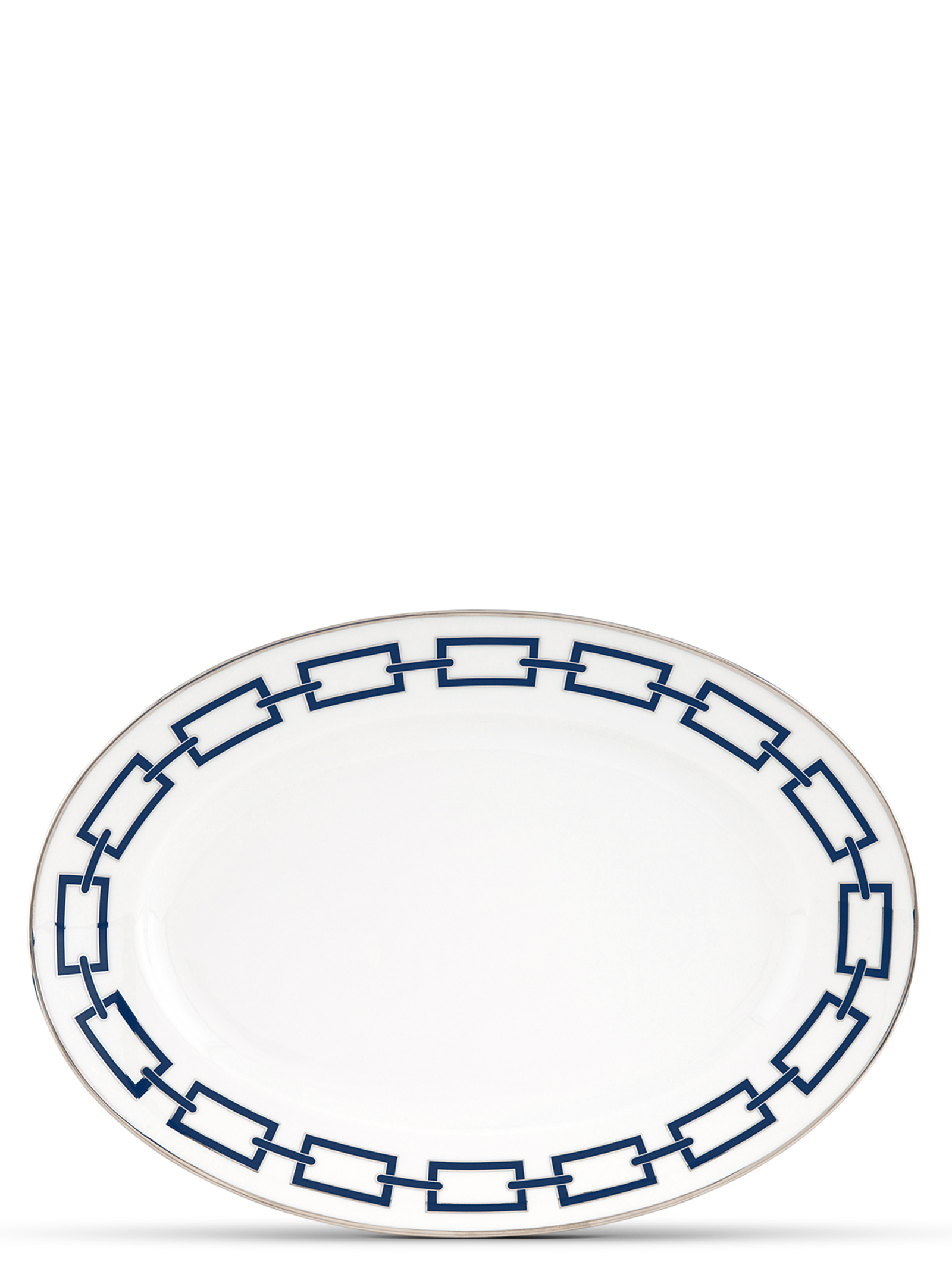 Овальний порцеляновий піднос з блакитною та платиновою оздобою. Колекція 'Catene' від Джо Понті. Не придатний для мікрохвильовки. Підходить для миття в посудомийній машині при делікатному режимі.
