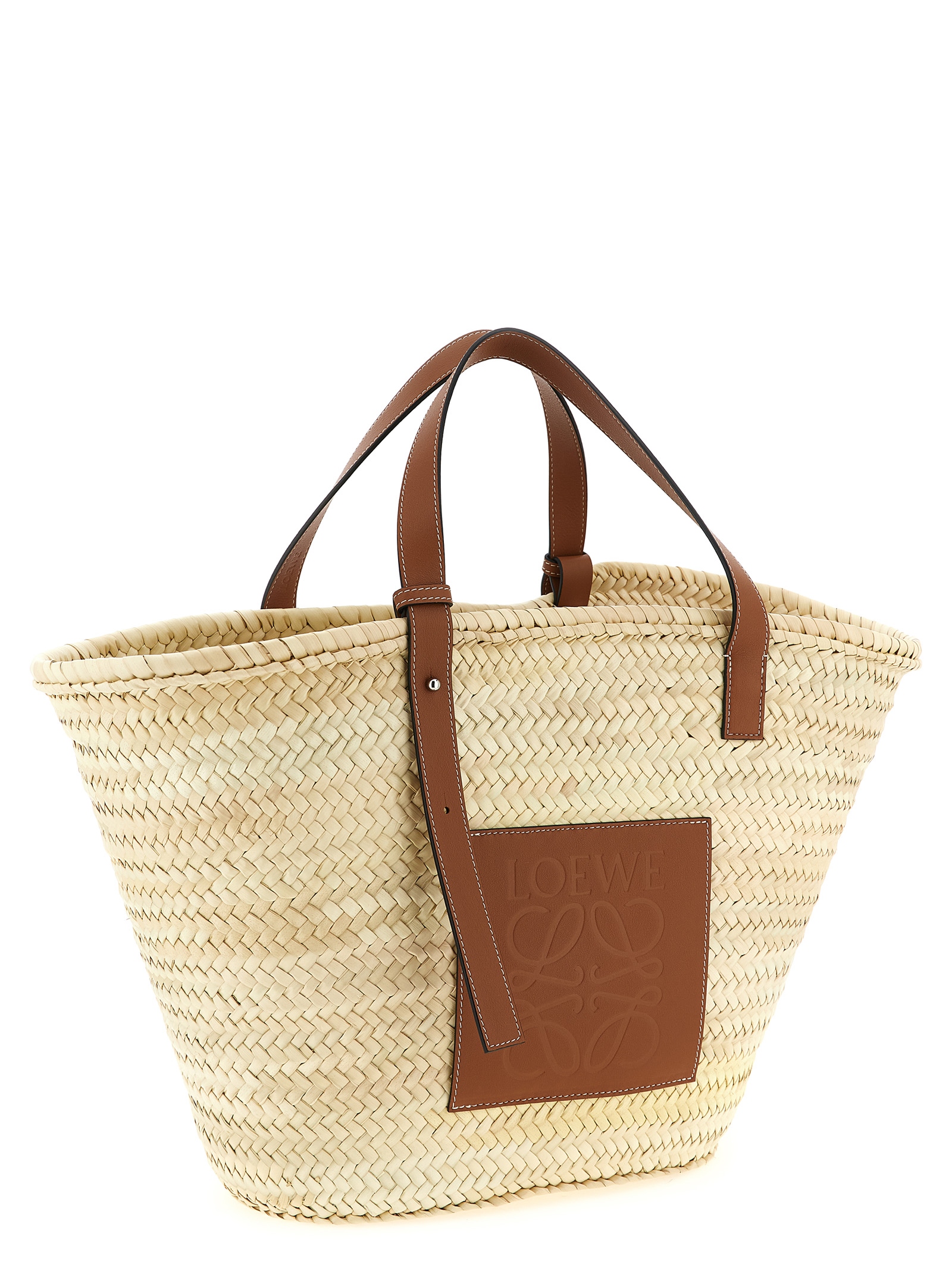 Велика сумка для покупок 'Classic Basket', виготовлена вручну з переплетених пальмових листків і контрастної гладкої шкіри, шкіряна нашивка з тисненим візерунком Anagram LOEWE, подвійна регульована ручка. Ручна робота: будь-які недосконалості слід вважати ознаками унікальності.