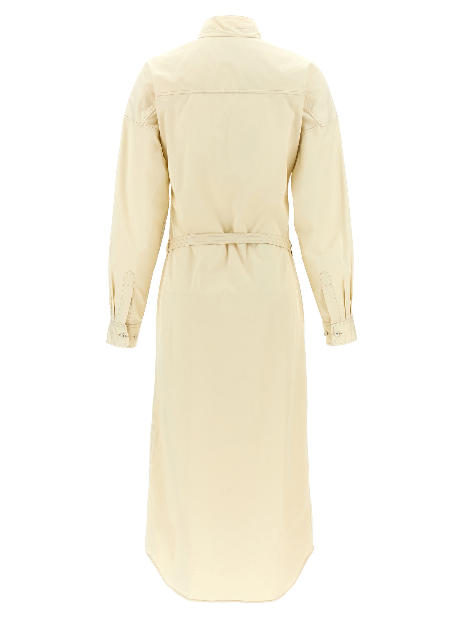 Легка бавовняна атласна міді-сукня в стилі хемізьє, високий комір, передня застібка на кнопках, довгі рукави з манжетами, кишені, знімний пояс з кишенею.