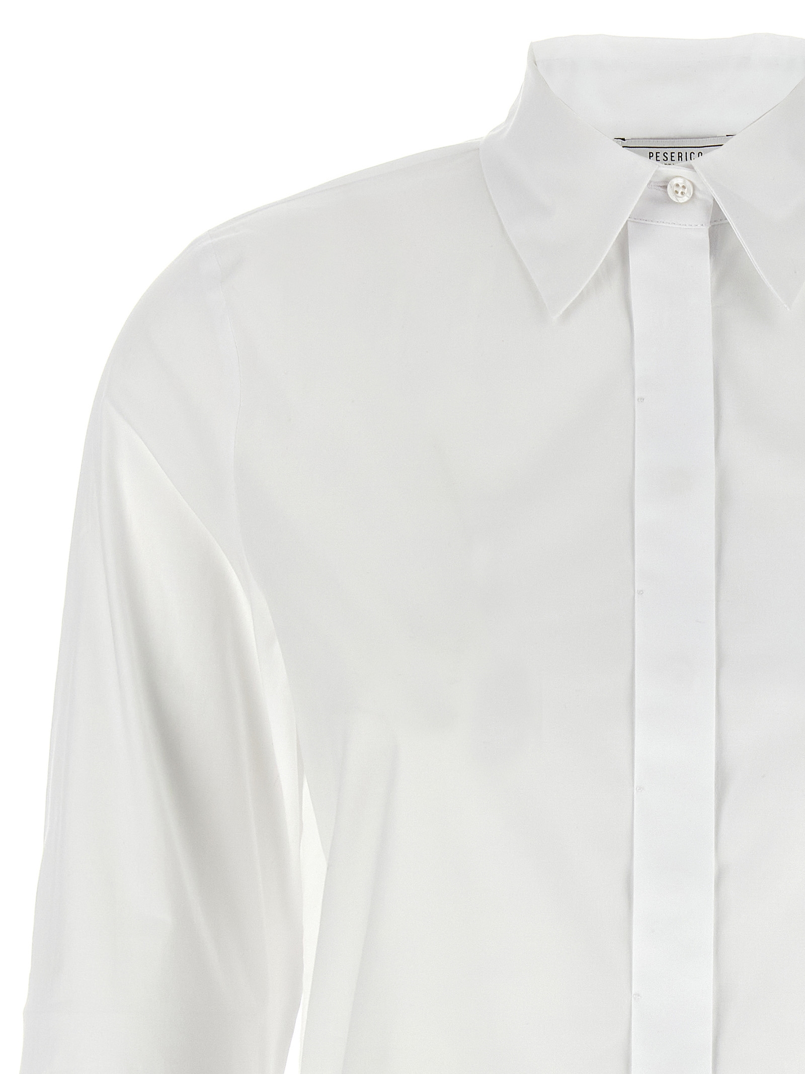 Сорочка з еластичної бавовни, щільний поплін, прихована передня застібка на гудзиках, довгі рукави з манжетами, металеві деталі на манжетах та частковий виріз, бічні розрізи.