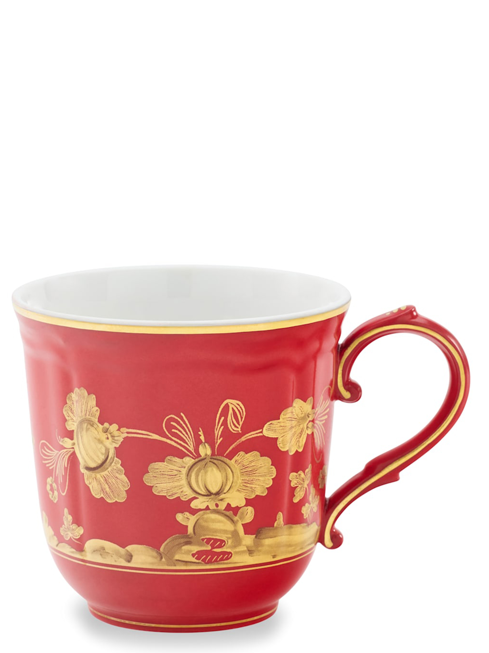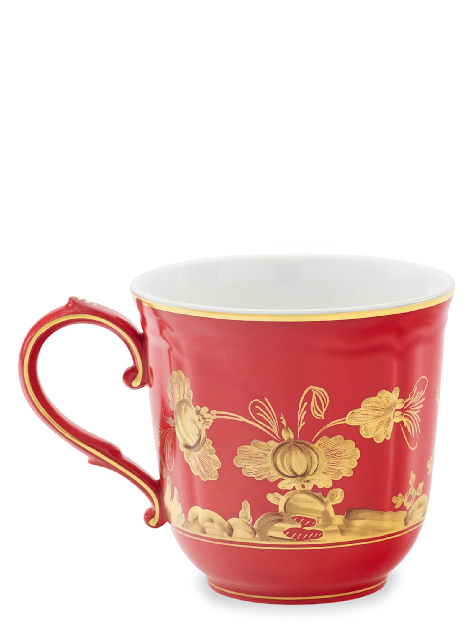 Фарфоровий кухоль з чистим червоним і золотим декором Rubrum. Колекція 'Oriente Italiano - Gold Collection'. Не придатний для мікрохвильової печі. Можна мити в посудомийній машині на делікатному режимі.