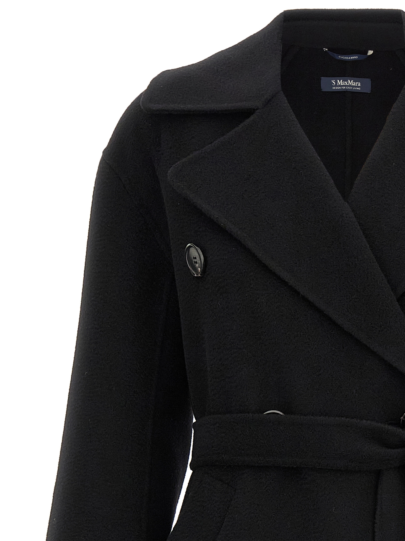 'Dalila' довге пальто з двосторонньої драпіровки з чистої вовни, пошите вручну, двобортний стиль з передньою застібкою на гудзиках, лацканний комір, кишені, довгі рукава з спущеними плечима, розріз ззаду, без підкладки, знімний пояс.