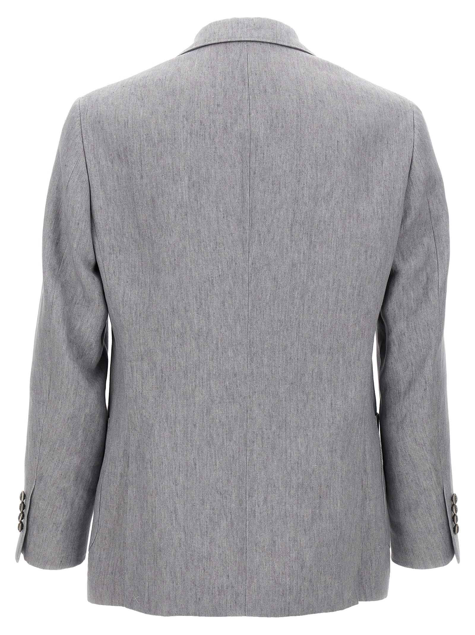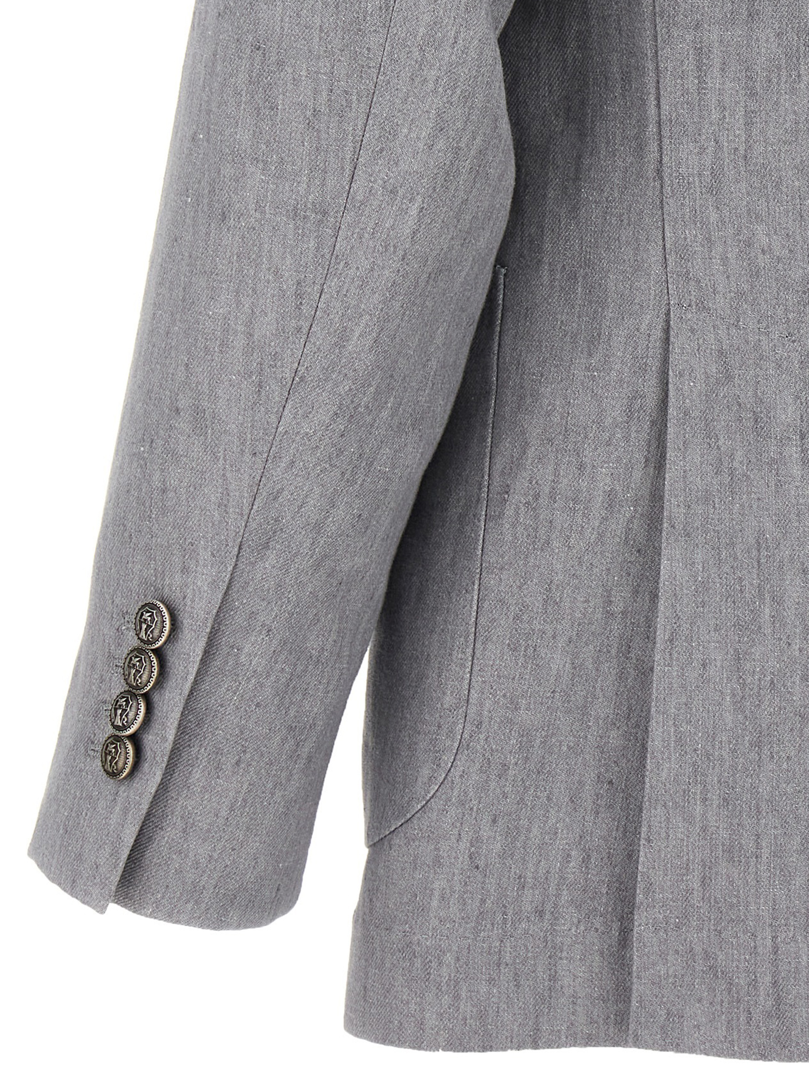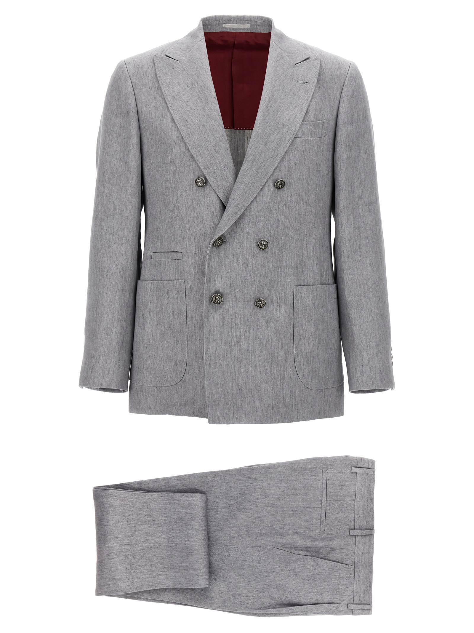 Джинсова сукня з льону, що складається з деконструйованого піджака з однією і півтора грудей з 6 металевими гудзиками, пікові лацкани, накладні кишені, кишеня для квитків та нагрудна кишеня, дві внутрішні кишені з застібкою на гудзиках та кишенею для ручки, 'Spalla Solomeo', манжети з отворами для гудзиків, напівпідкладка з купро, задні розрізи та штани з складками, передні кишені "американки", задні накладні кишені, гачок та передня застібка на блискавці, підворіт на подолі.
