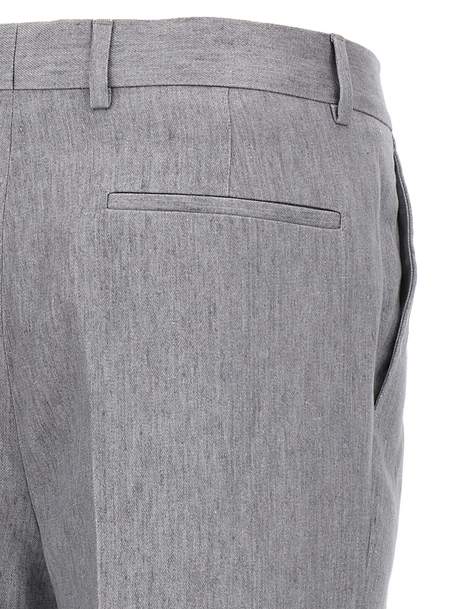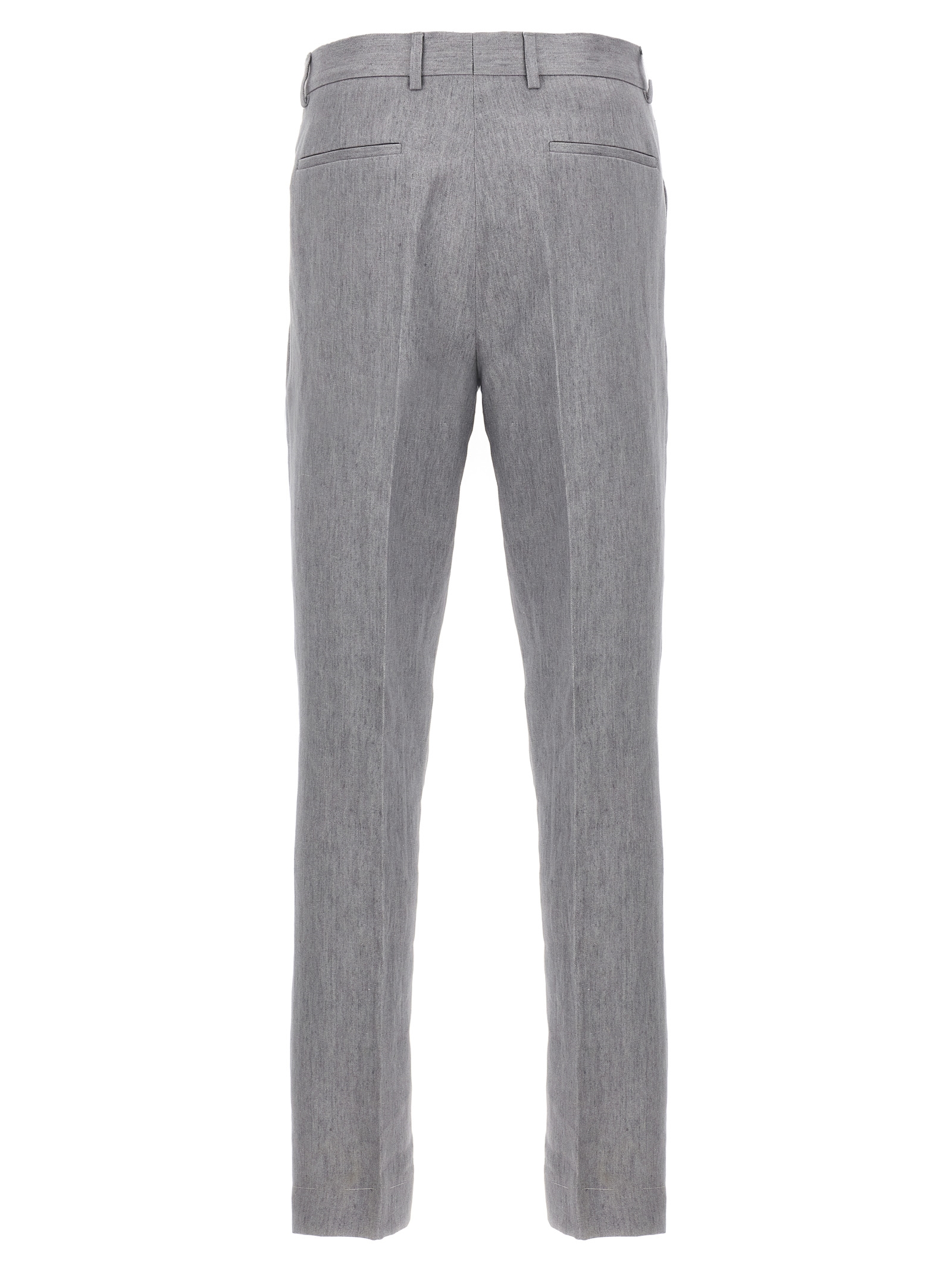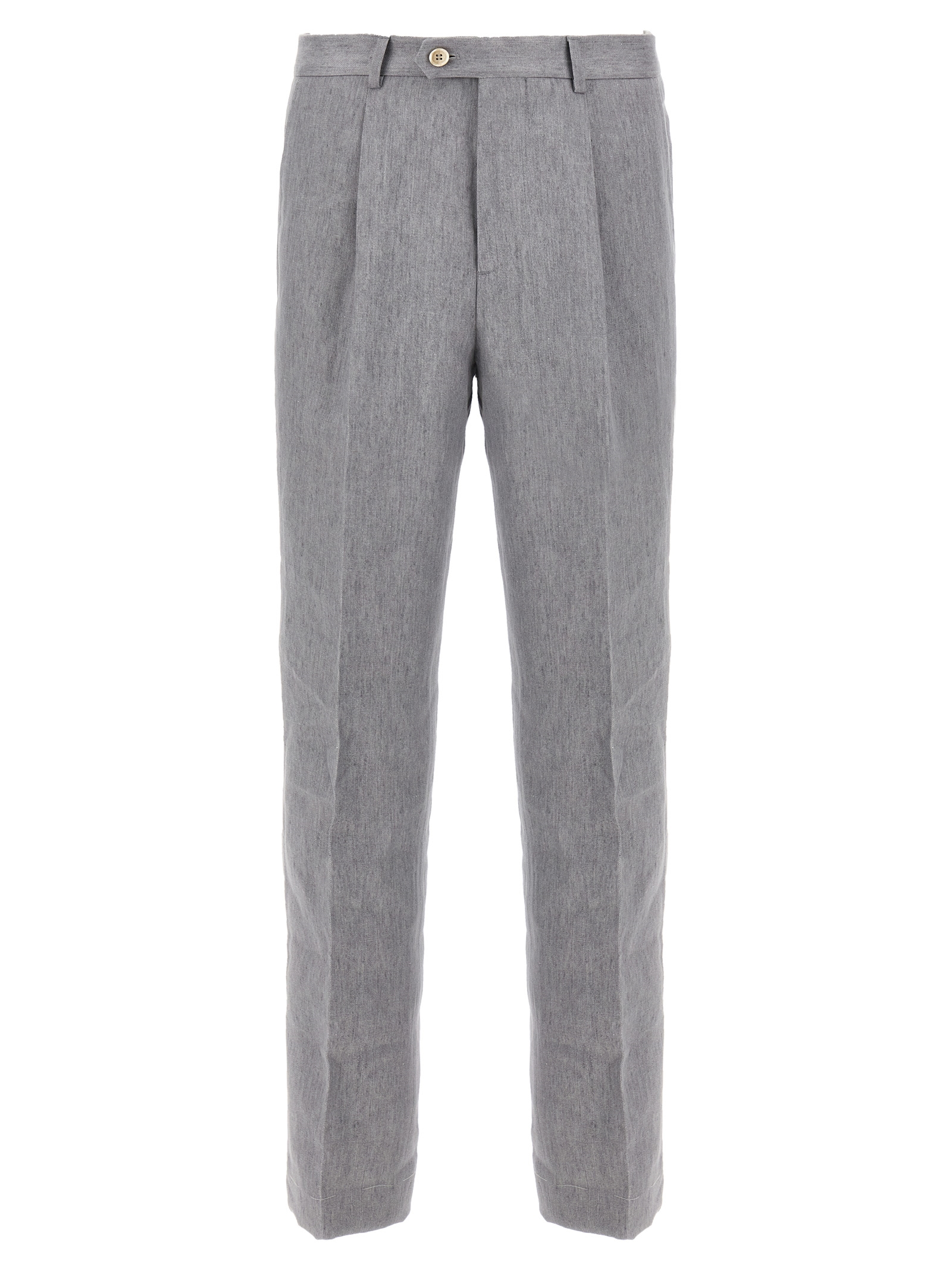 Джинсова сукня з льону, що складається з деконструйованого піджака з однією і півтора грудей з 6 металевими гудзиками, пікові лацкани, накладні кишені, кишеня для квитків та нагрудна кишеня, дві внутрішні кишені з застібкою на гудзиках та кишенею для ручки, 'Spalla Solomeo', манжети з отворами для гудзиків, напівпідкладка з купро, задні розрізи та штани з складками, передні кишені "американки", задні накладні кишені, гачок та передня застібка на блискавці, підворіт на подолі.