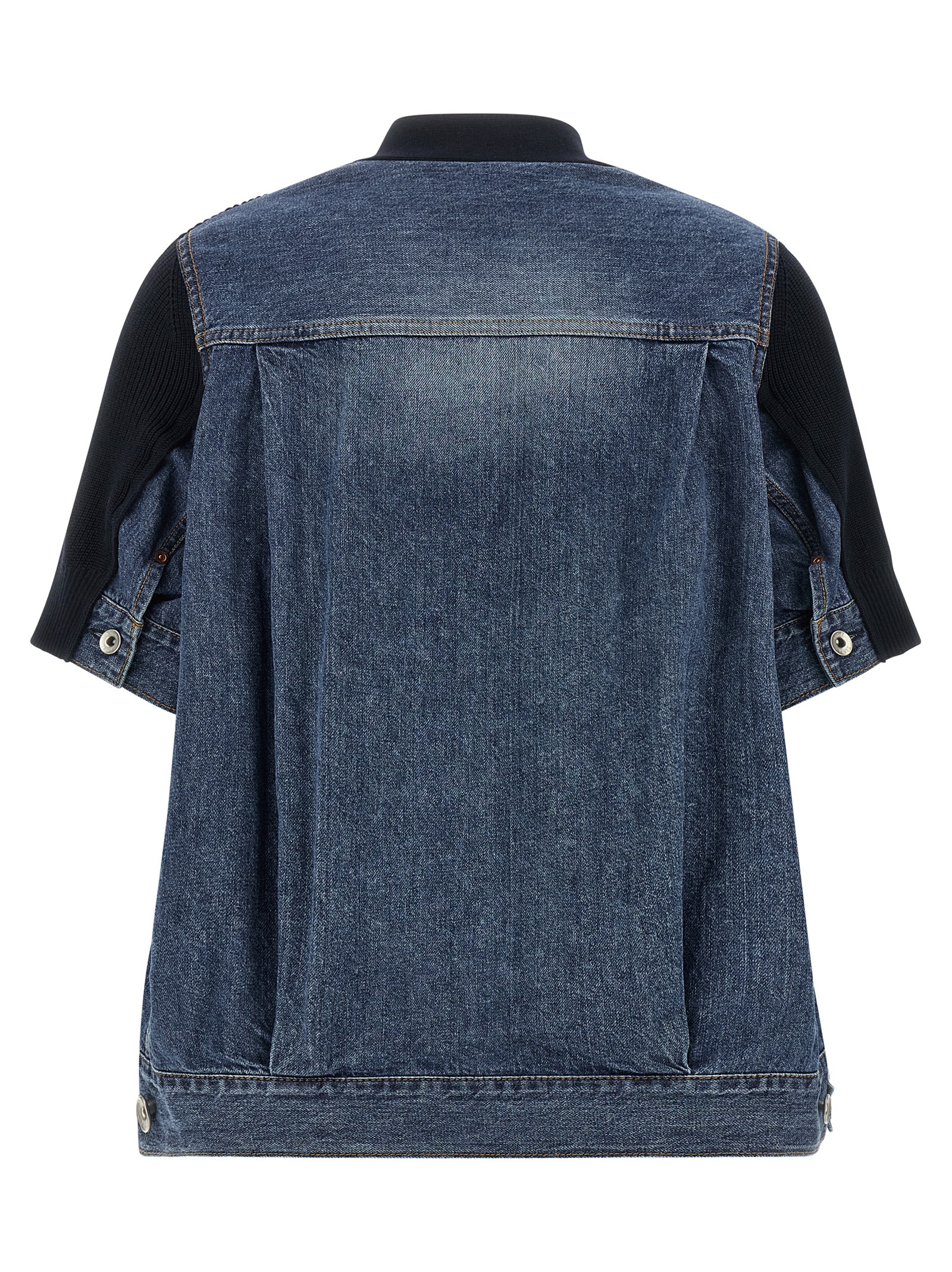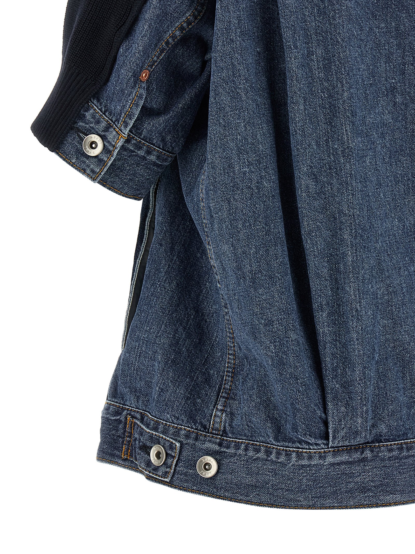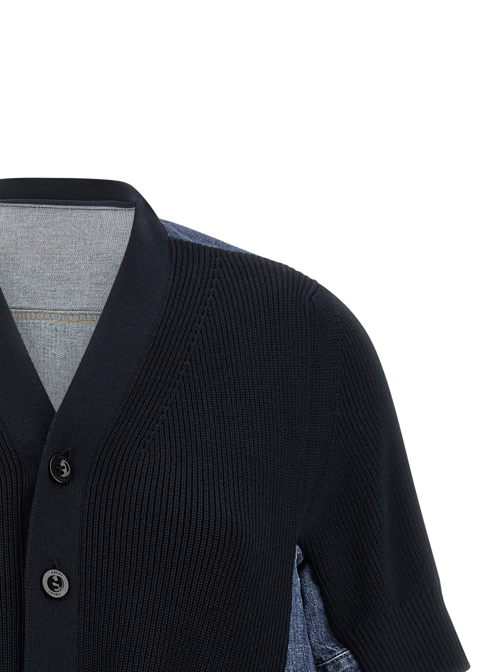 Кардіган 'Denim x Knit' з бавовняного деніму з контрастною в'язкою вставкою спереду з бавовни, контрастною строчкою, розкльошений силует, V‑виріз, передня застібка на ґудзики, короткі рукави з відворотами, регульований асиметричний низ.