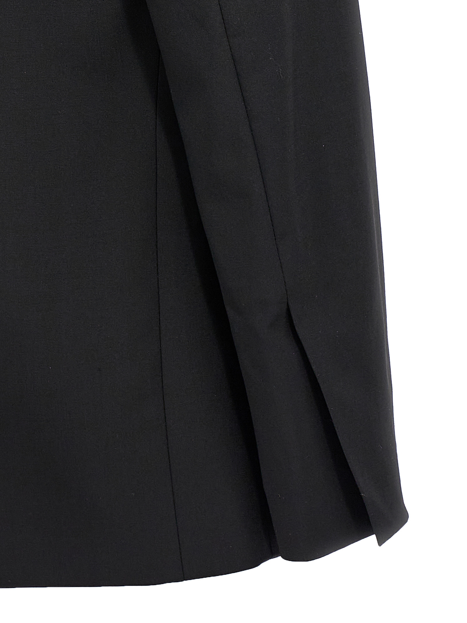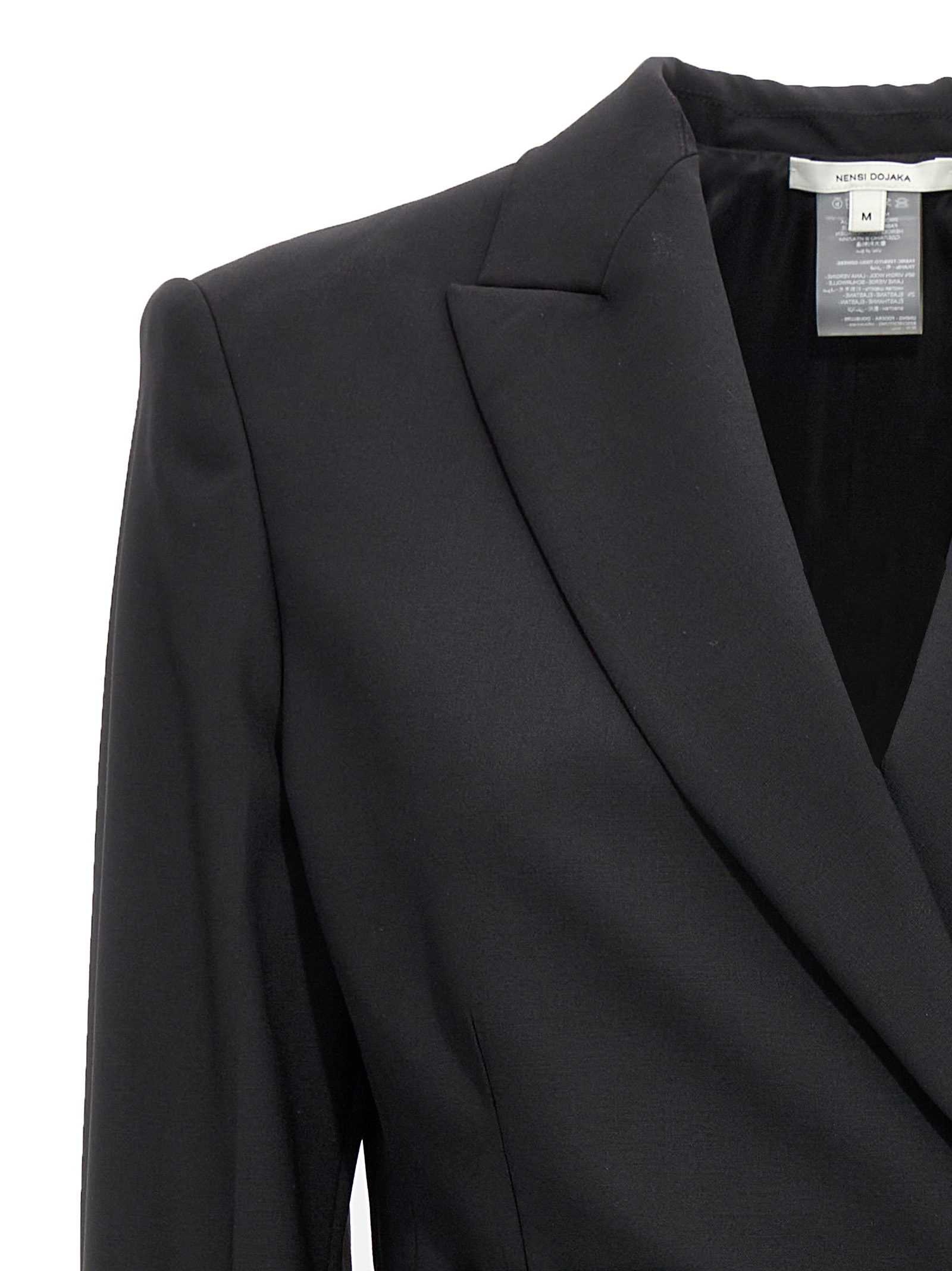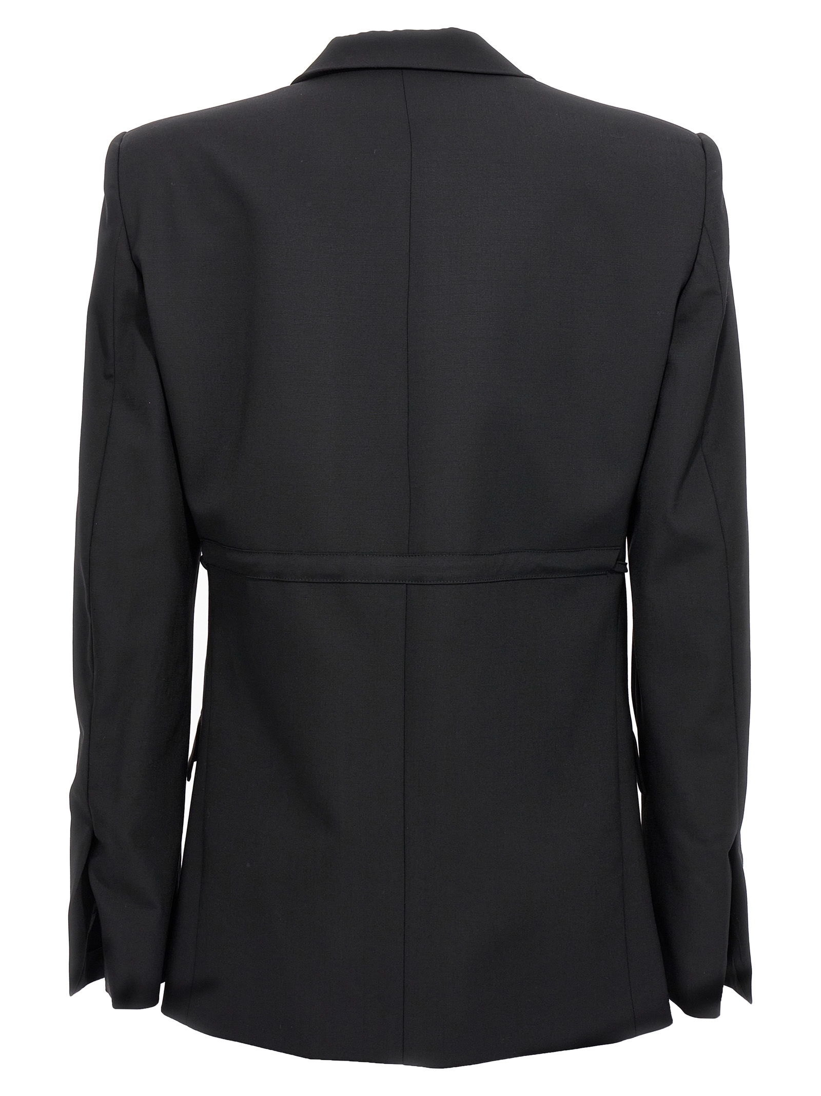 Двобортний вовняний піджак з застібкою на гудзиках, регульованою шнурівкою на талії, підкладками на плечах, довгими рукавами та кишенями.