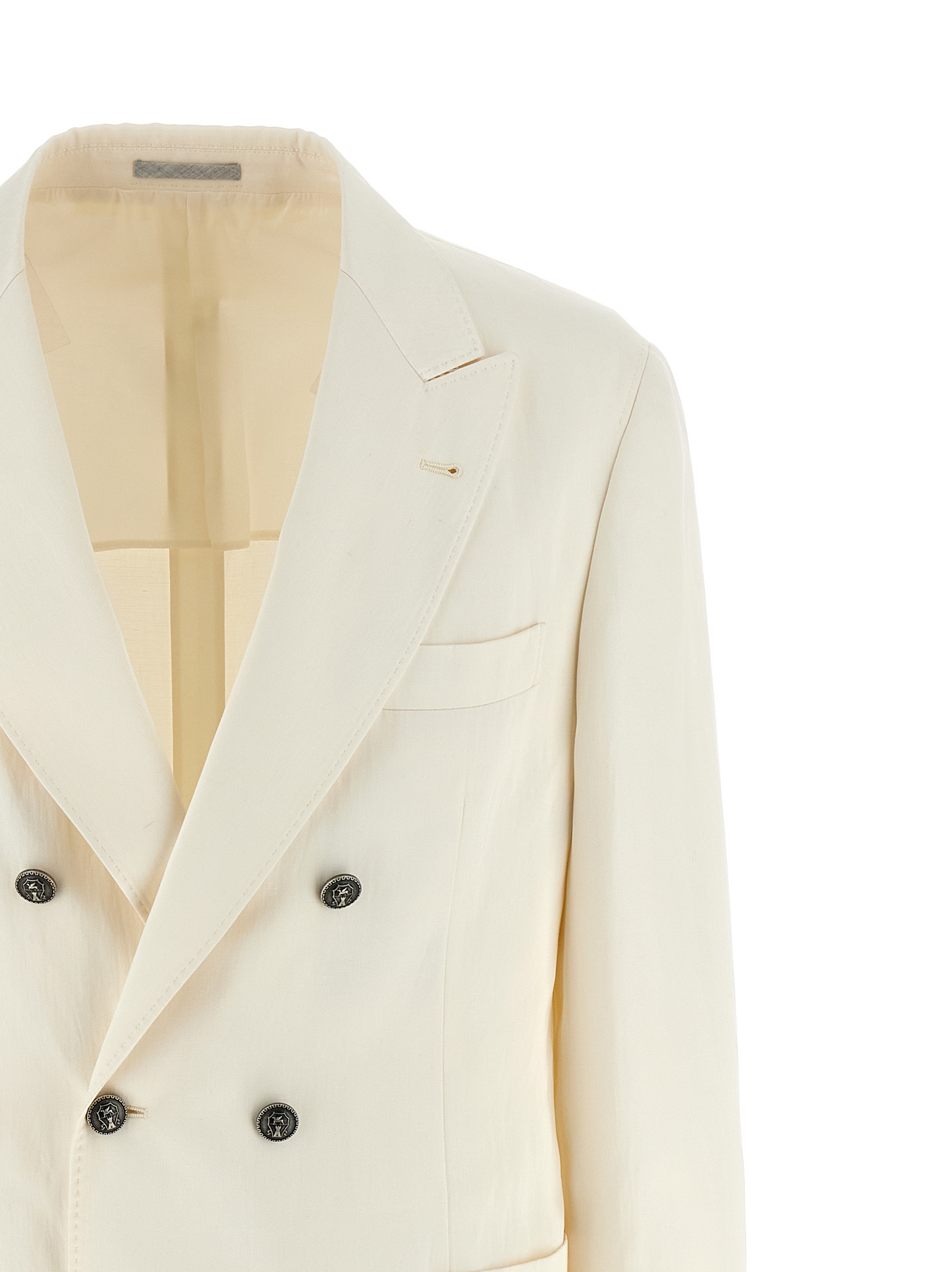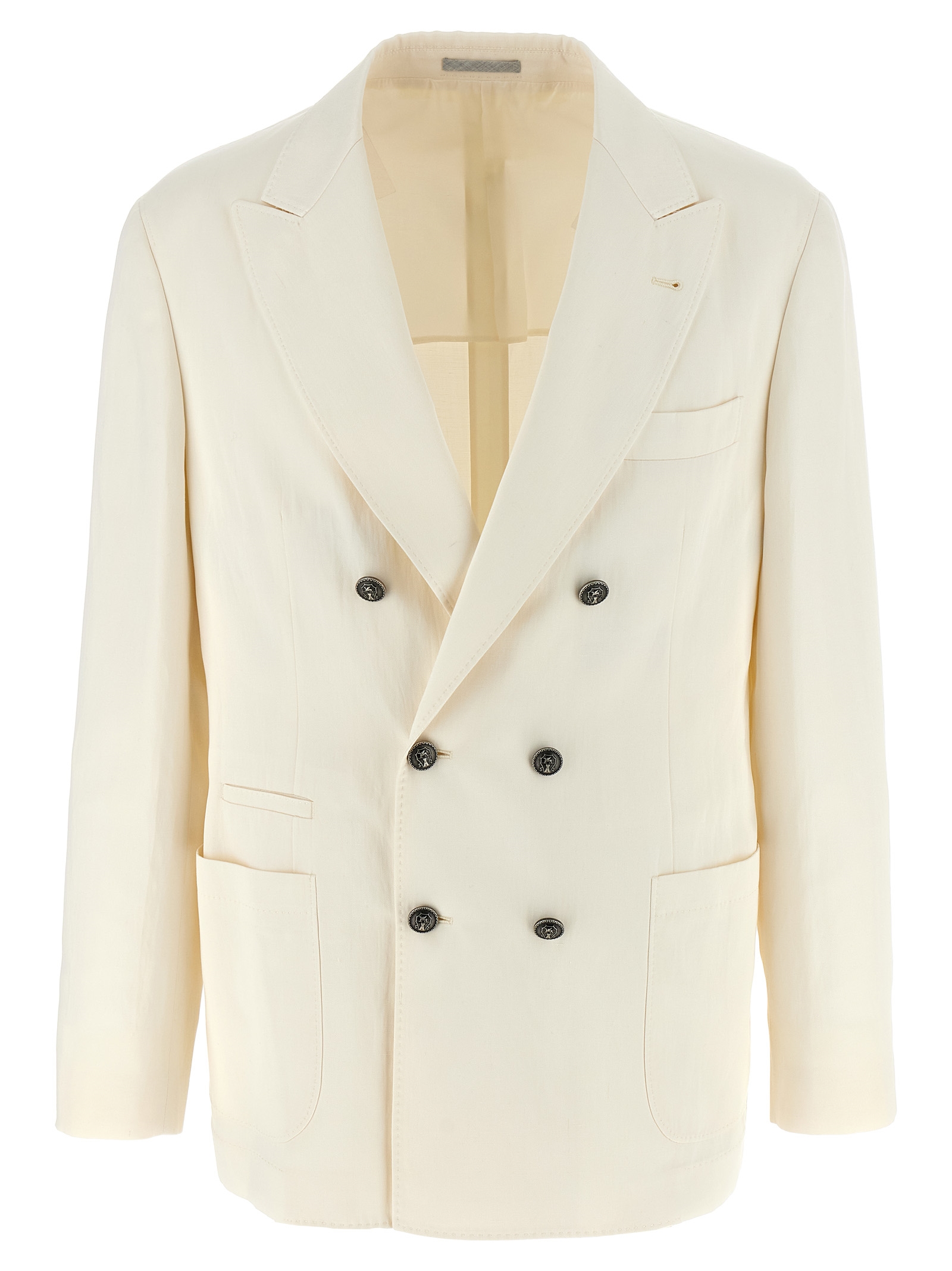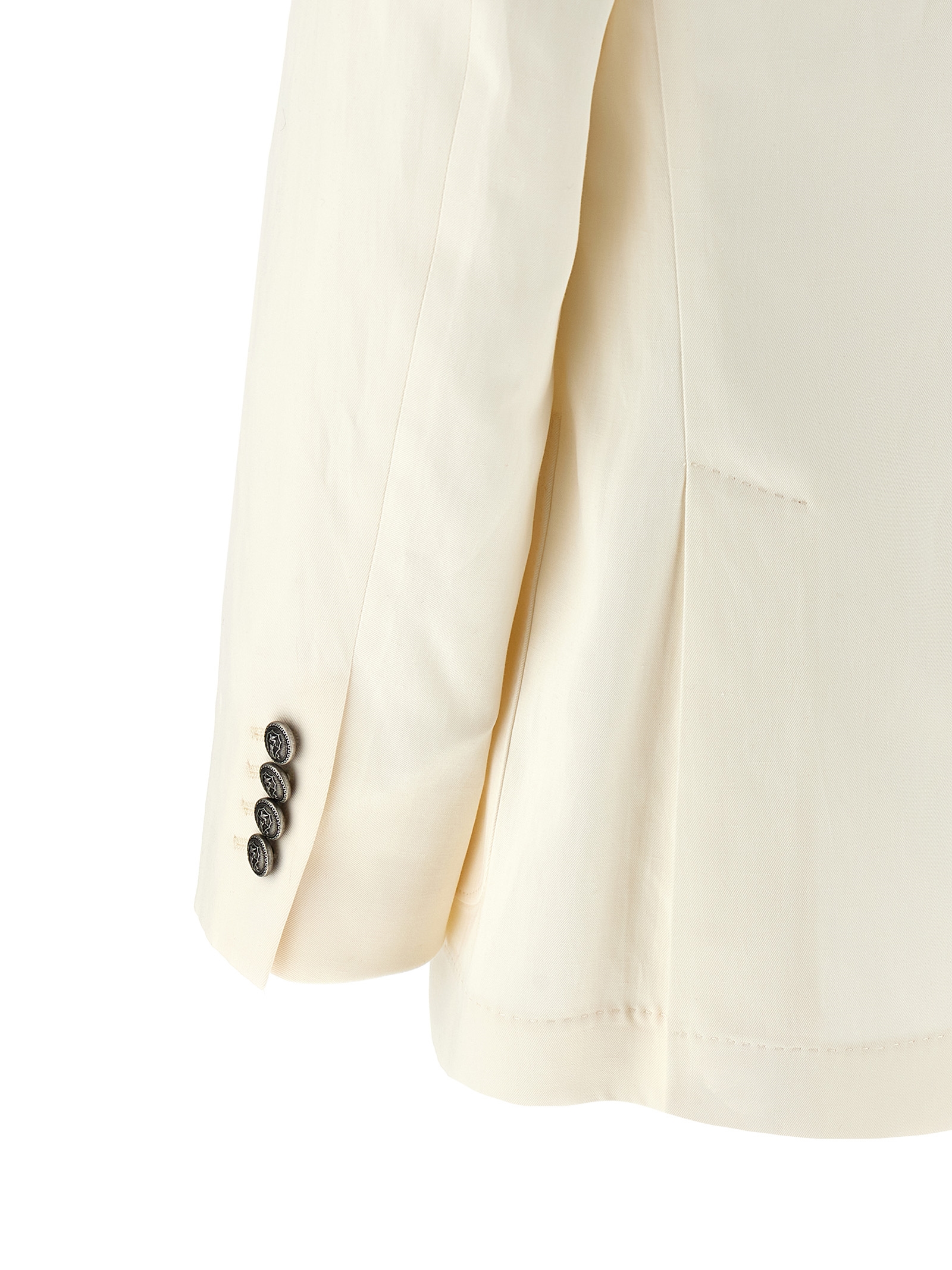Двобортний піджак з шовку та льону з металевими гудзиками, виріз з лацканами, подвійний розріз ззаду, довгі рукави з гудзиками.
