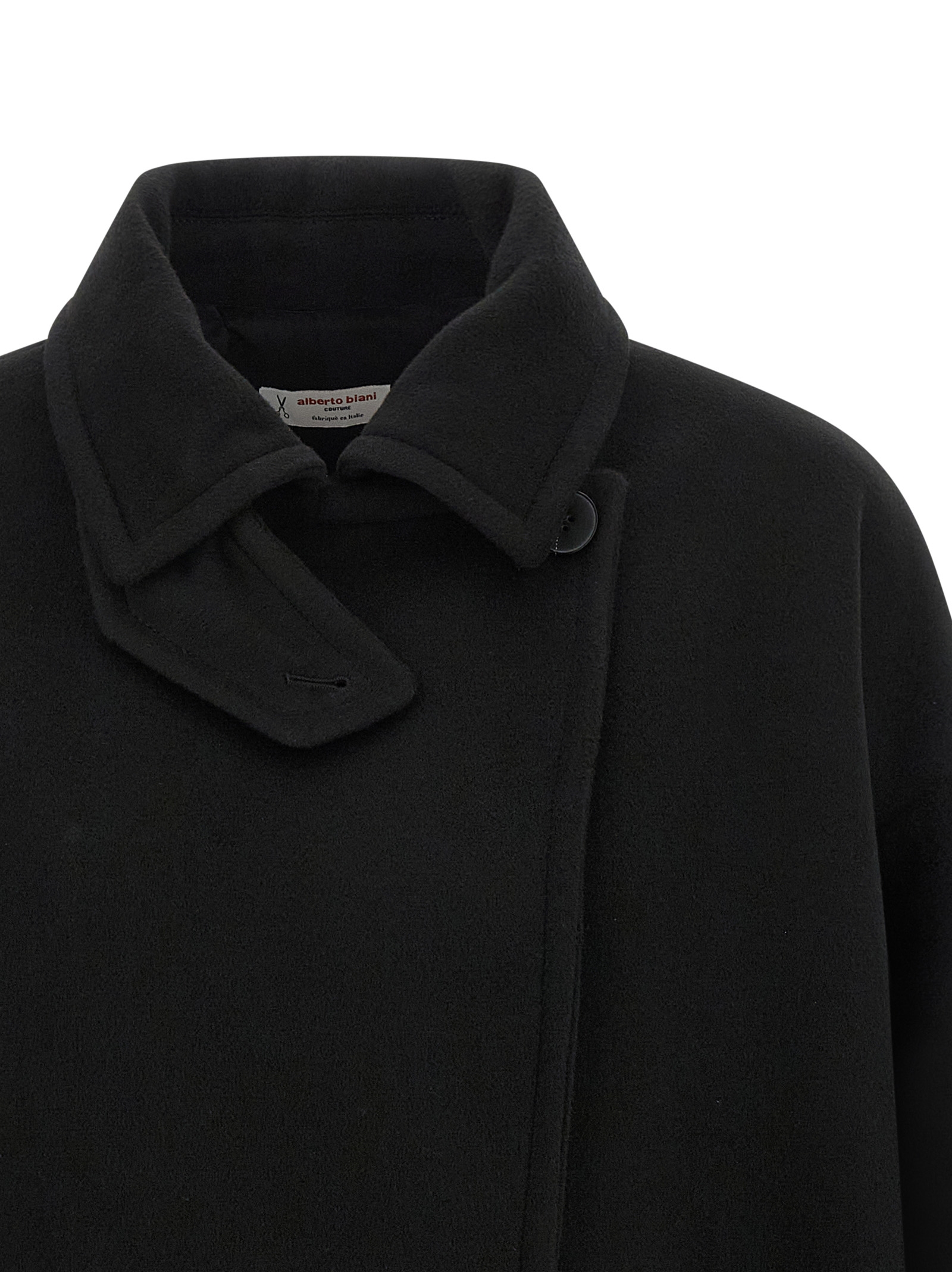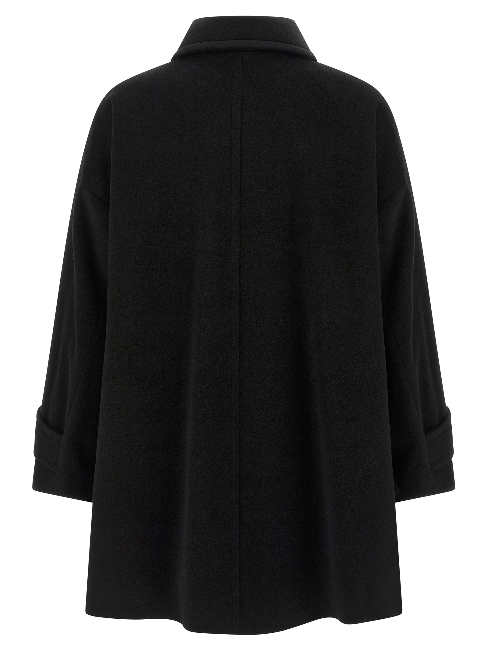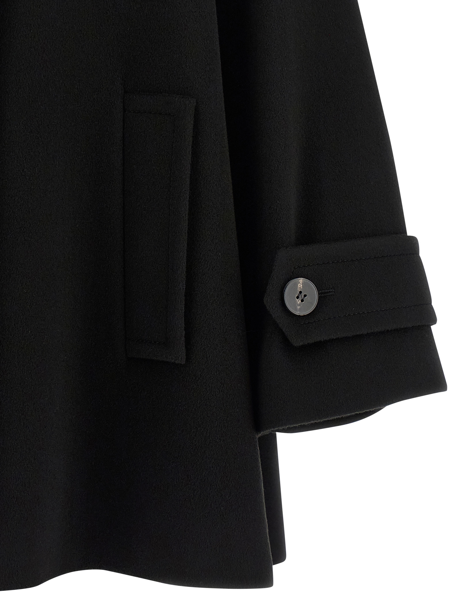 Двобортний вовняний кабан з застібкою на гудзиках, комір-сорочка з застібкою на гудзиках, довгі та широкі рукави з застібками на гудзиках.