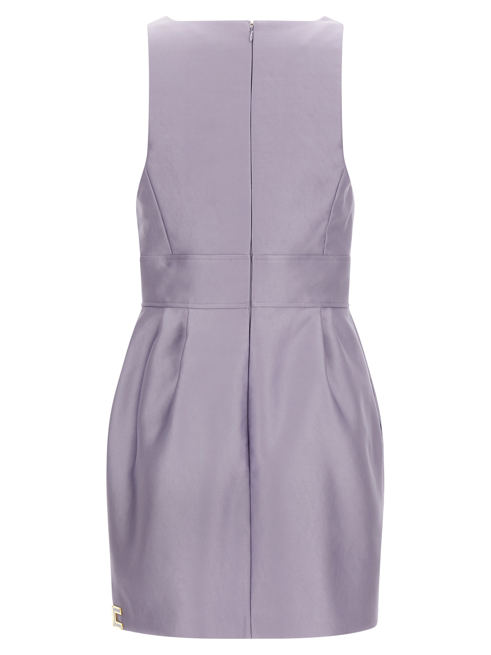 Duchesse міні сукня, круглий виріз, драпірування на лівому плечі, силует пісочний годинник, бічний розріз з металевою аплікацією логотипу, без рукавів, кишені, задня застібка на блискавці, сатинова підкладка.