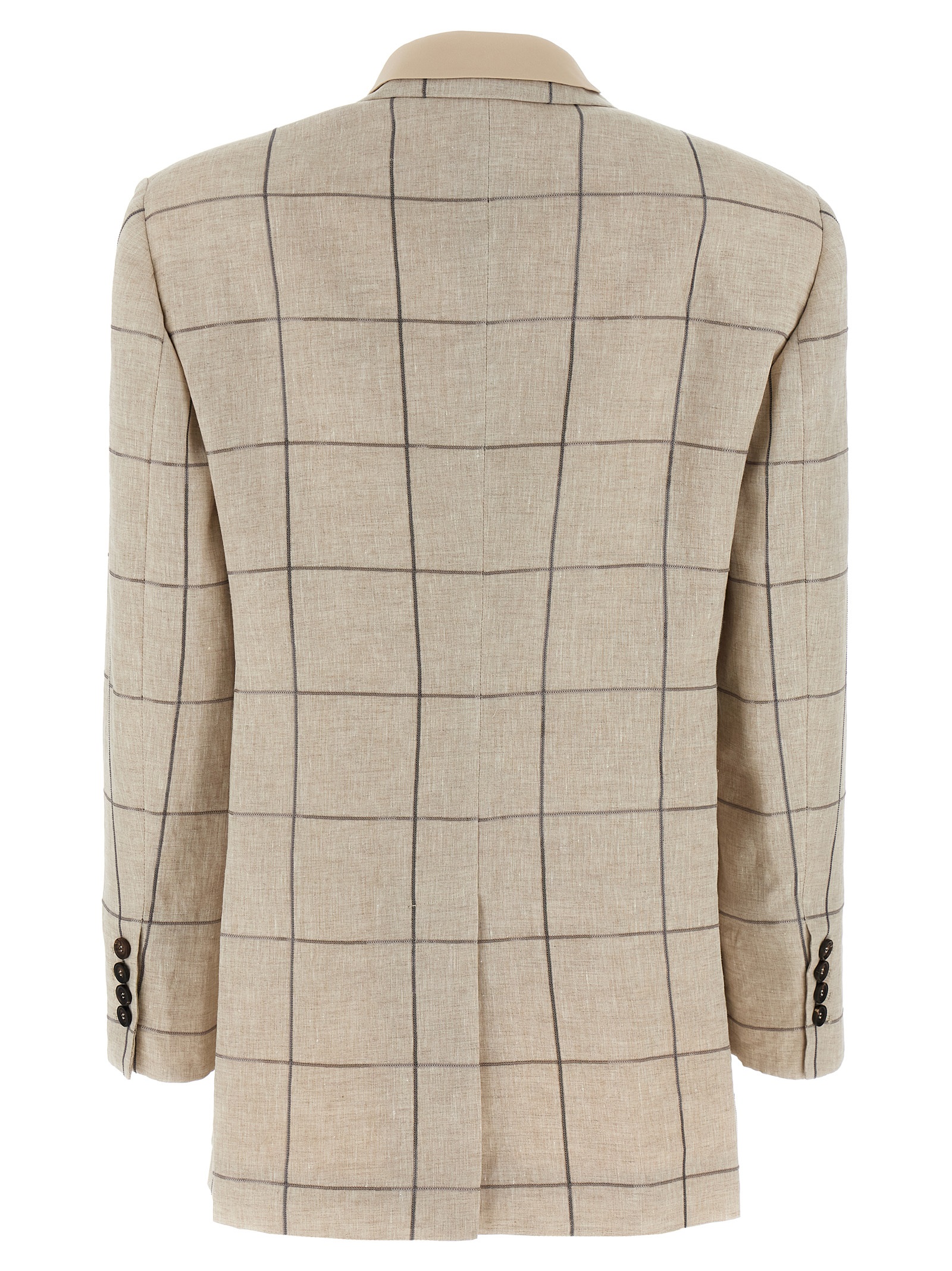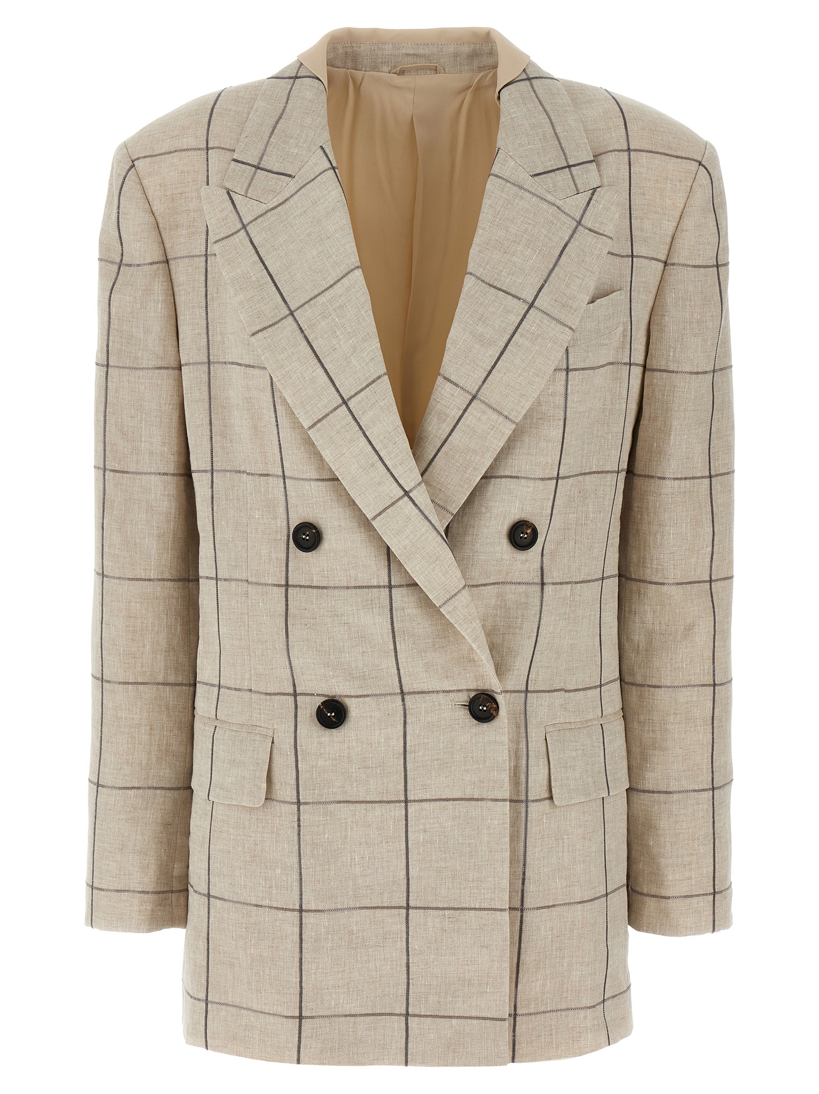 Льняний блейзер. Двобортний стиль, з усіма вишивками в клітинку з мікропаєтками, розріз на спині, довгі рукави з кнопками.