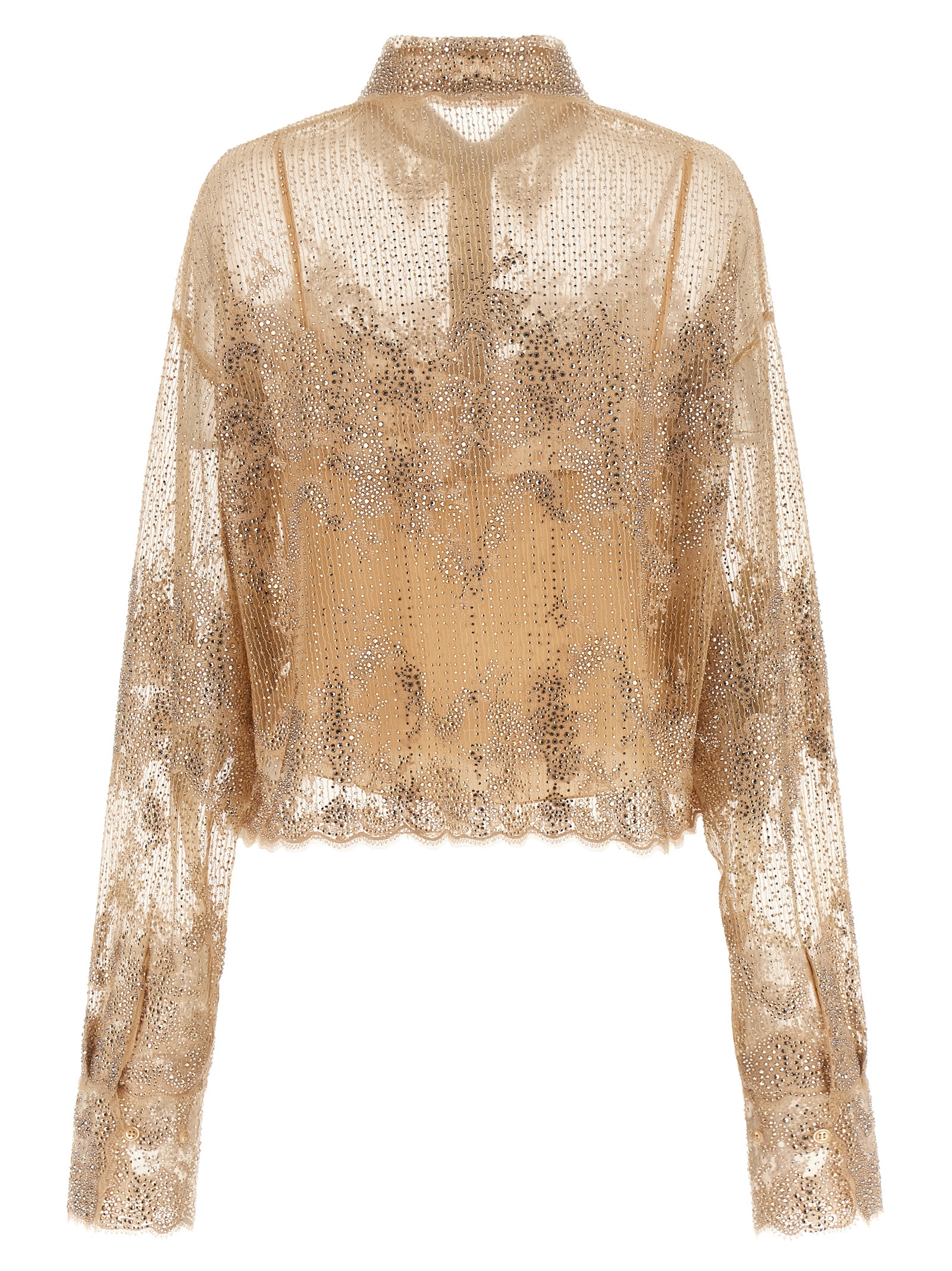 Напівпрозора блуза з тюлю з тотальною кристальною аплікацією та вишивкою, тонко-тонка підкладка з шовкового шифону, знімна підкладка на тонких бретелях, класичний комірець, застібка спереду на приховані ґудзики, трохи укорочений фасон із мереживним низом, довгі рукави з манжетами.
