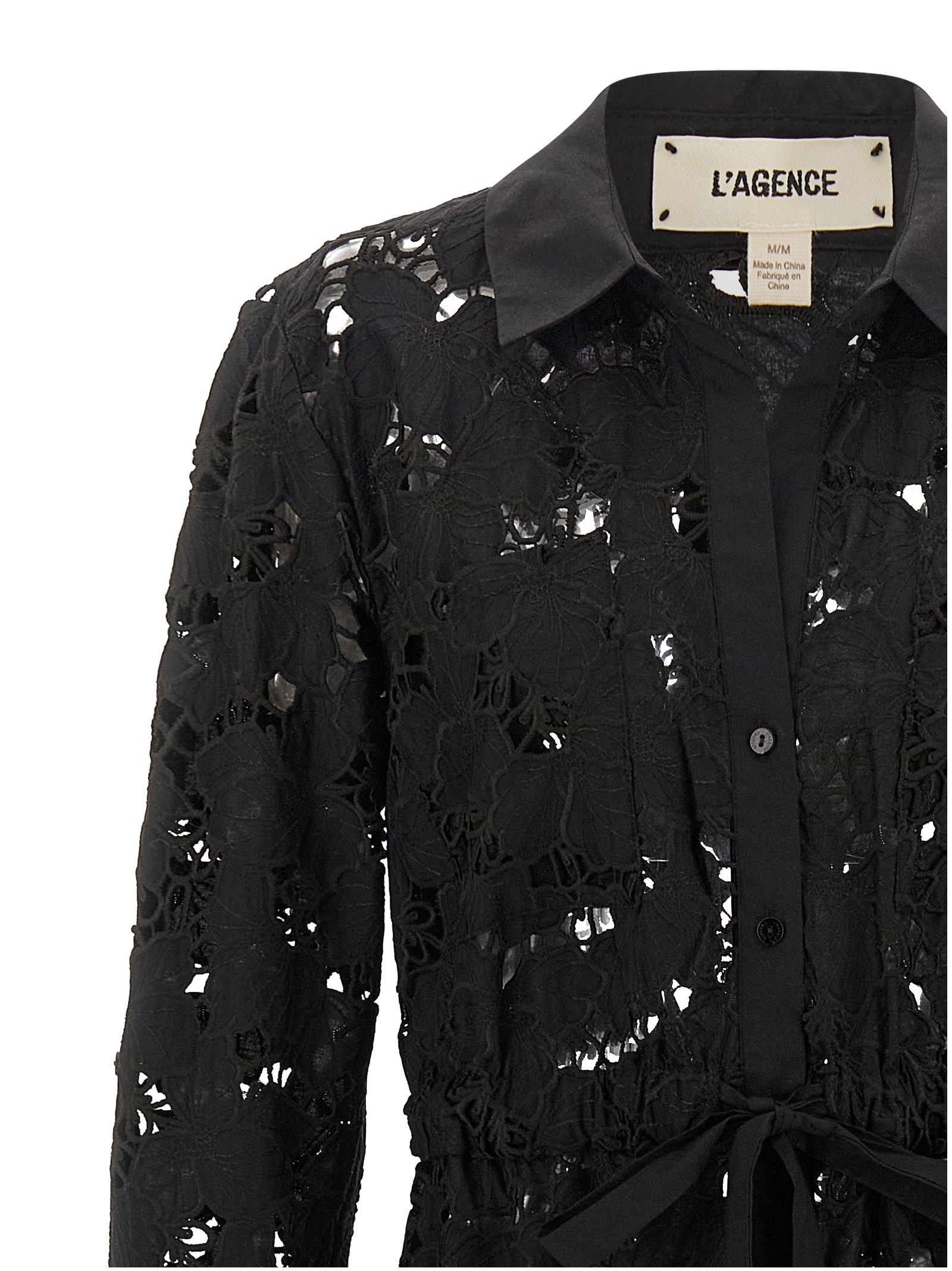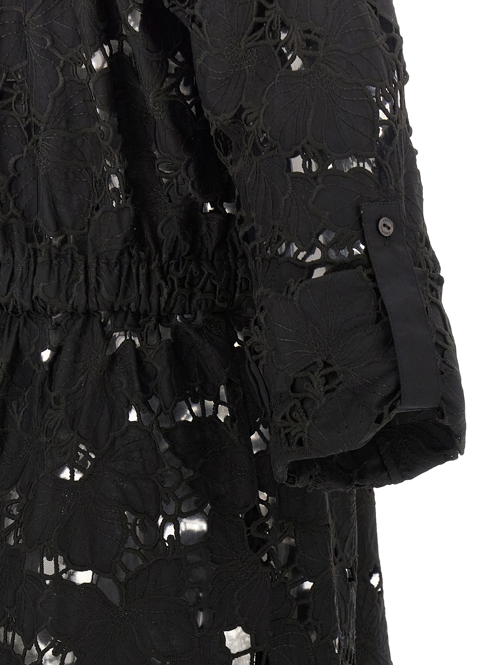 'Emilio' мідісукня з квіткового попліну з мереживом, модель хемізьє, передня застібка на ґудзики, пояс з еластичним шнурком, довгі рукави з манжетами, асиметричний низ, без підкладки.