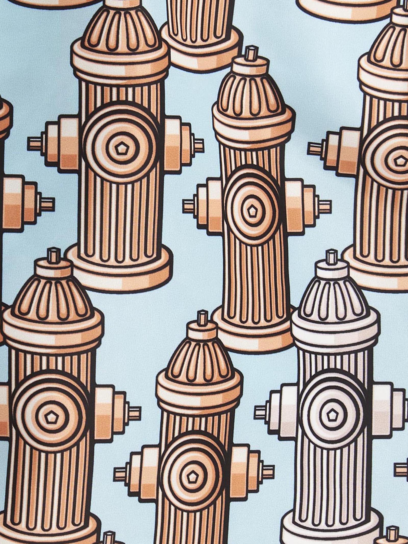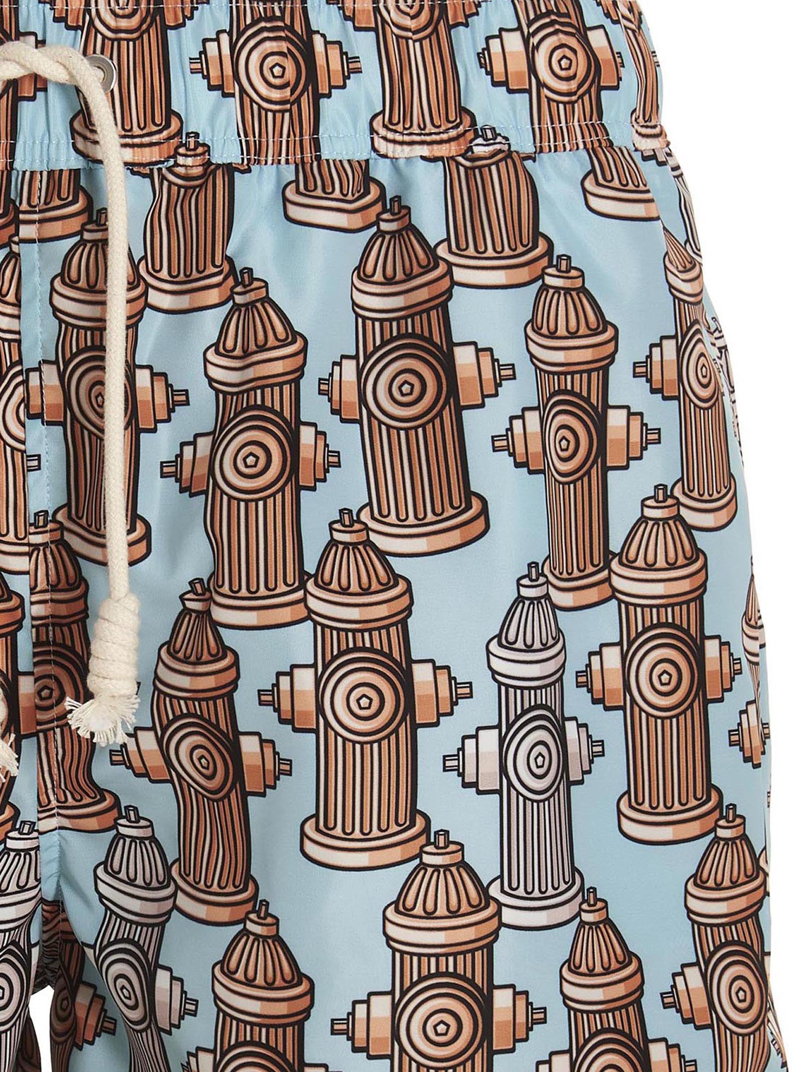 'Fire Hydrant' swim shorts in tech fabric with all-over print, drawstring elastic waistband, pockets, inner mesh briefs.r mesh briefs.