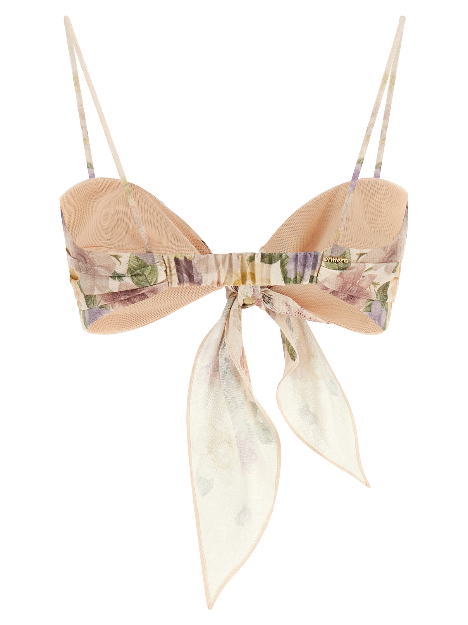 Топ із льону з тотальним квітковим принтом, спереду зав'язка-бантик, тонкі регульовані бретелі, заокруглені боки, еластична спинка і металева деталь з логотипом.