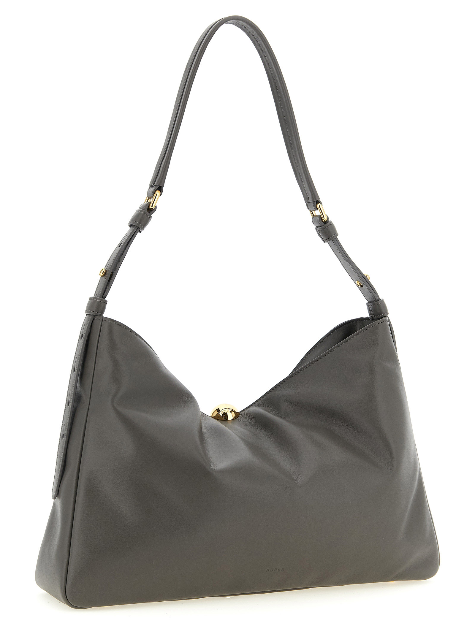 Велика 'Furla Sfera Soft' сумка через плече з м'якої гладкої нубукової шкіри, магнітна застібка, прикрашена металевими елементами, передній тиснений логотип, регульована ручка, жорстке дно з металевими ніжками.