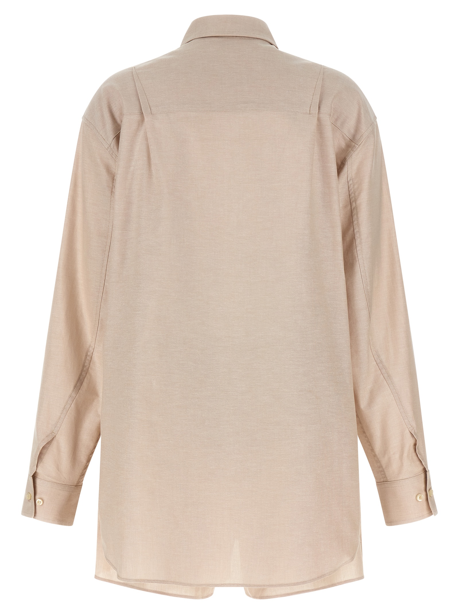 Солідний оксфордський бавовняний костюм Georgiana Set, що складається з сорочки з гострим коміром, застібкою на ґудзики спереду, нагрудним кишенею, довгими рукавами з манжетами та спущеними плечима, бічними розрізами та боксерськими шортами, еластичним поясом, ілюзійним клапаном з ґудзиками, кишенями, бічними розрізами.
