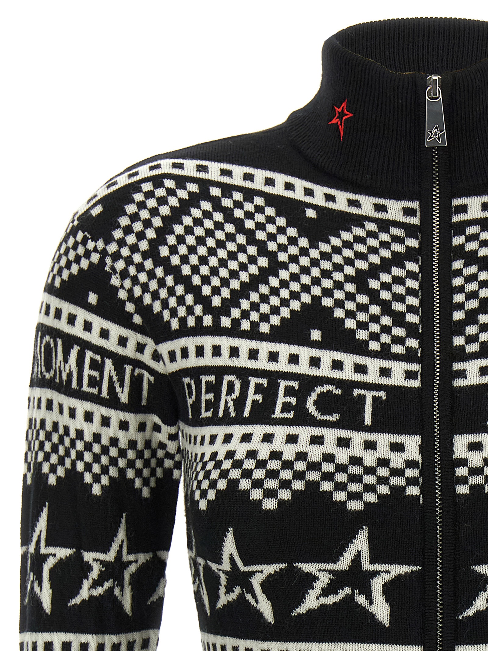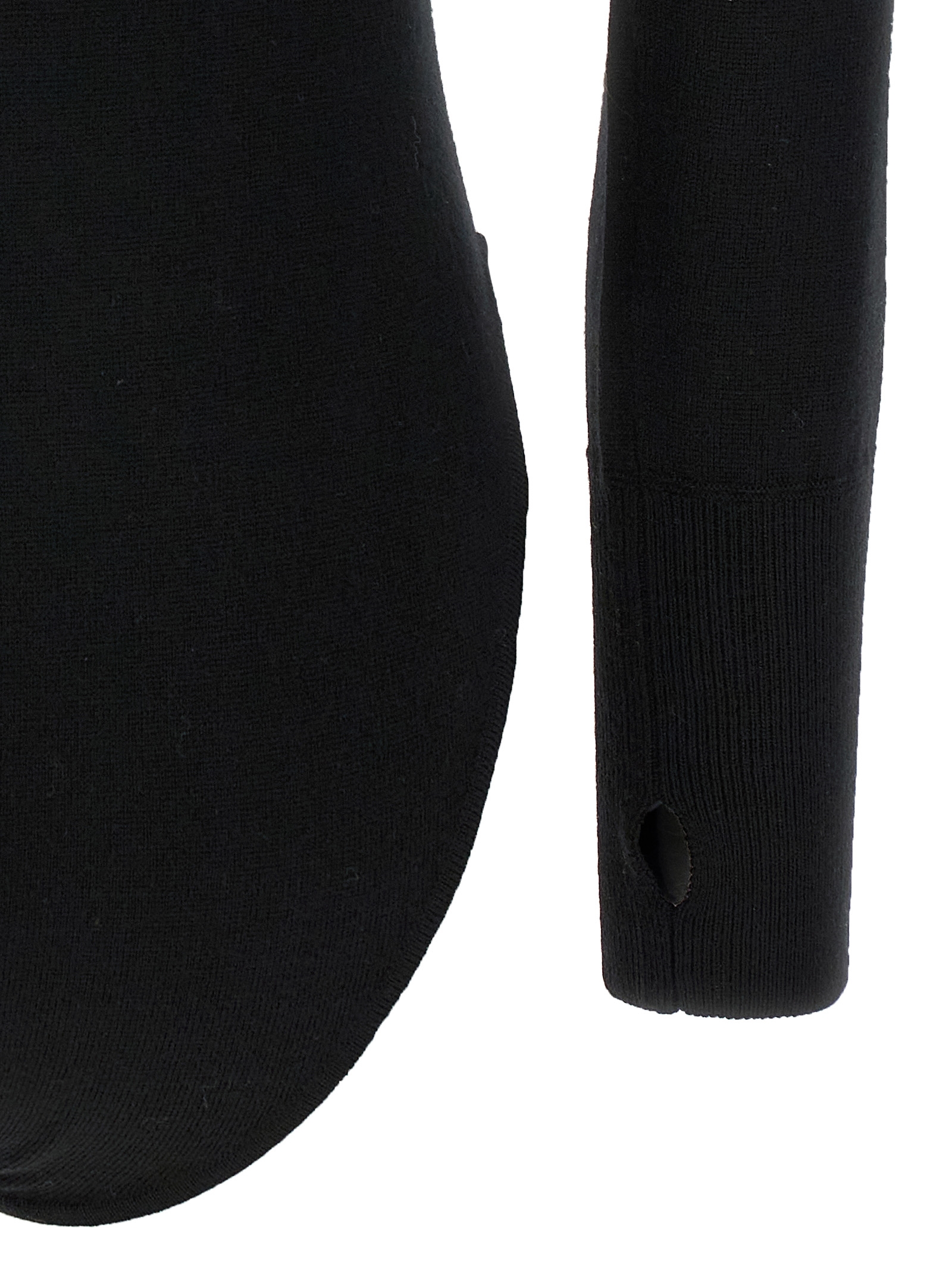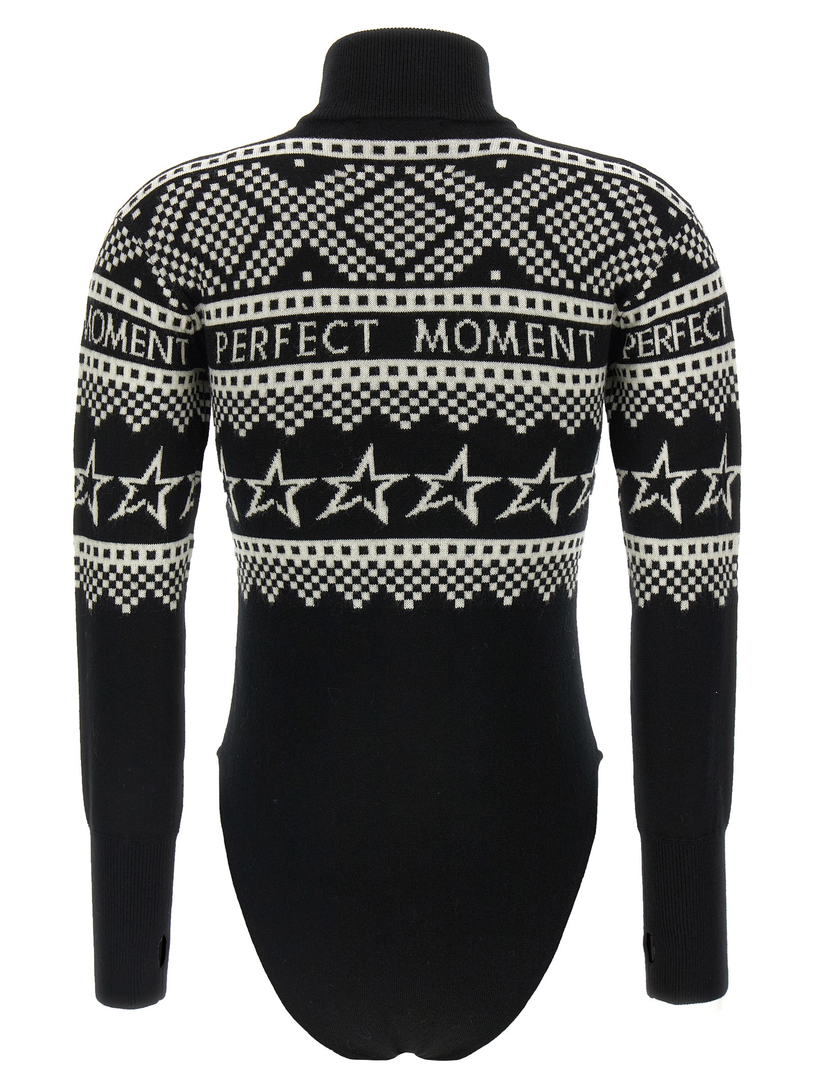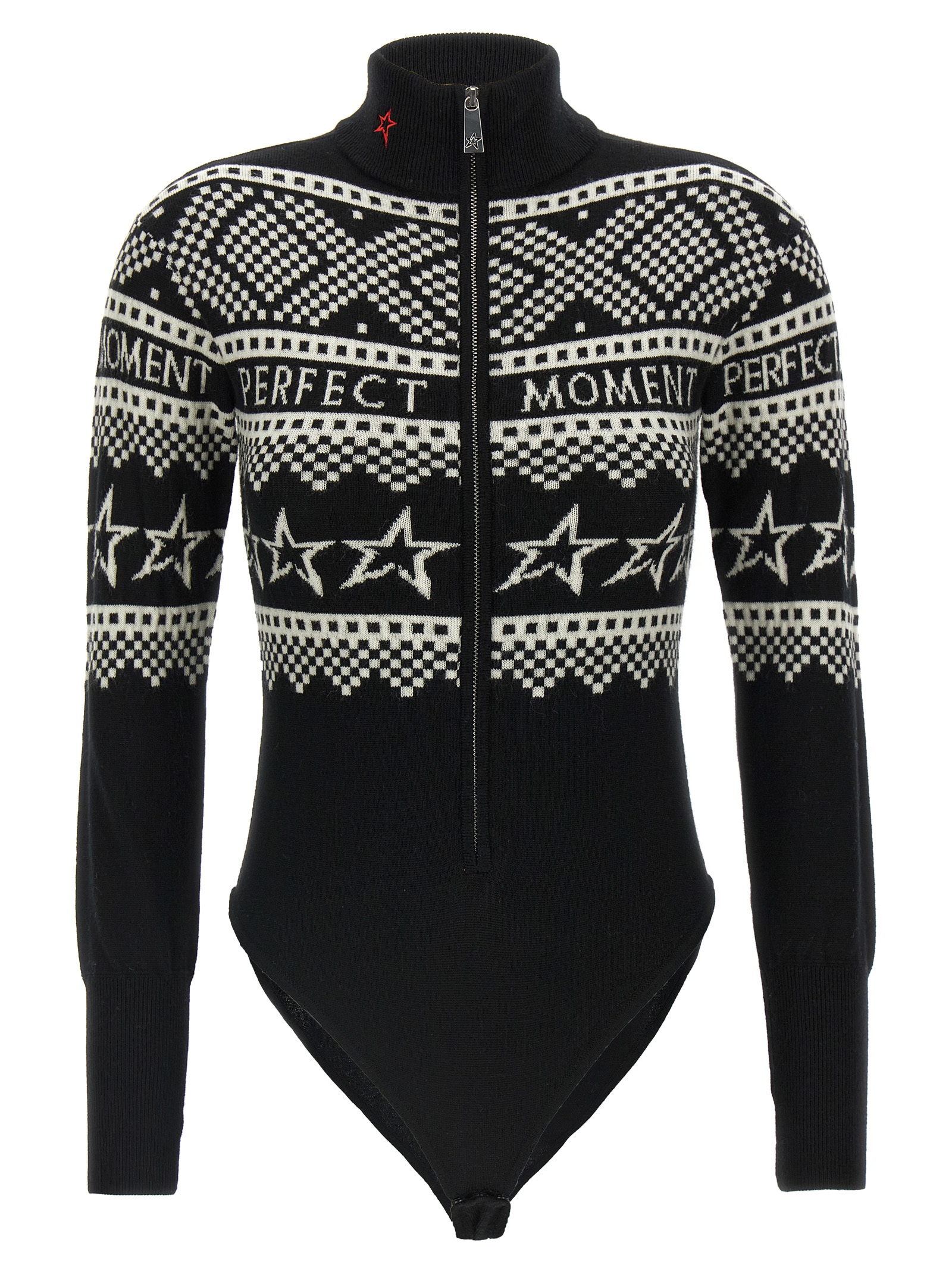 'Holiday' боді з мериносової вовни з вставками, високий комір з вишивкою логотипу, передня застібка на блискавці, довгі рукави з манжетами, кнопки на подолі.