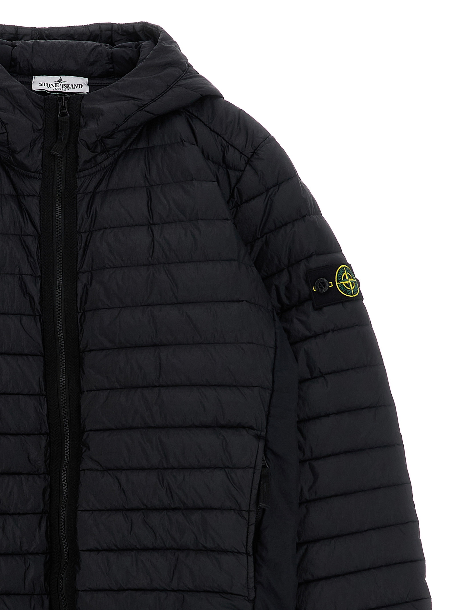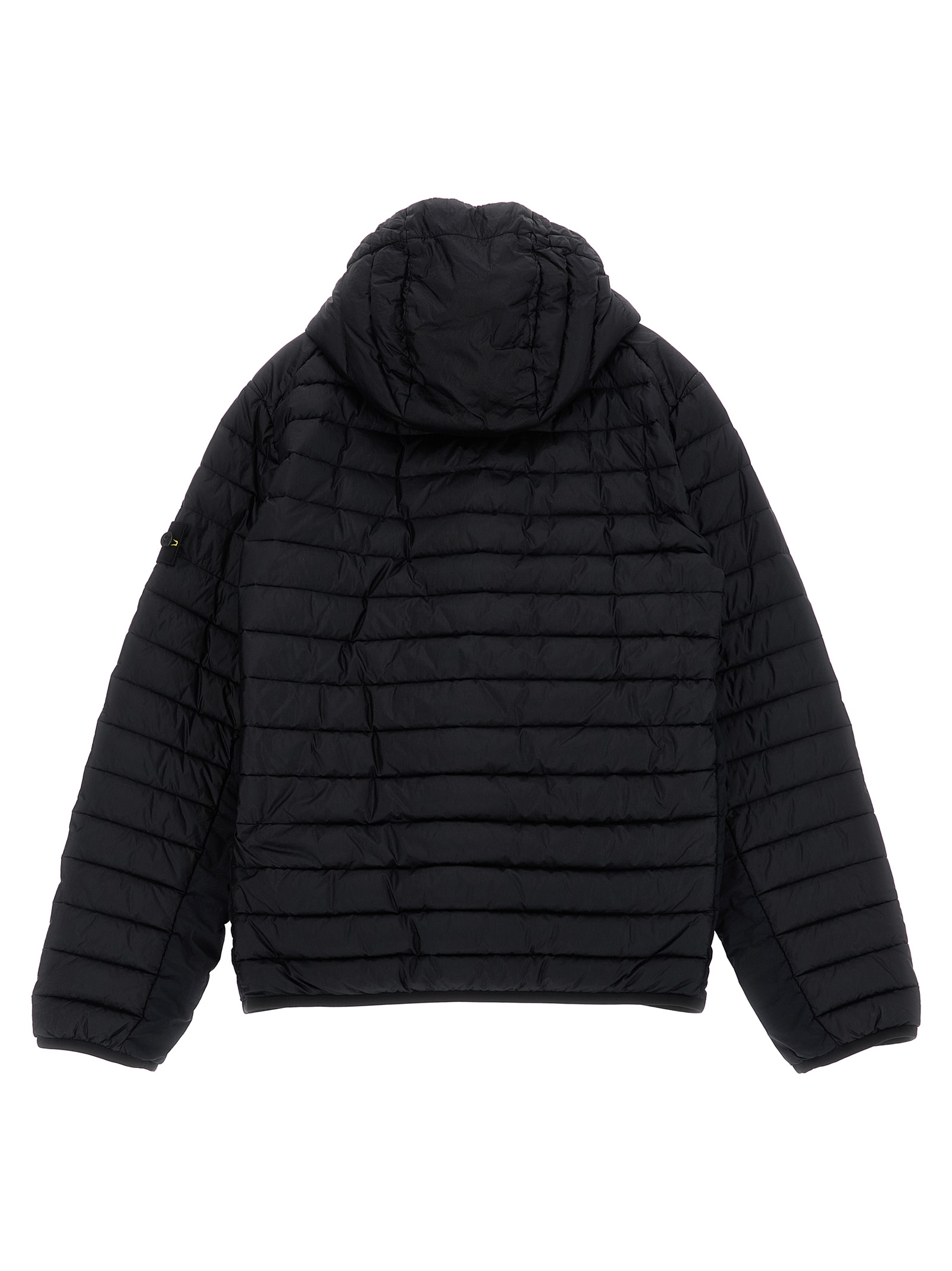 Стьобана куртка з технічної тканини з ефектом прострочки і злегка утеплена гусячим пухом, капюшон, високий комір, передня застібка на блискавку, кишені, довгі рукави з еластичними манжетами і аплікацією з логотипом, еластичний низ.