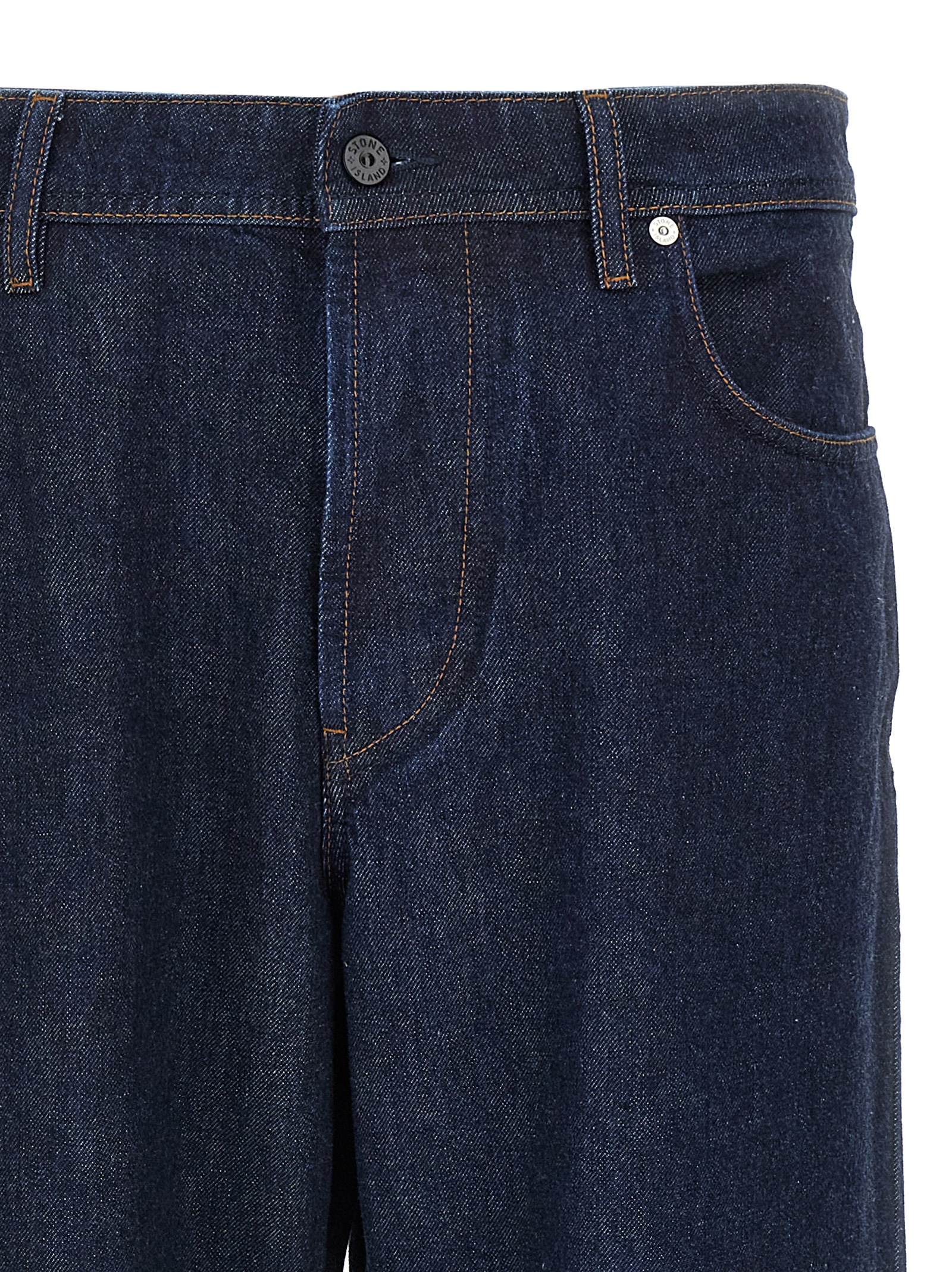 Індиго бавовняні джинси з деніму з контрастною строчкою, широкий і прямий крій, застібка на гудзиках спереду, п'ять кишень, логотип на задній частині в тон.
