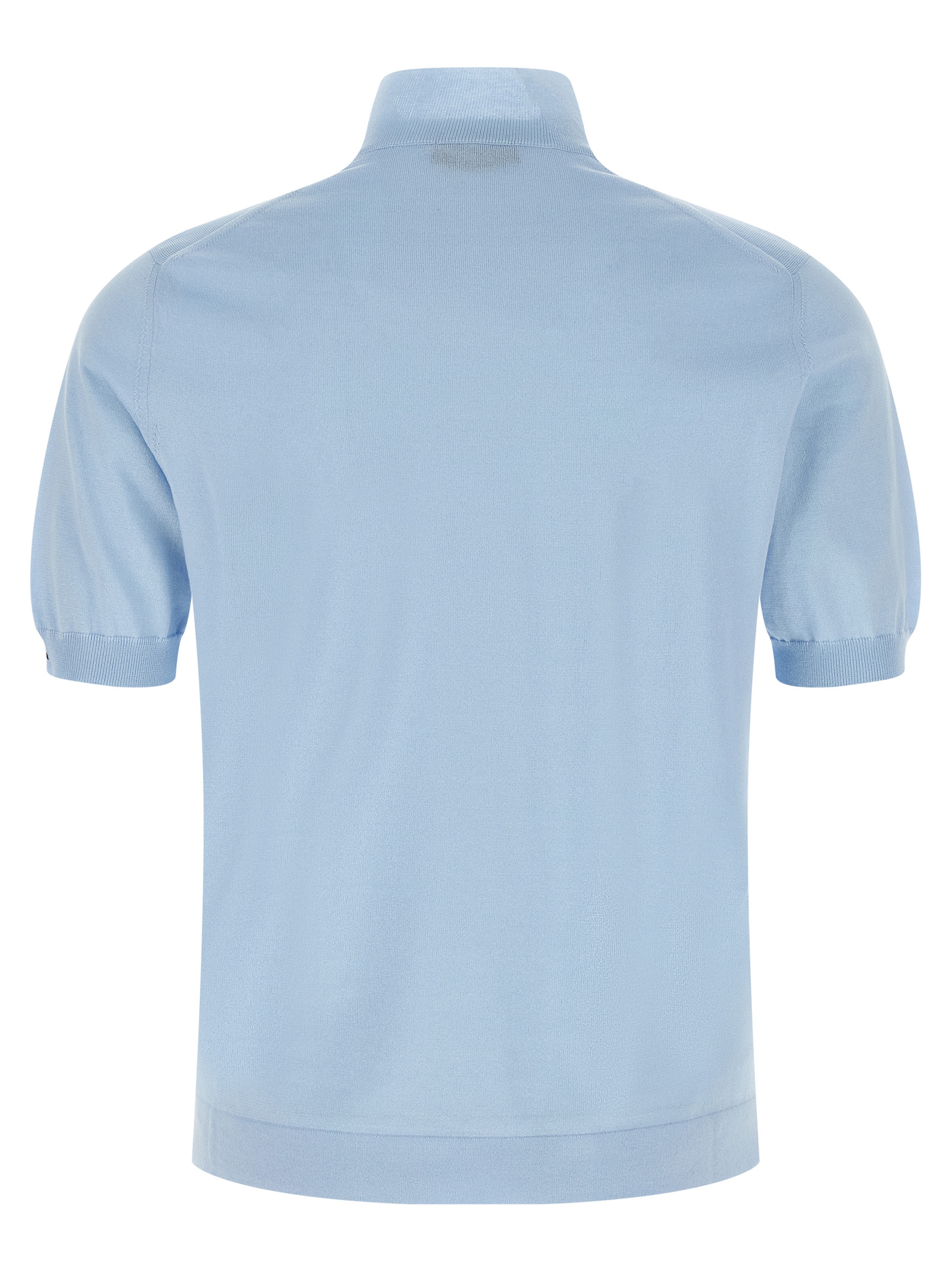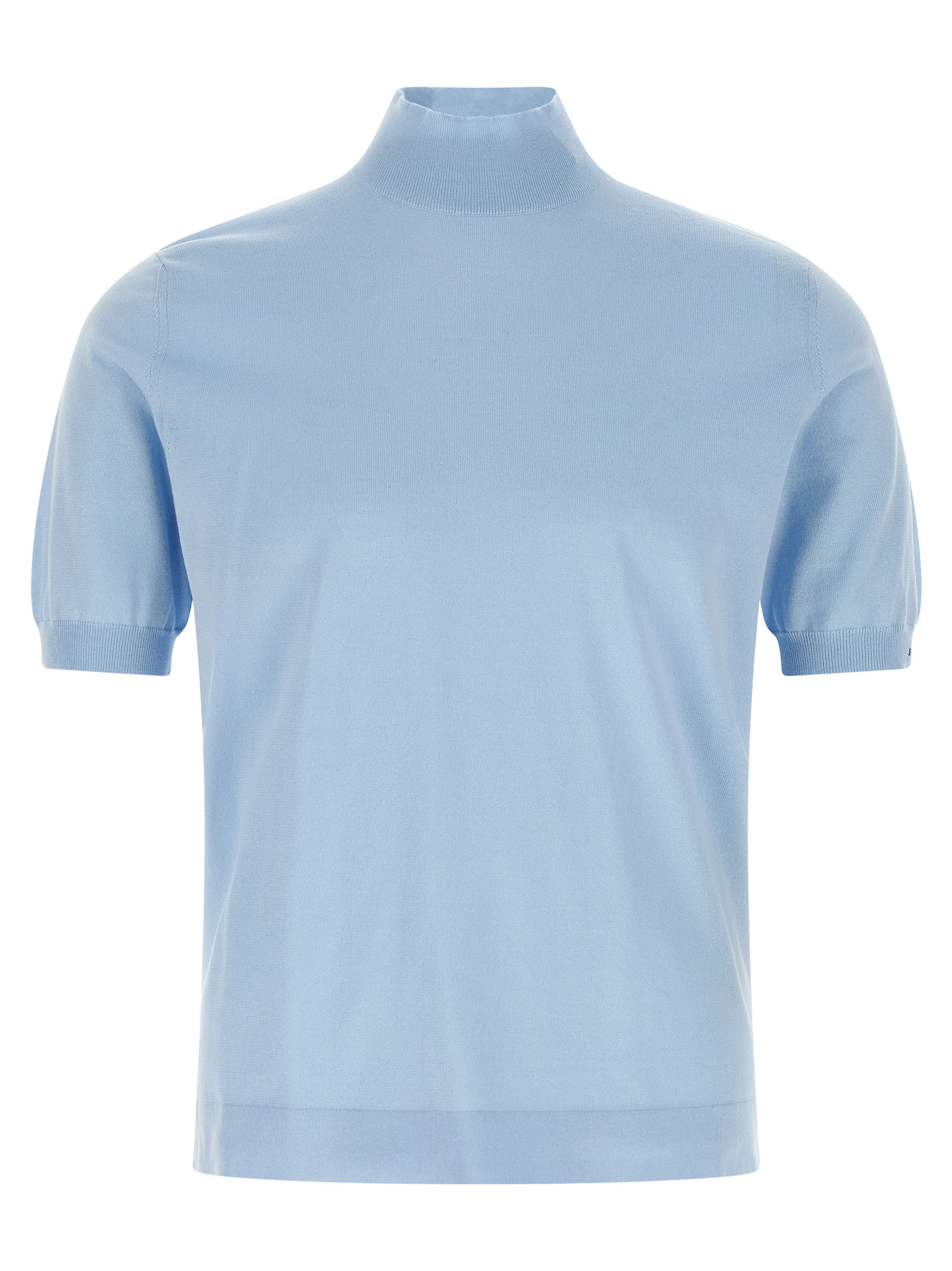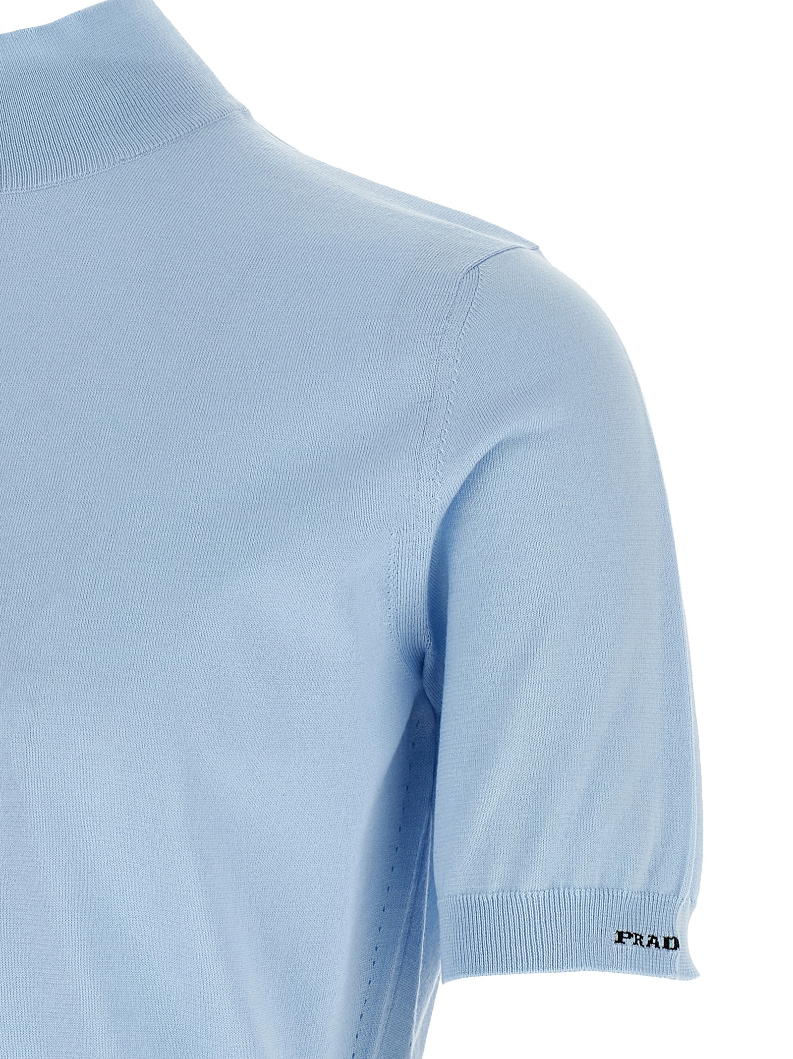 Светр тонкості 18 з підстриженої легкої бавовни, піднятий комір, короткі рукави зі злегка спущеними плечима, вшиті манжети та логотип із написом.