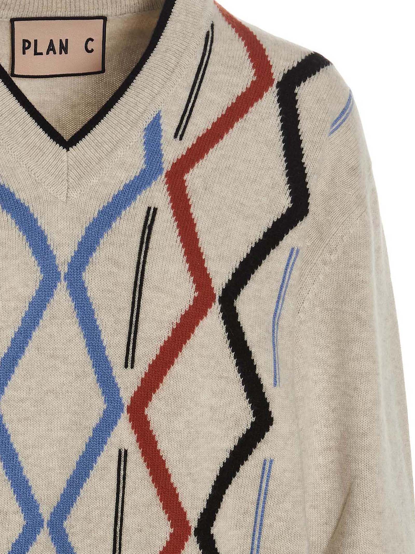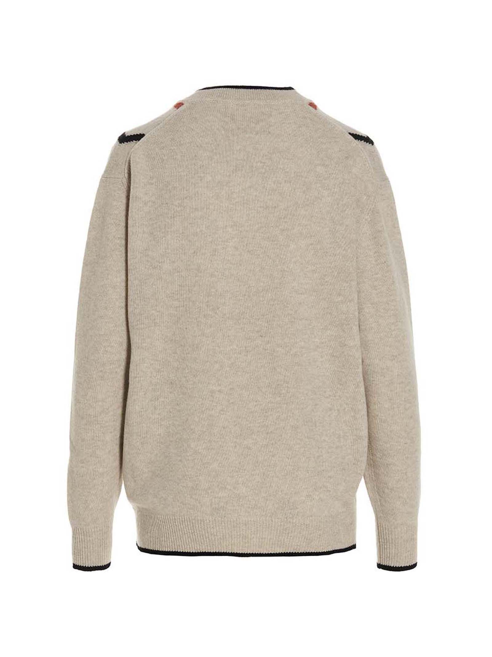 Светр з вовни та кашеміру з переднім жакардовим малюнком, V-подібним вирізом, довгими рукавами з манжетами.