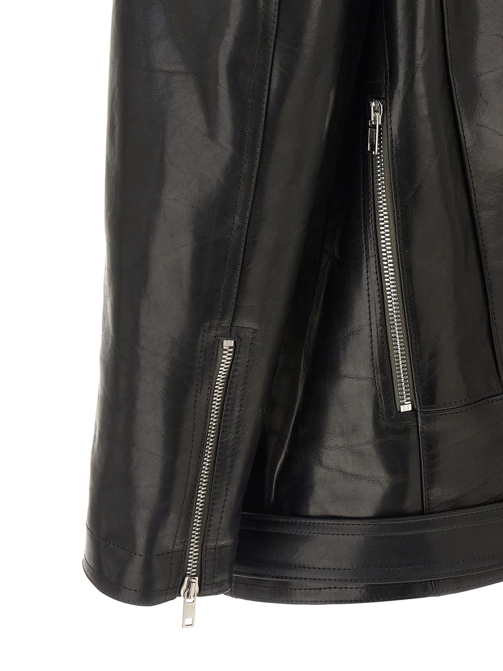 'Jumbo Bauhaus Stooges' куртка з блискучої та щільної рослинно дубленої бичачої шкіри з натуральним воском, двобортний байкерський стиль із передньою асиметричною застібкою на блискавку, широкий комір, кишені, довгі рукави з блискавками на манжетах, знаки на плечах, підкладка, знімний пояс.