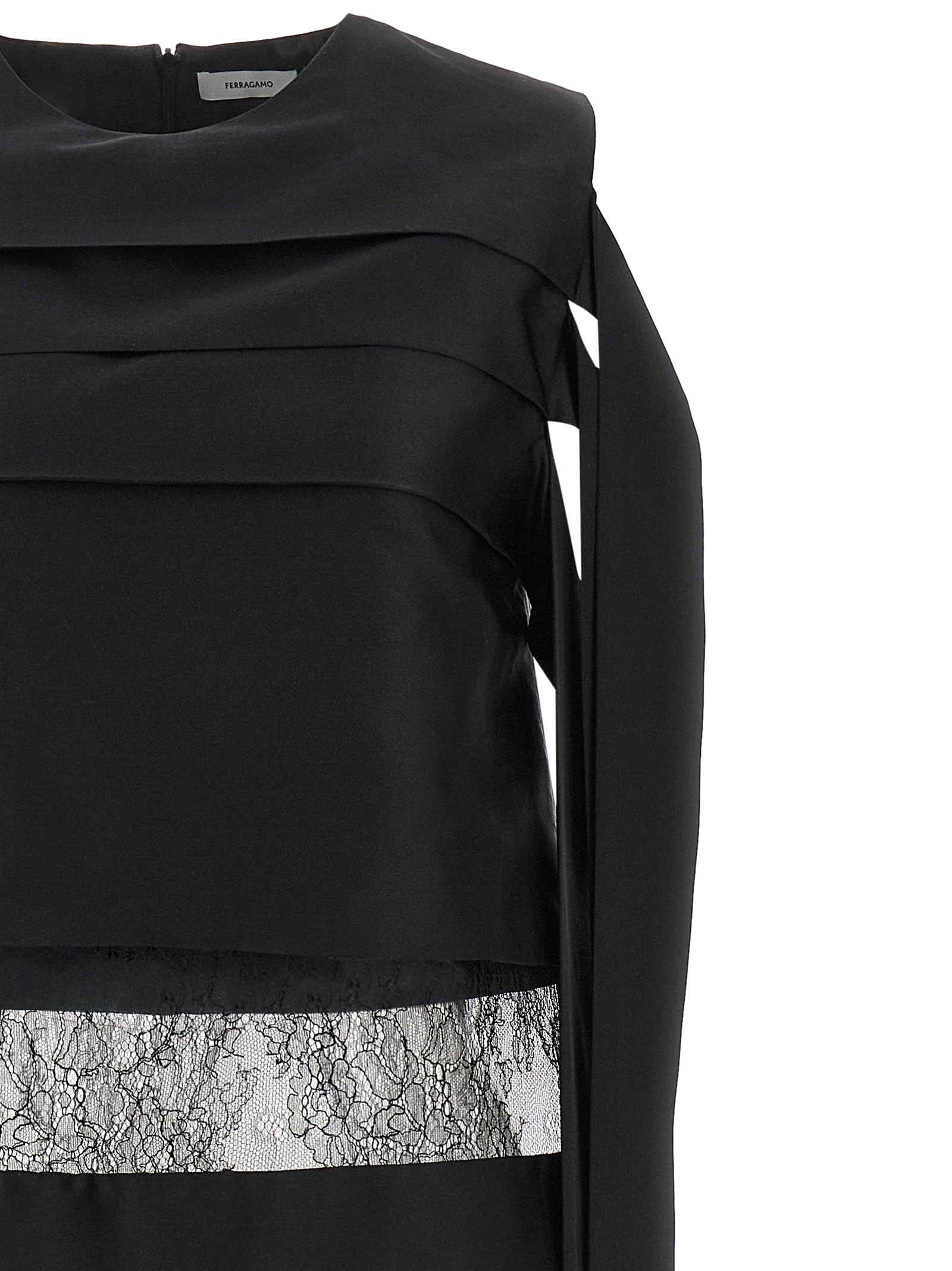 Міні-сукня з чистого шовку з центральною нашивкою мережива того самого тону, кутюрна конструкція з горизонтальних воланів, від яких відходять максі-стіжки, пряма силуетна лінія, круглий виріз, без рукавів, застібка на блискавку ззаду.