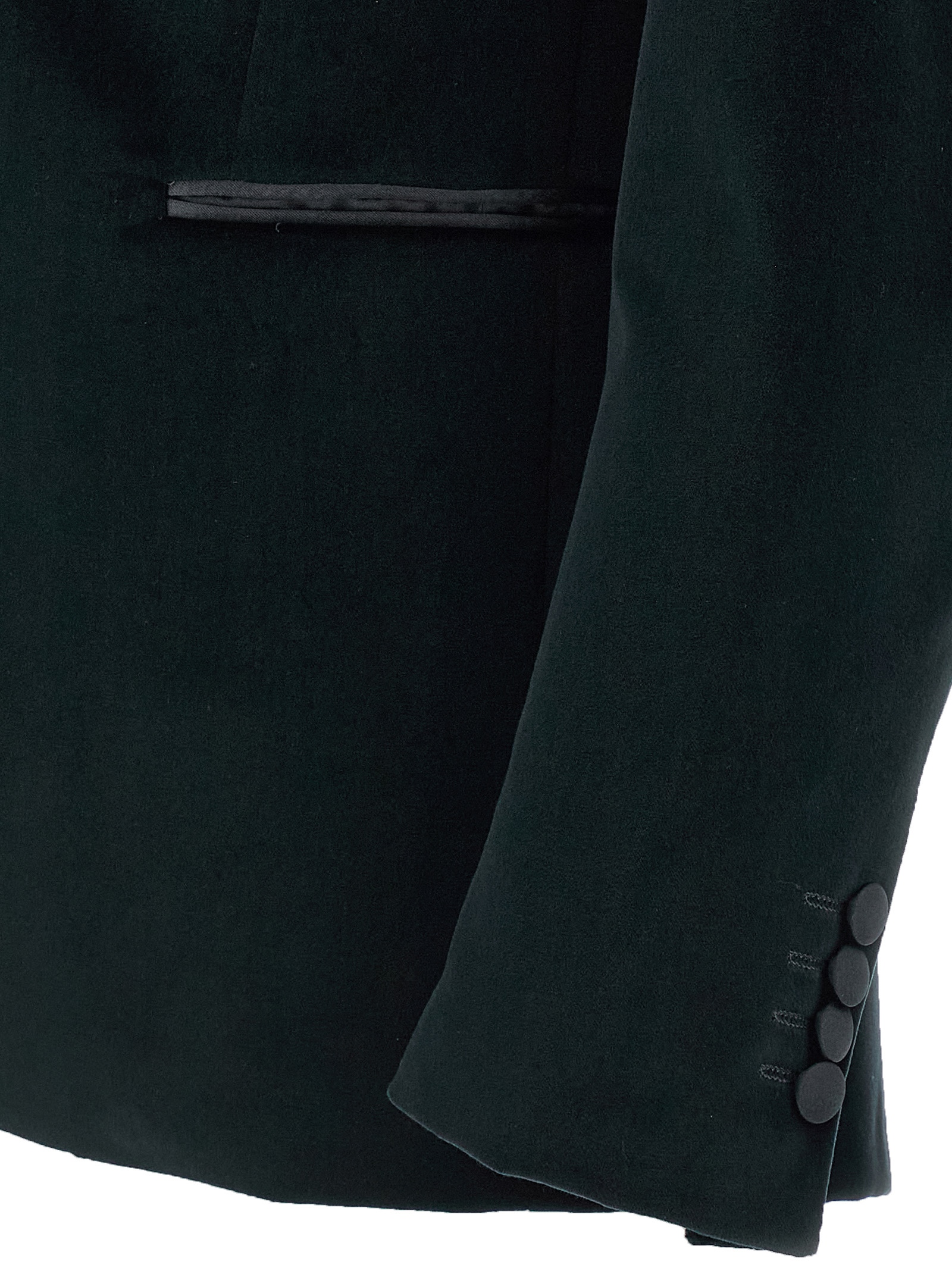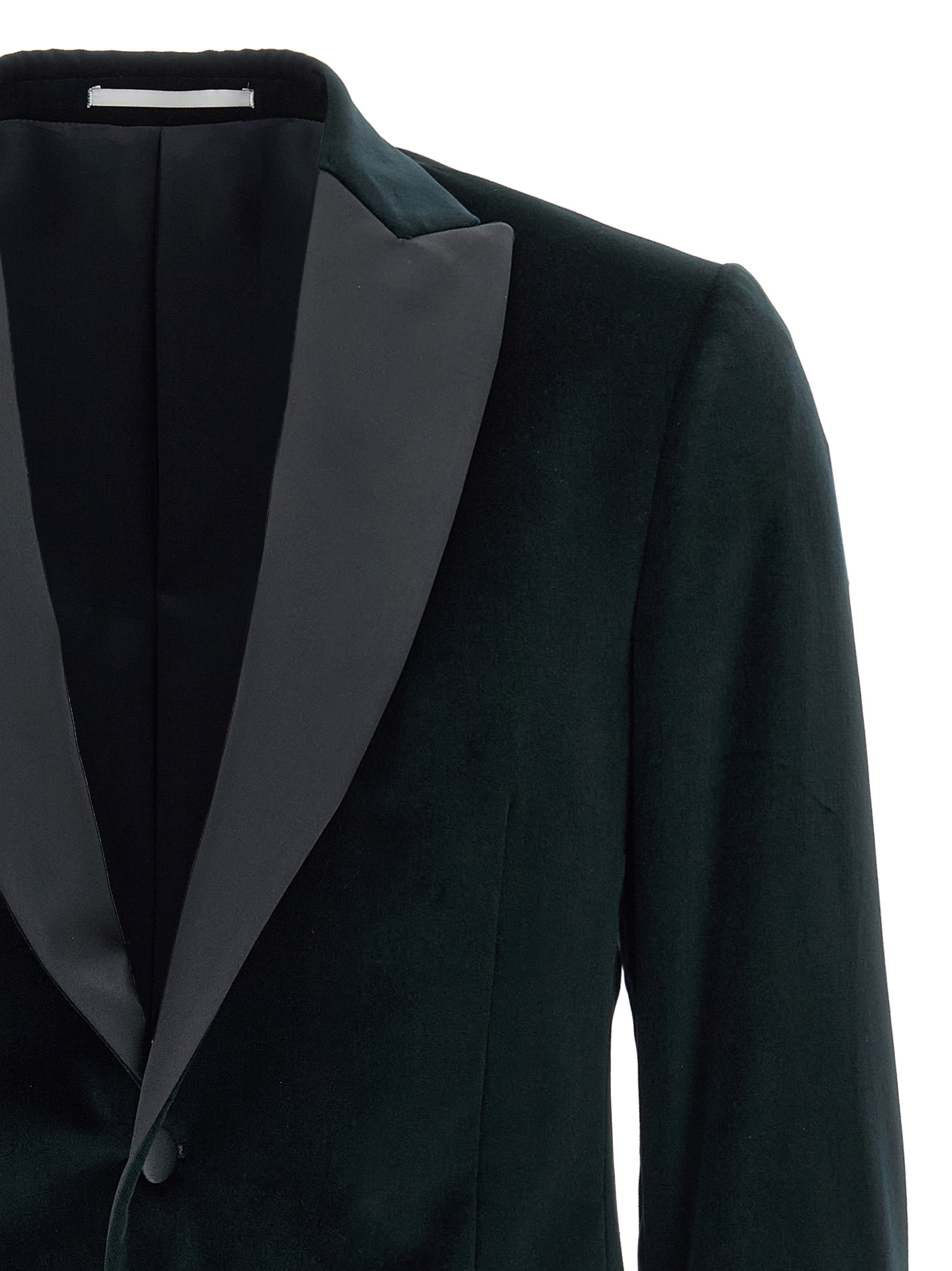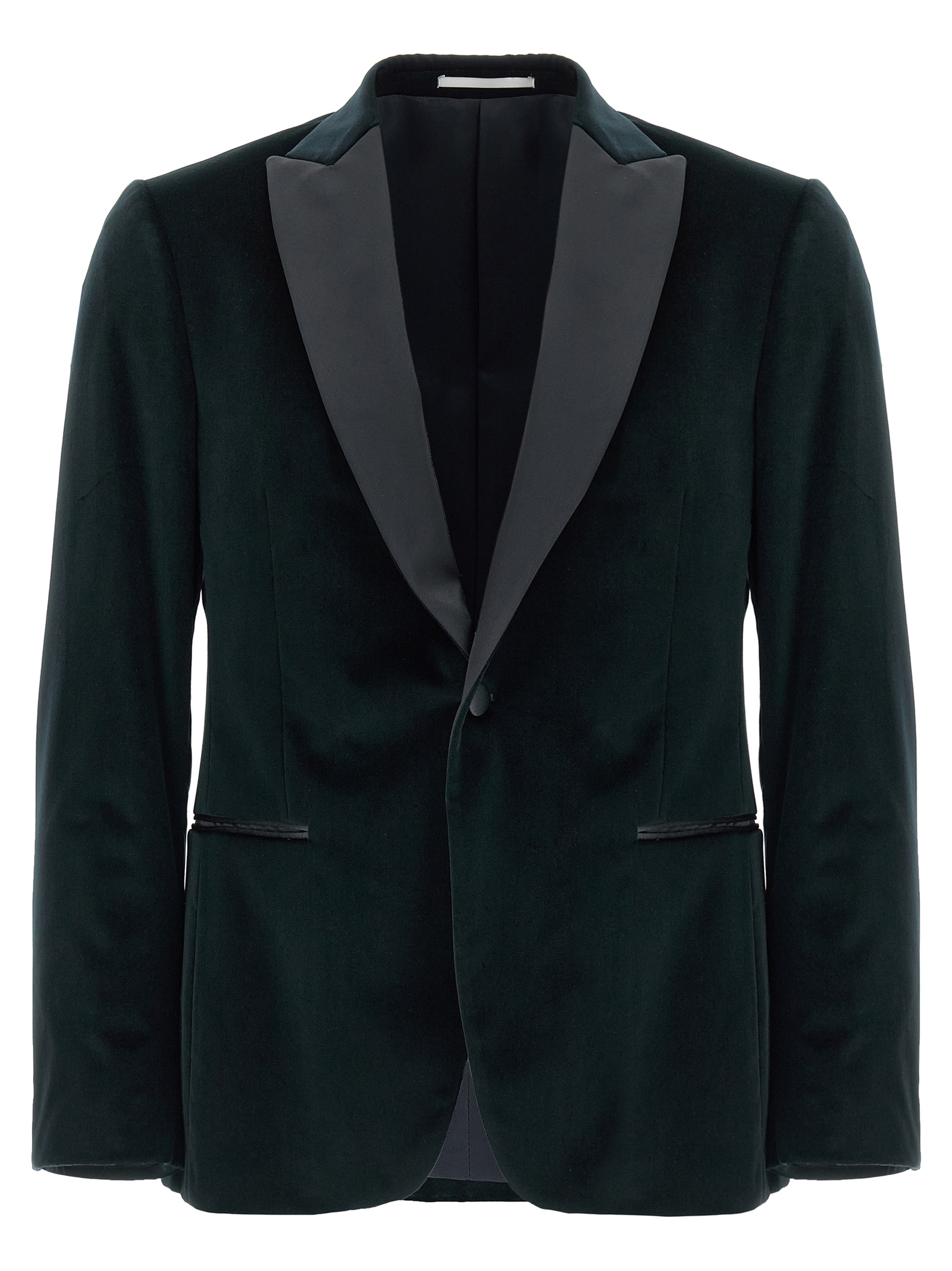 Однобортний блейзер з бавовняного оксамиту 'linea Cerimonia' з однією застібкою на гудзик, контрастними сатиновими піковими лацканами, нагрудною кишенею, клапанними кишенями, підкладкою з віскози, двома внутрішніми кишенями, манжетами на гудзиках, задніми вентиляційними отворами.