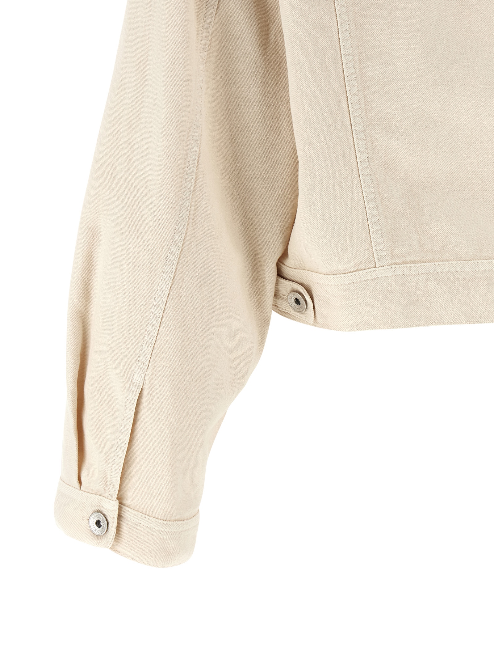 Жакет із бавовни й льону з діагональною текстурою, без підкладки, комір-рубашка з деталлю Monile на спинці, передня металеві ґудзики, кишені, довгі широкі рукави з манжетами і заниженими плечима.