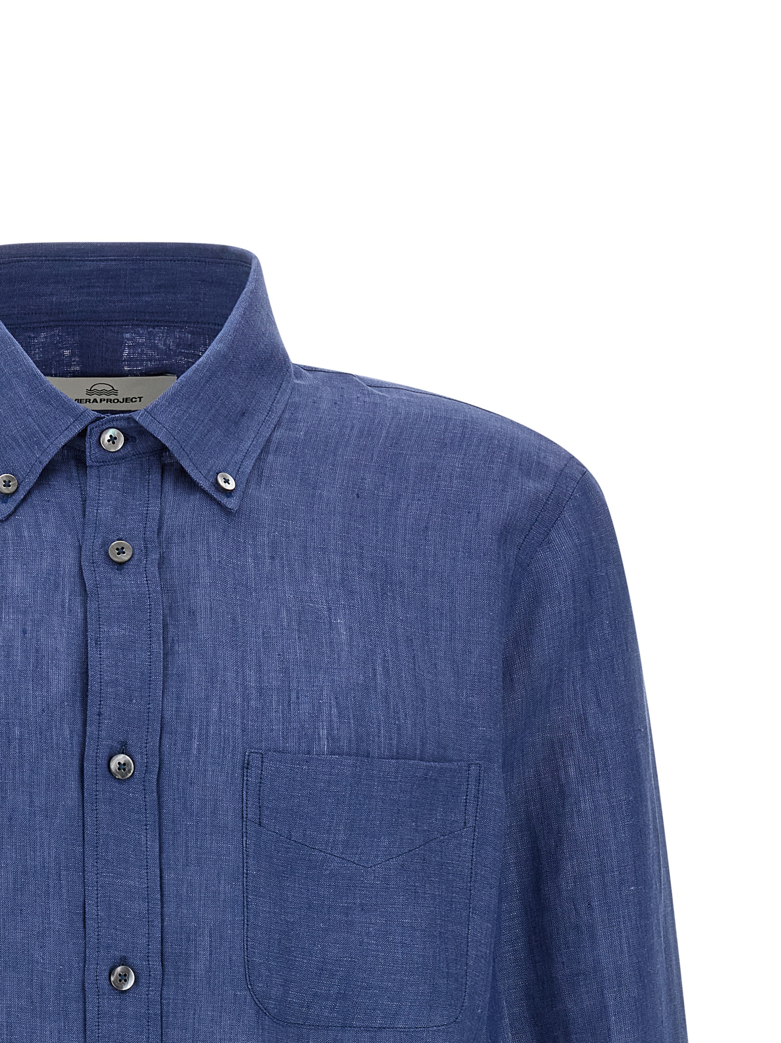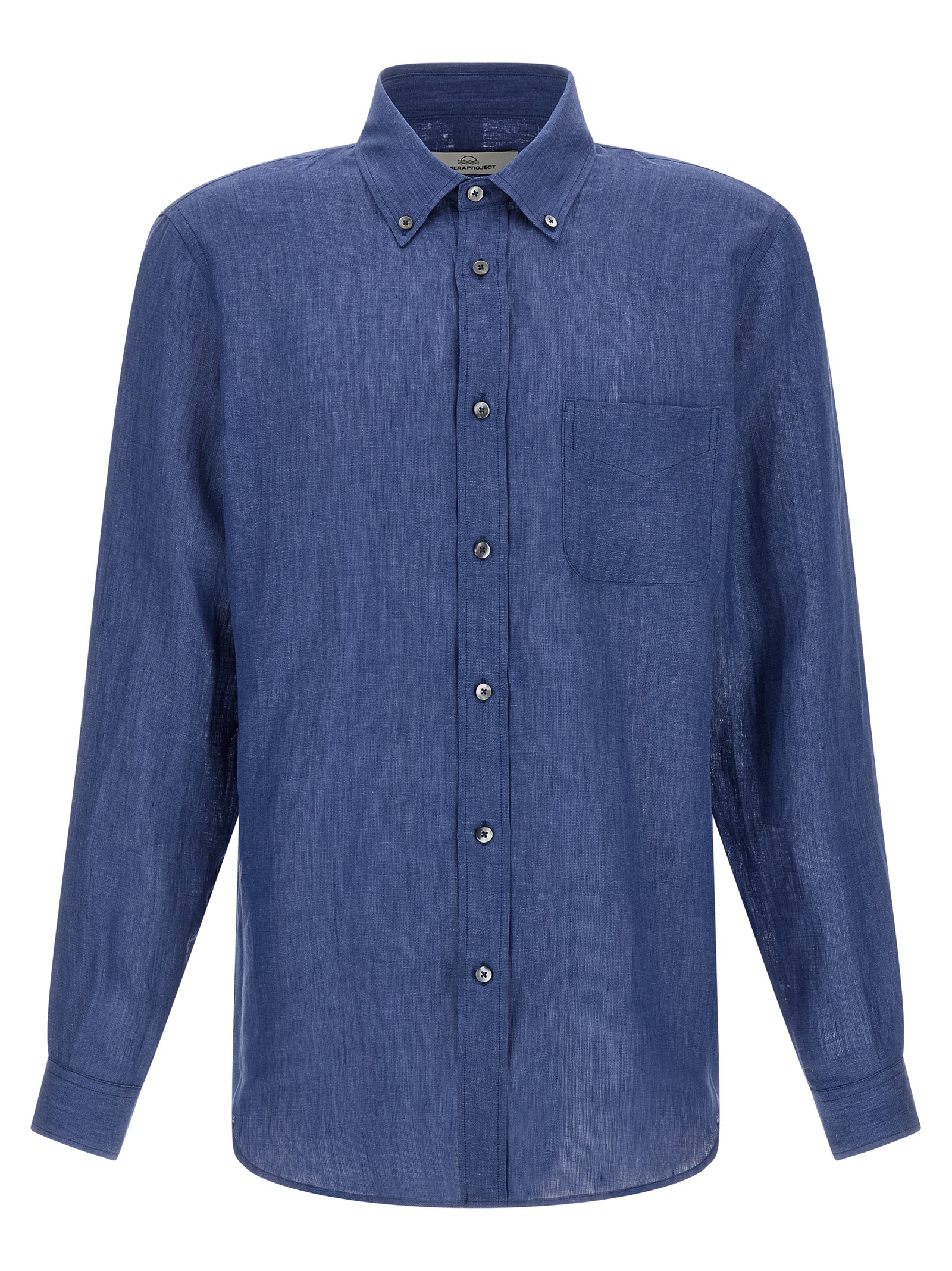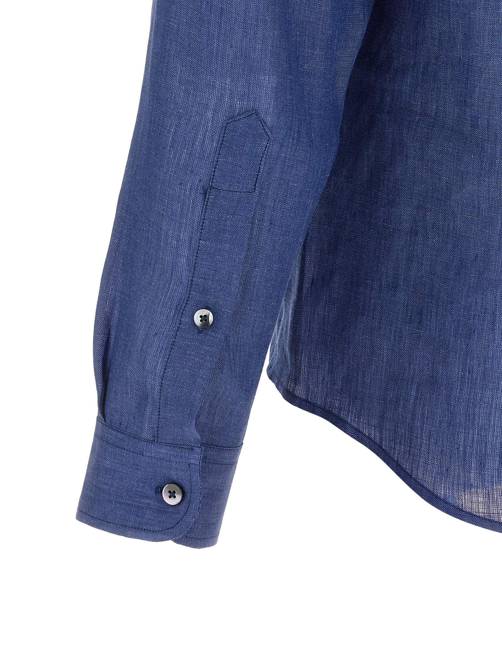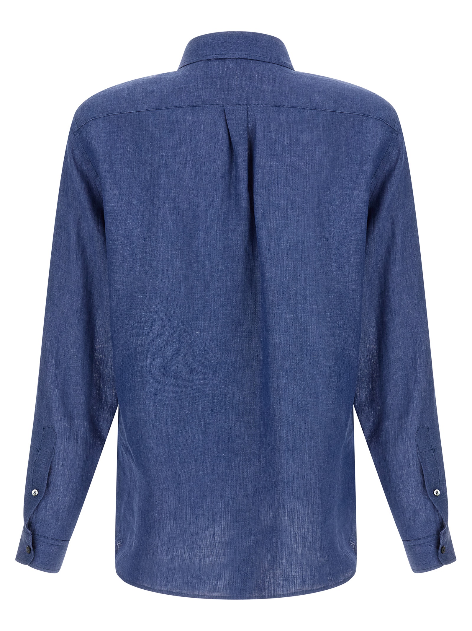 Лляна сорочка, модель з відкладним коміром на ґудзики, передня застібка на перламутрові ґудзики, нагрудна кишеня, довгі рукави з округленими манжетами, спинка з швом і канонічними складками, круглий низ.