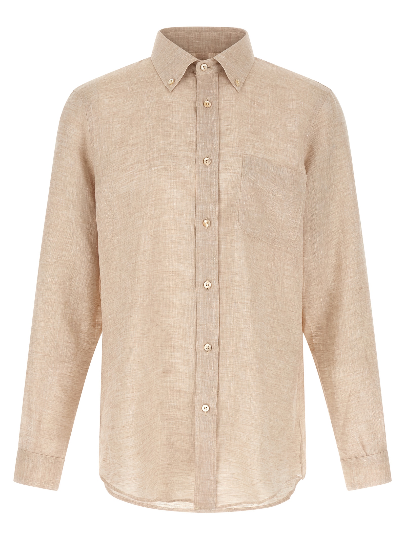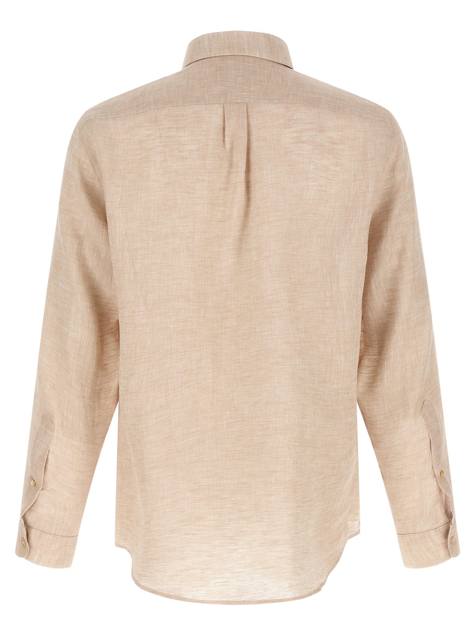 Лляна сорочка, модель на ґудзиках, застібка спереду з перламутровими ґудзиками, нагрудна кишеня, довгі рукави з округлими манжетами, спинка з швом та кулісними складками, округлий поділ.