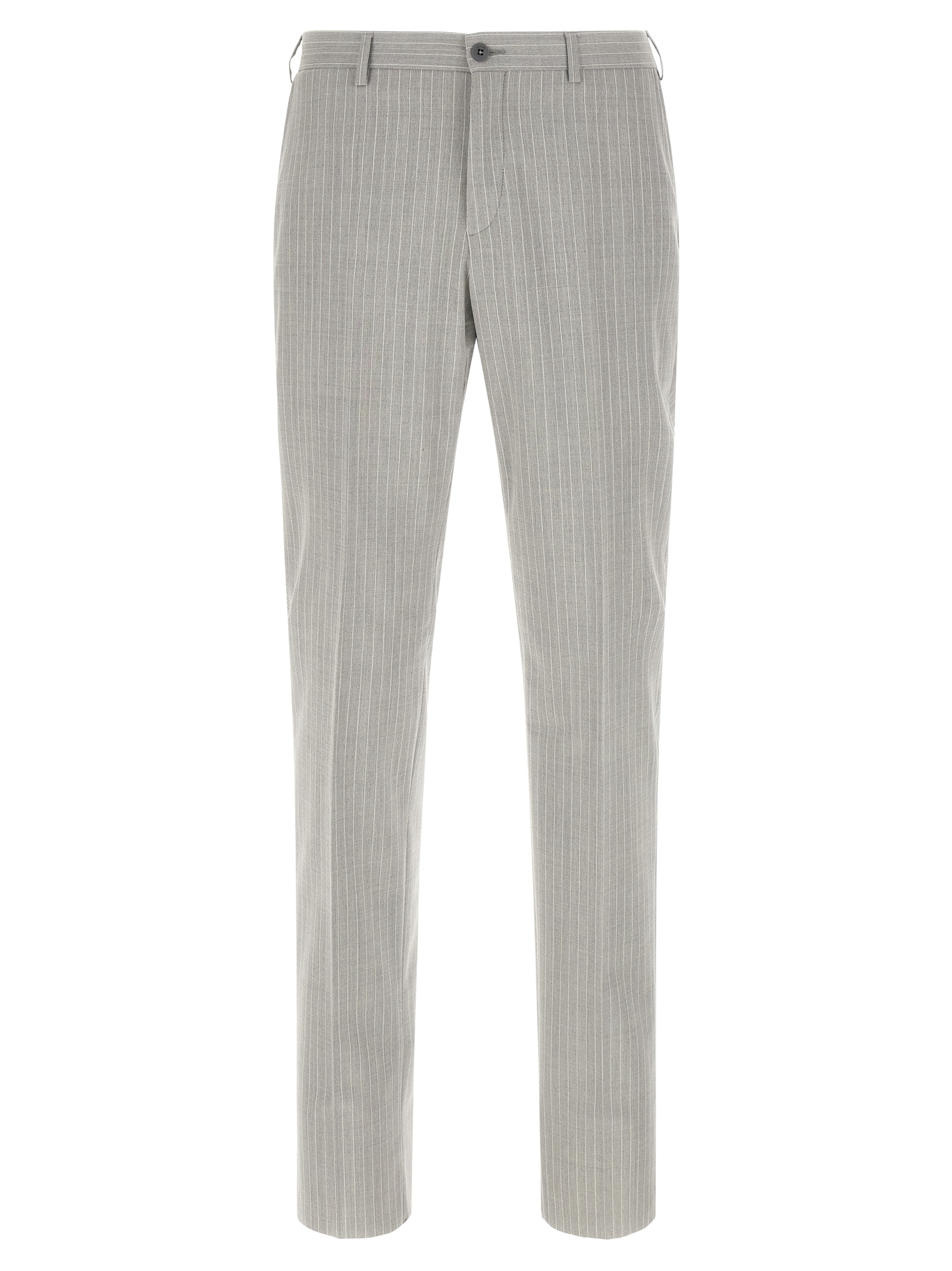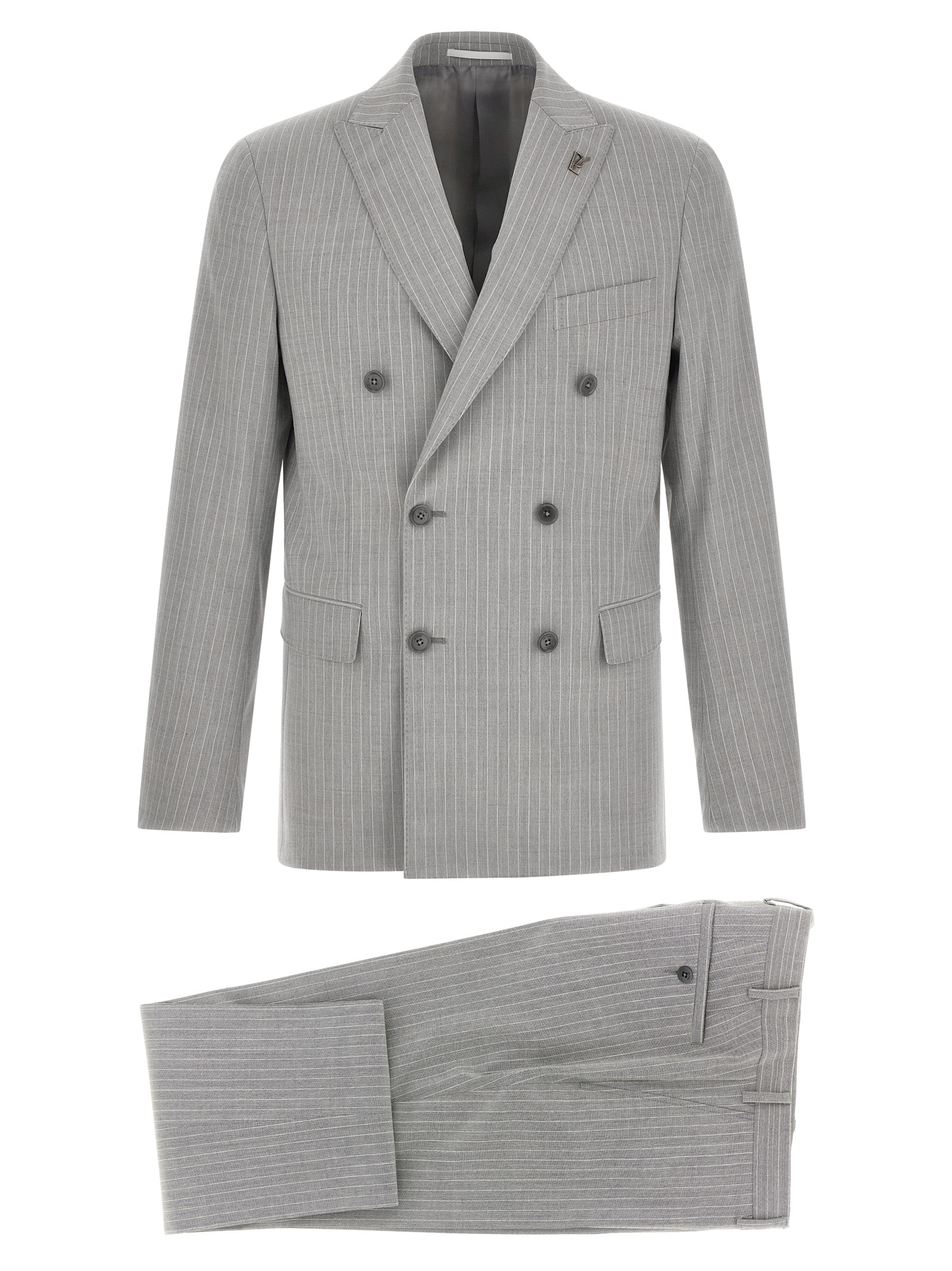 'Lord' сукня з візерунком в смужку з вовняної суміші, що складається з двобортного піджака з передньою застібкою на гудзиках, пікові лацкани з знімною металевою брошкою, нагрудна кишеня, клапанні кишені, підкладка з купро, дві внутрішні кишені, манжети з отворами для гудзиків, задні розрізи та штани з розтягнутим складкою, передні 'americane' кишені, задні накладні кишені, передня застібка на блискавці та гудзику, підкладка з віскози.