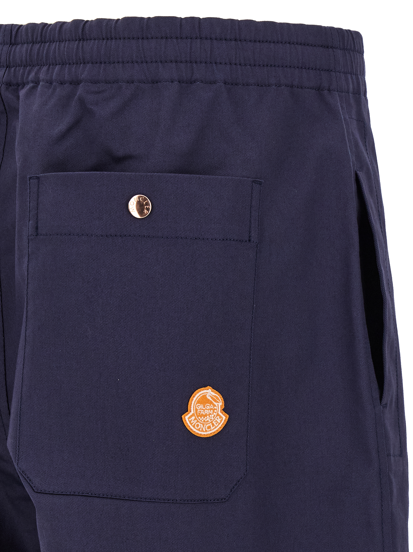 Штани Moncler x Gilga Farm від Дональда Гловера з бавовняної суміші, фетровий логотип на спині, широкі та прямі штанини, регульований еластичний шнурок на талії, застібка на блискавці та кнопці спереду, кишені, шнурок на щиколотках.