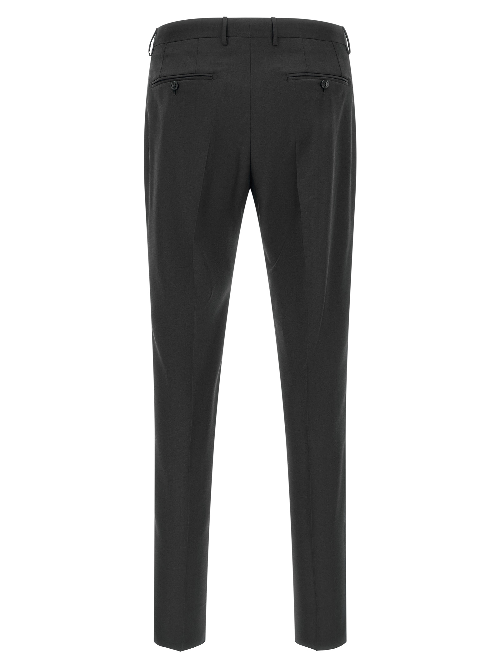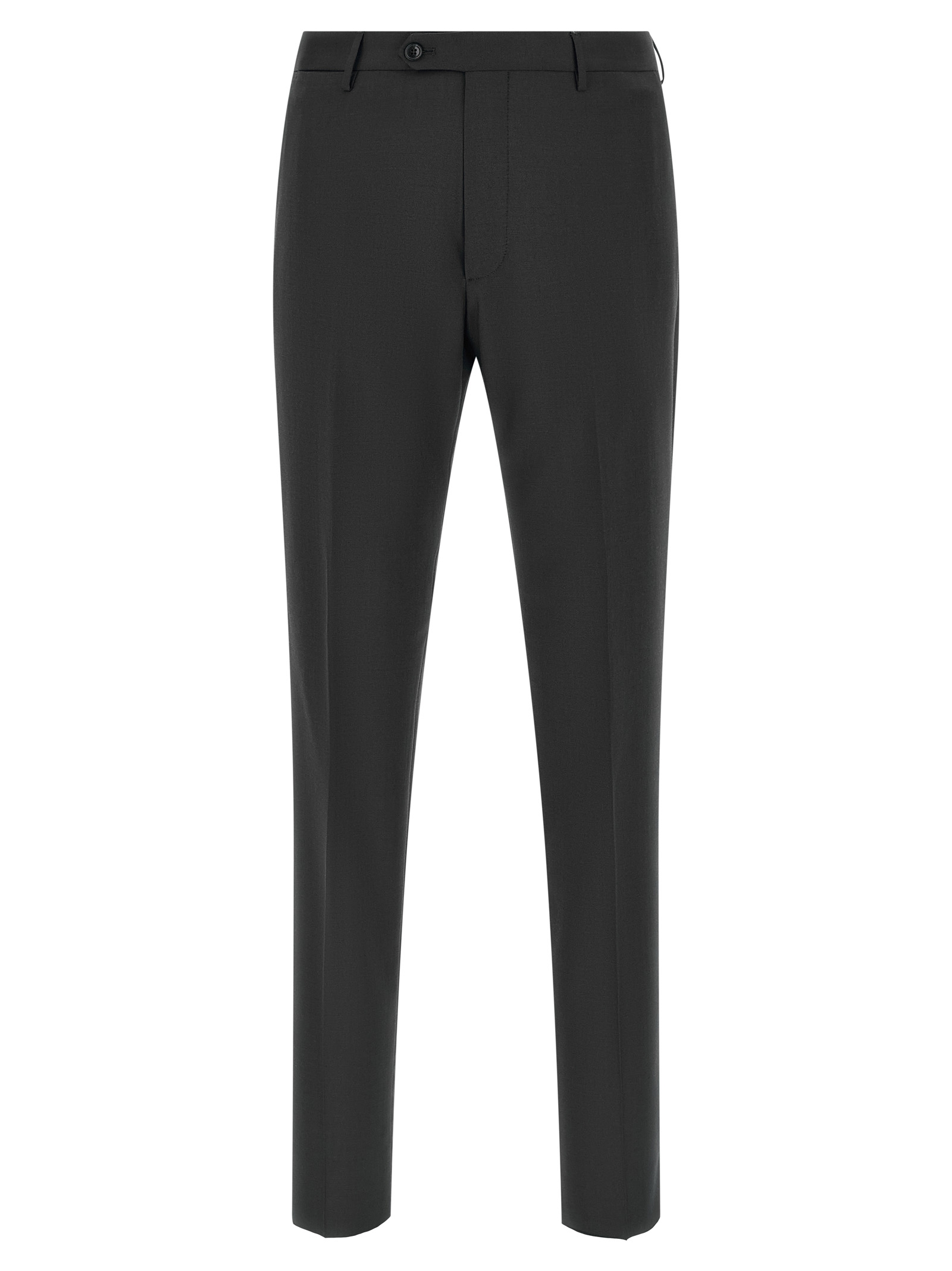 'Montecarlo' сукня з меланжевої вовни Super 110's virgin wool, що складається з однобортного деконструйованого піджака зі застібкою на рогові ґудзики спереду, лацкани із знімною металевою брошкою, нагрудною кишенею, клапанними кишенями, напівпідкладкою з купро, трьома внутрішніми кишенями, манжетами з петлями, розрізами на спинці та штанів зі складкою, передніми 'americane' кишенями, задніми кишенями, застібкою на блискавку і ґудзик, бавовняною підкладкою, низ штанин підлягає обробці.