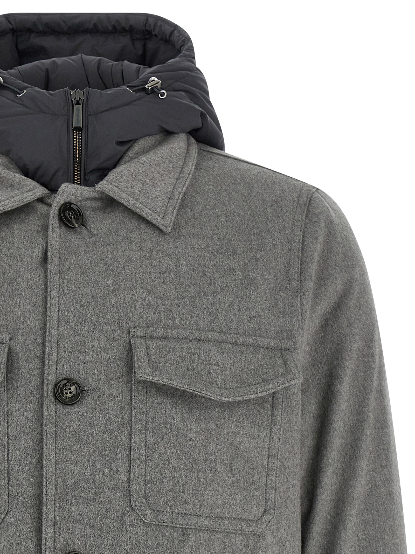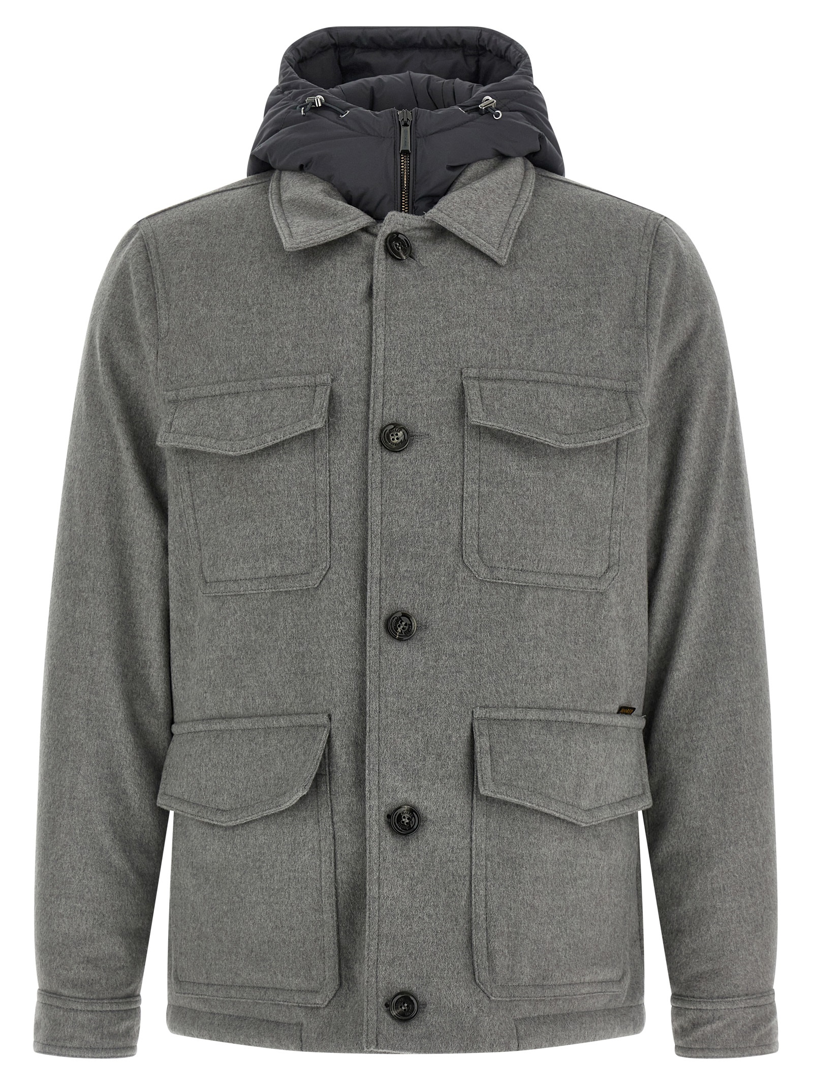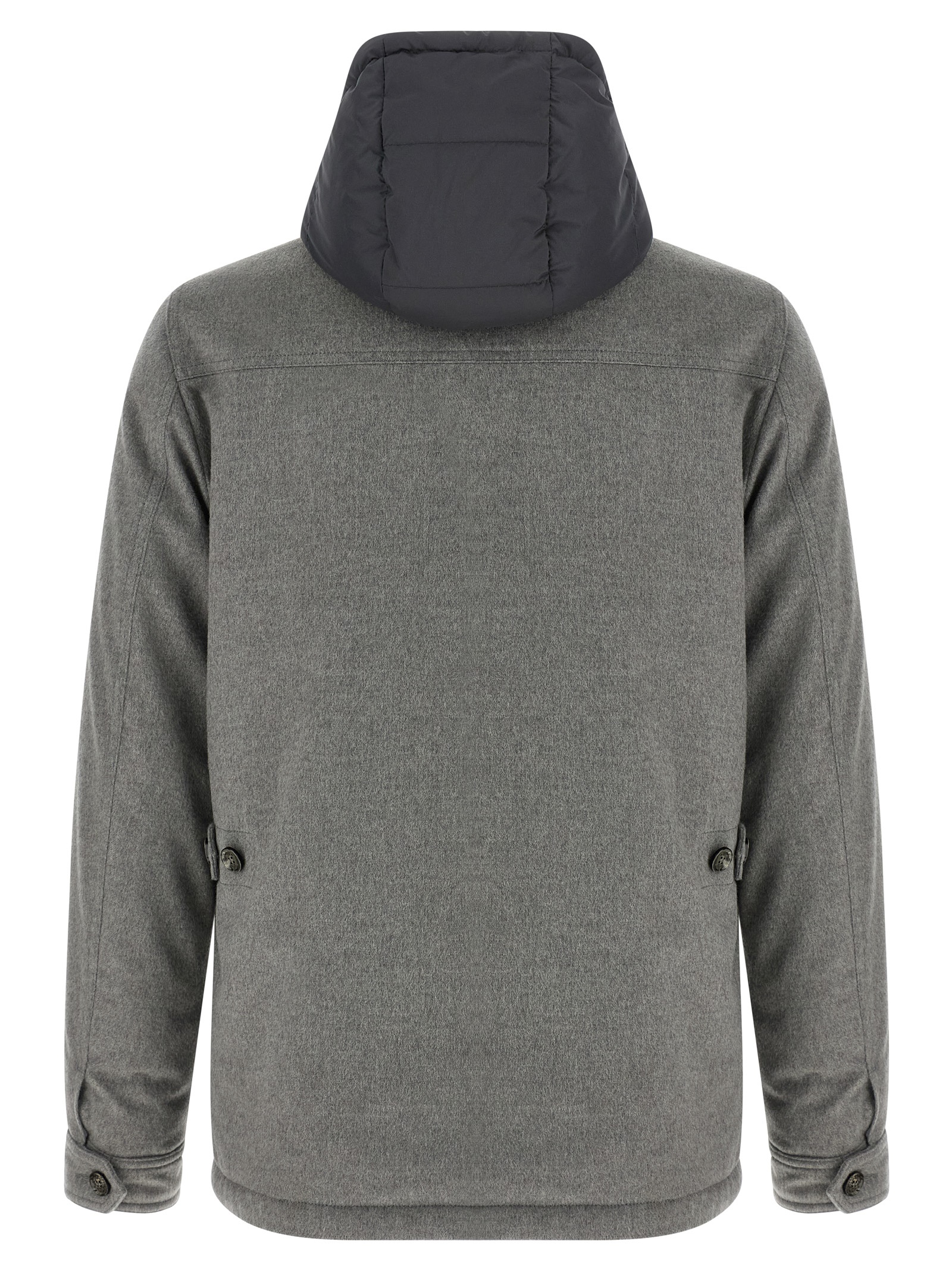 'Monti' куртка з вовни та кашеміру, нейлонова підкладка та знімний передній капюшон з регульованою стеганою підкладкою, утеплення з гусячого пуху, комір-рубашка, передня застібка на блискавці та гудзика, кишені, довгі рукава.