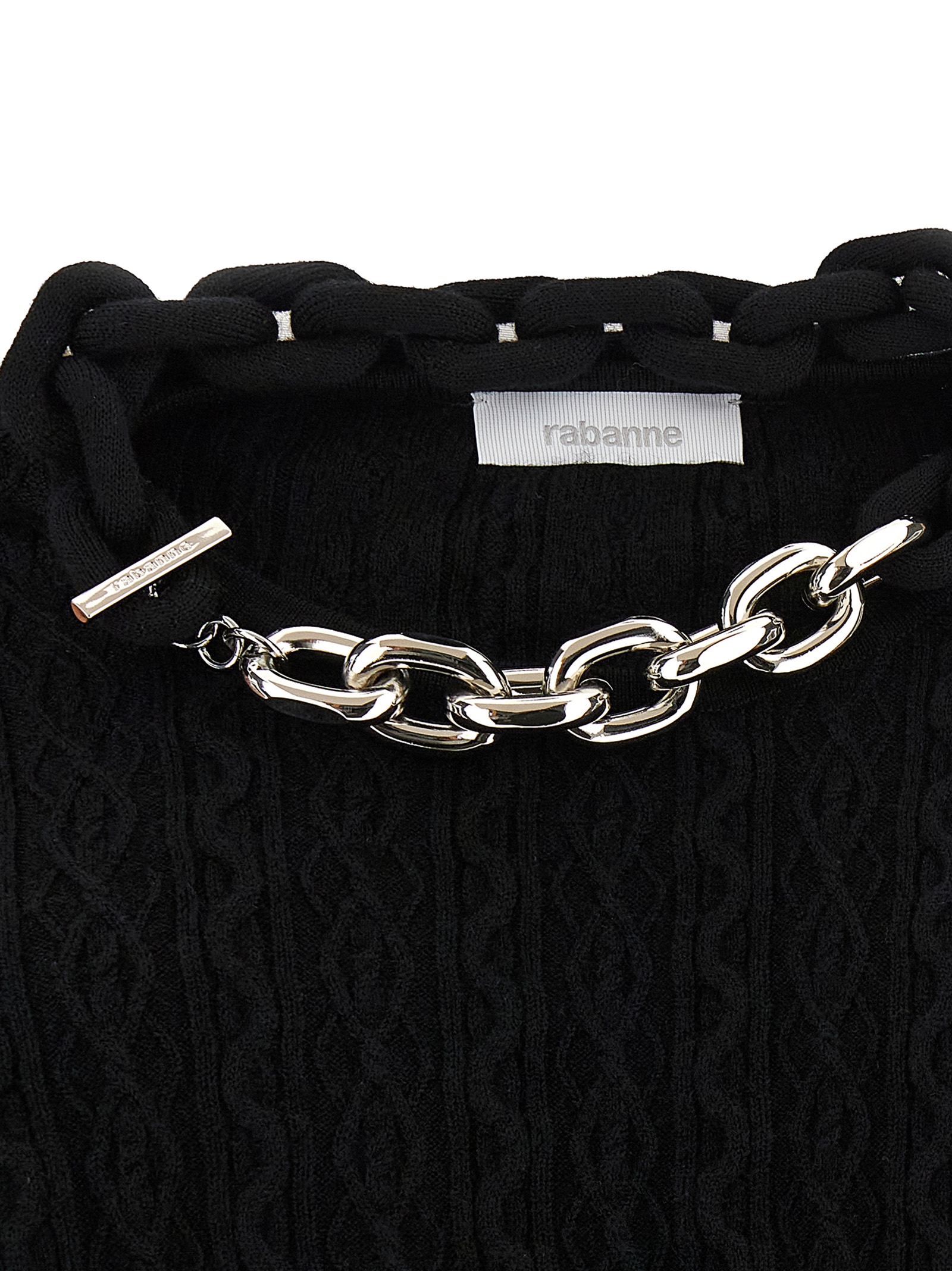 Рибана з вовни та кашеміру, круглий виріз з металевим елементом кольє, довгі рукави.