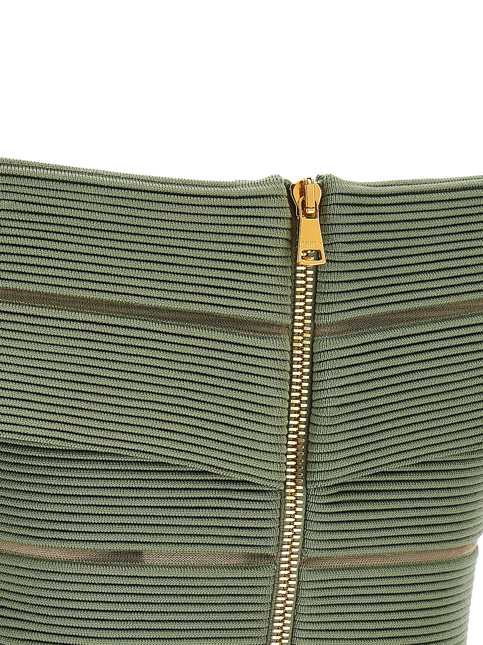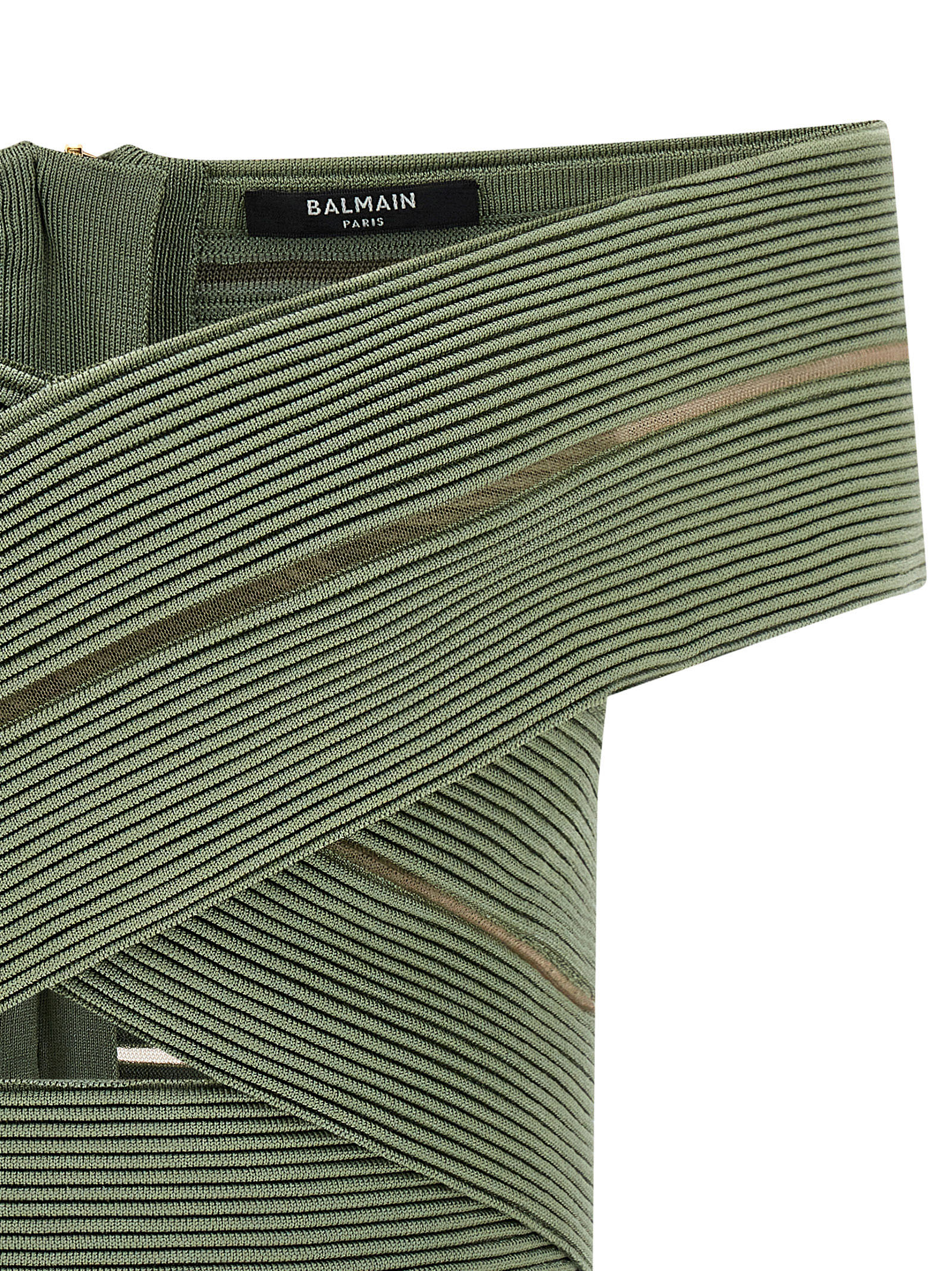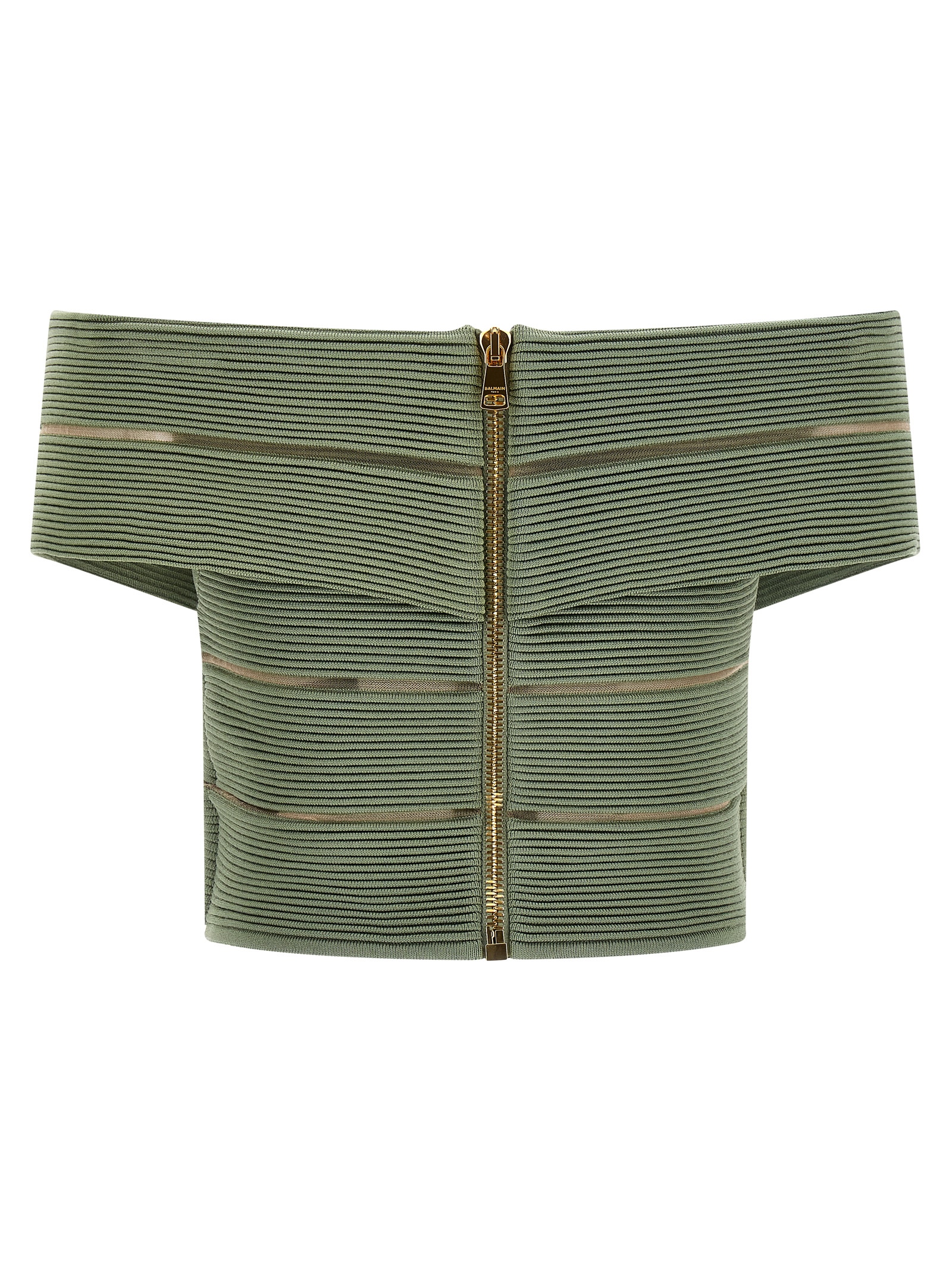 Топ зі стретч-віскози з прозорими вставками з сітки, модель кроп з відкритими плечима, верхній та нижній передній V‑виріз з X‑вставкою, застібка на блискавку ззаду.