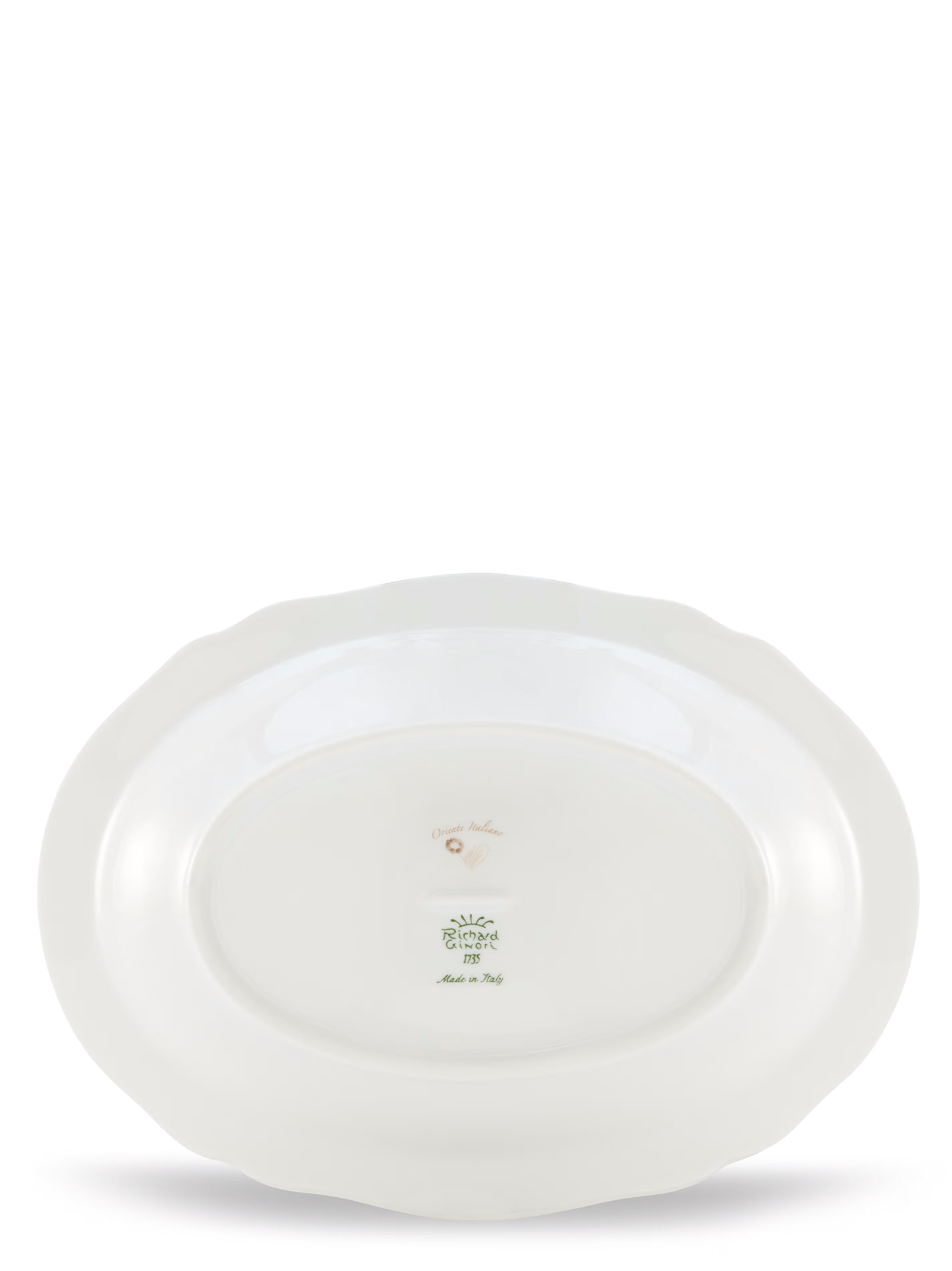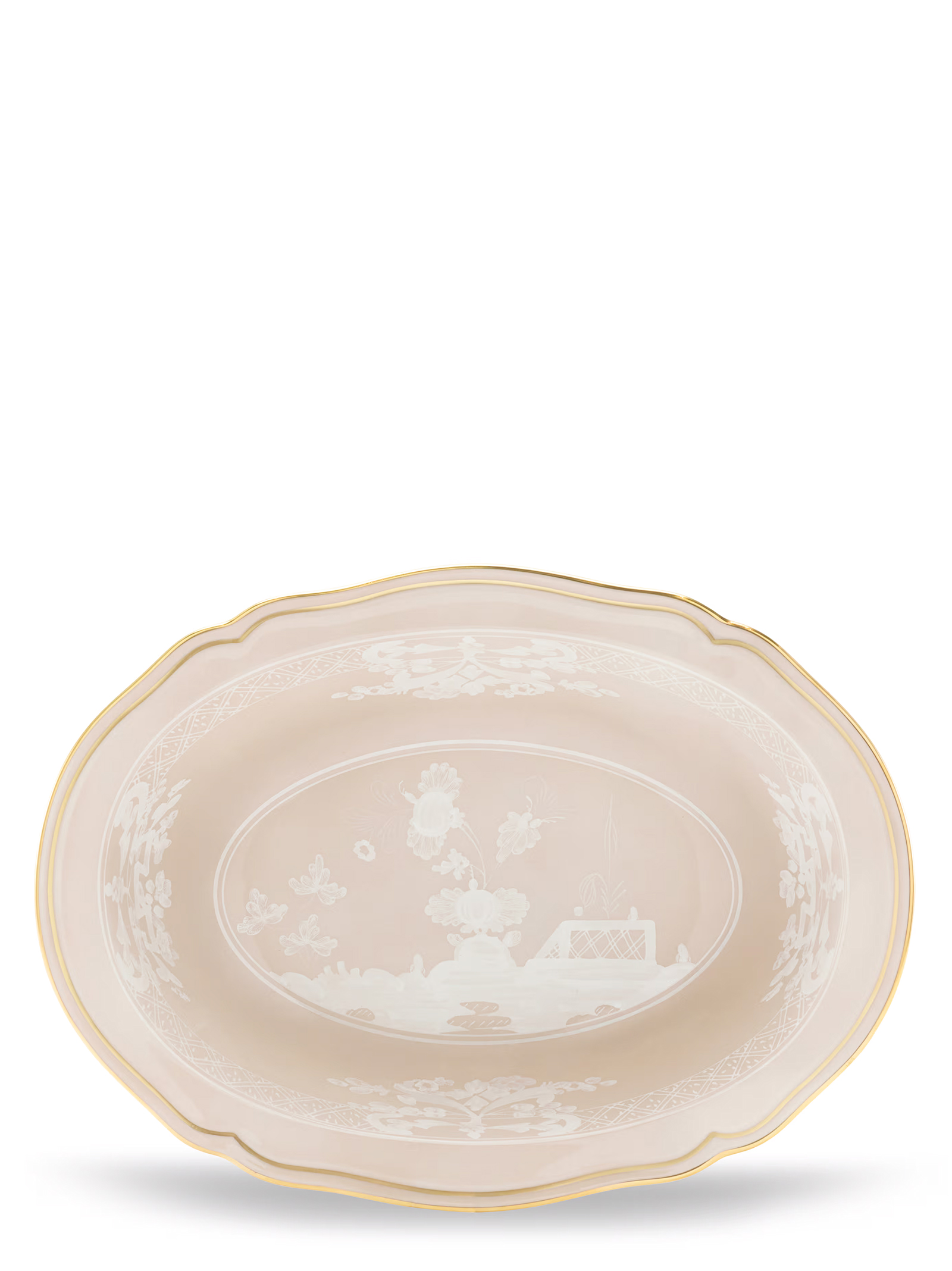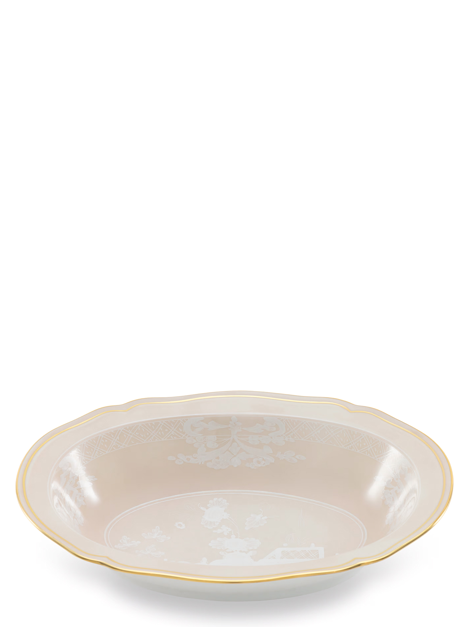Овальна чаша з декором бежевого кольору Meringa і золотим обрамленням. Колекція ‘Oriente Italiano’, форма ‘Antico Doccia’ з іконічним мотивом “гвоздики”. Не підходить для використання в мікрохвильовій печі. Безпечна для миття в посудомийній машині на делікатному циклі.